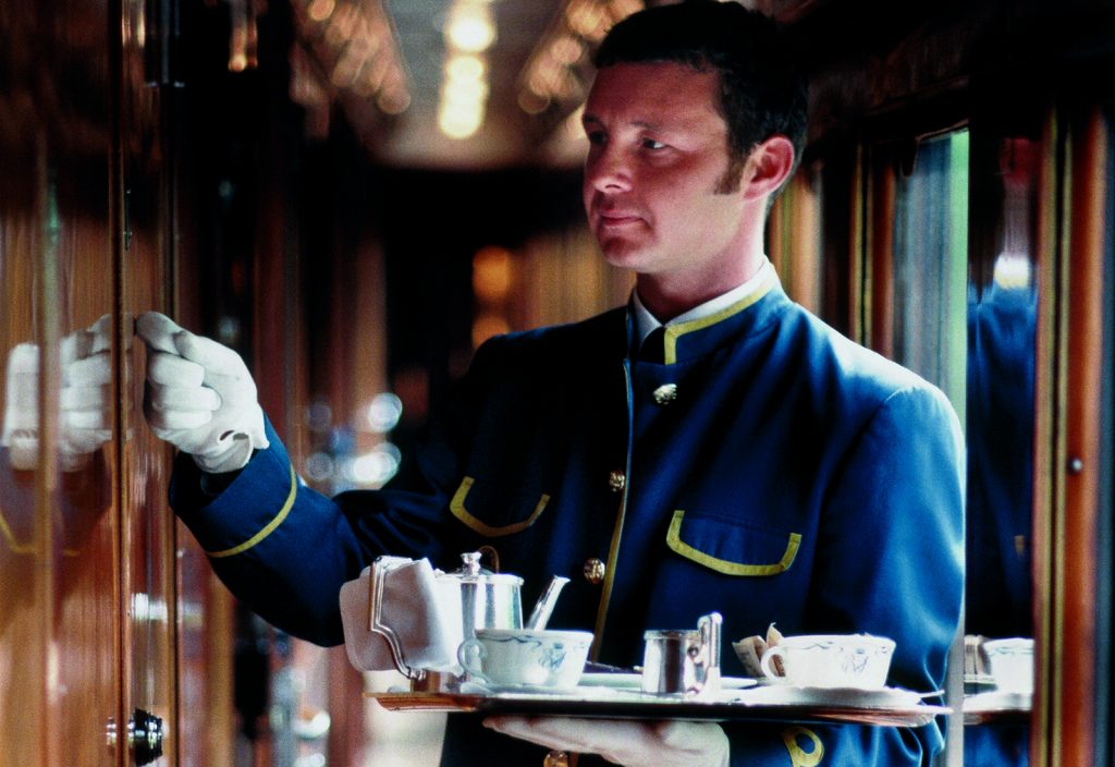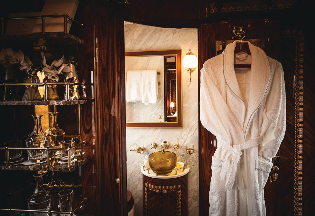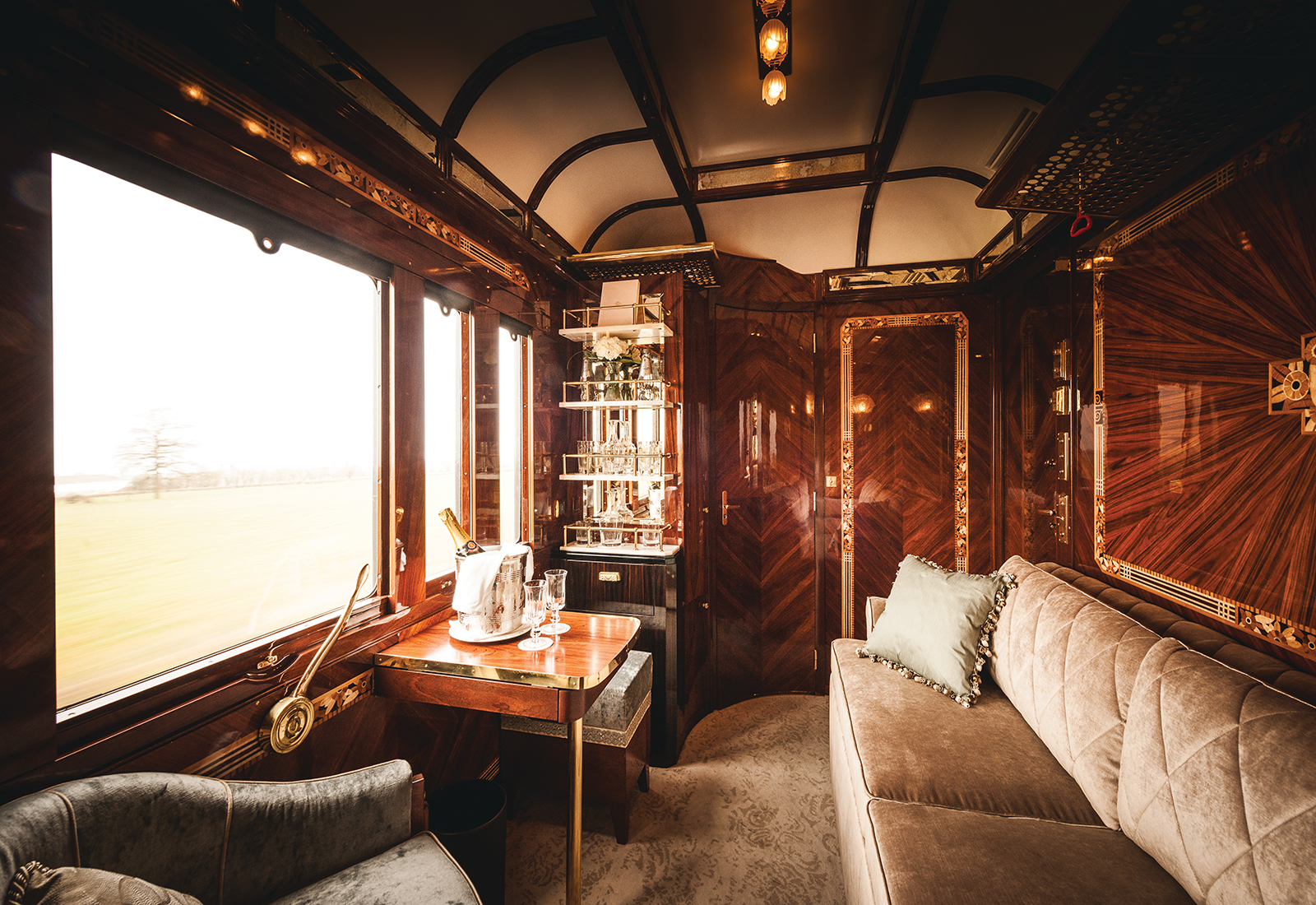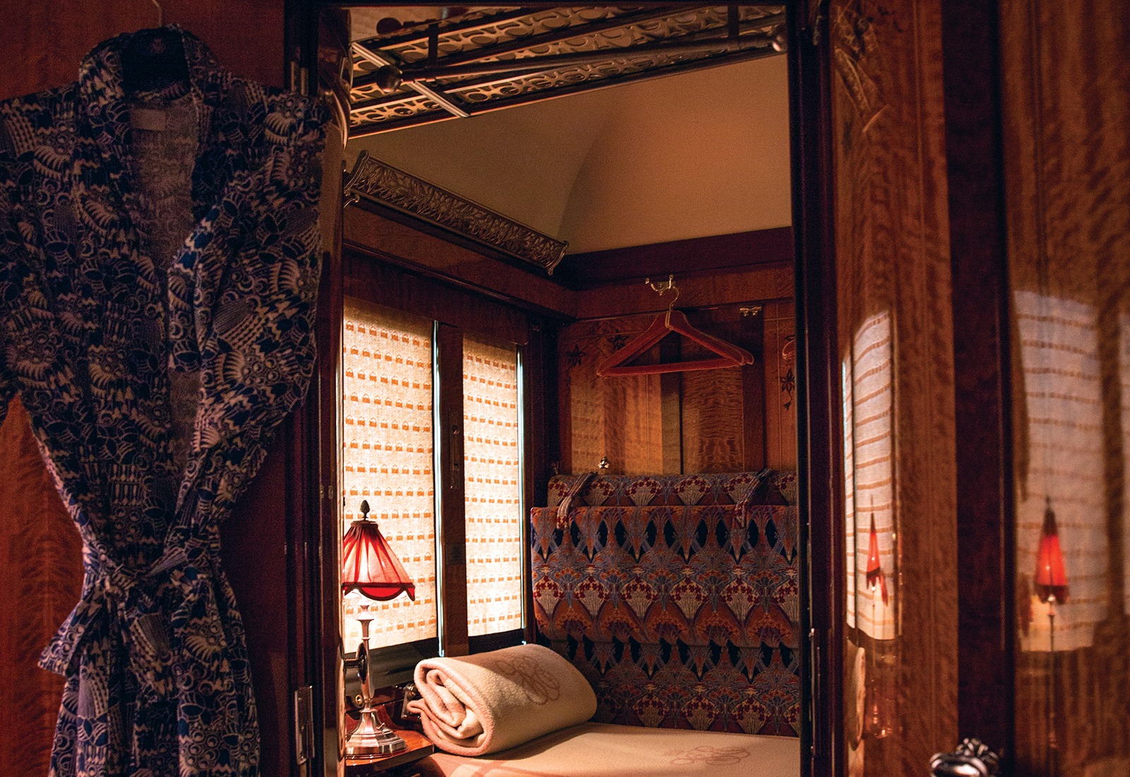 Här talar vi boaserat ädelträ, mässingsdetaljer, klassiska mönster, bekvämlighet; ett högst civiliserat sätt att resa och bo. Rinnande vatten finns i din kupé, dusch och toalett i varje vagn. Din butler finns alltid nära nog att uppfylla dina önskningar; kanske ett glas champagne från barvagnen?