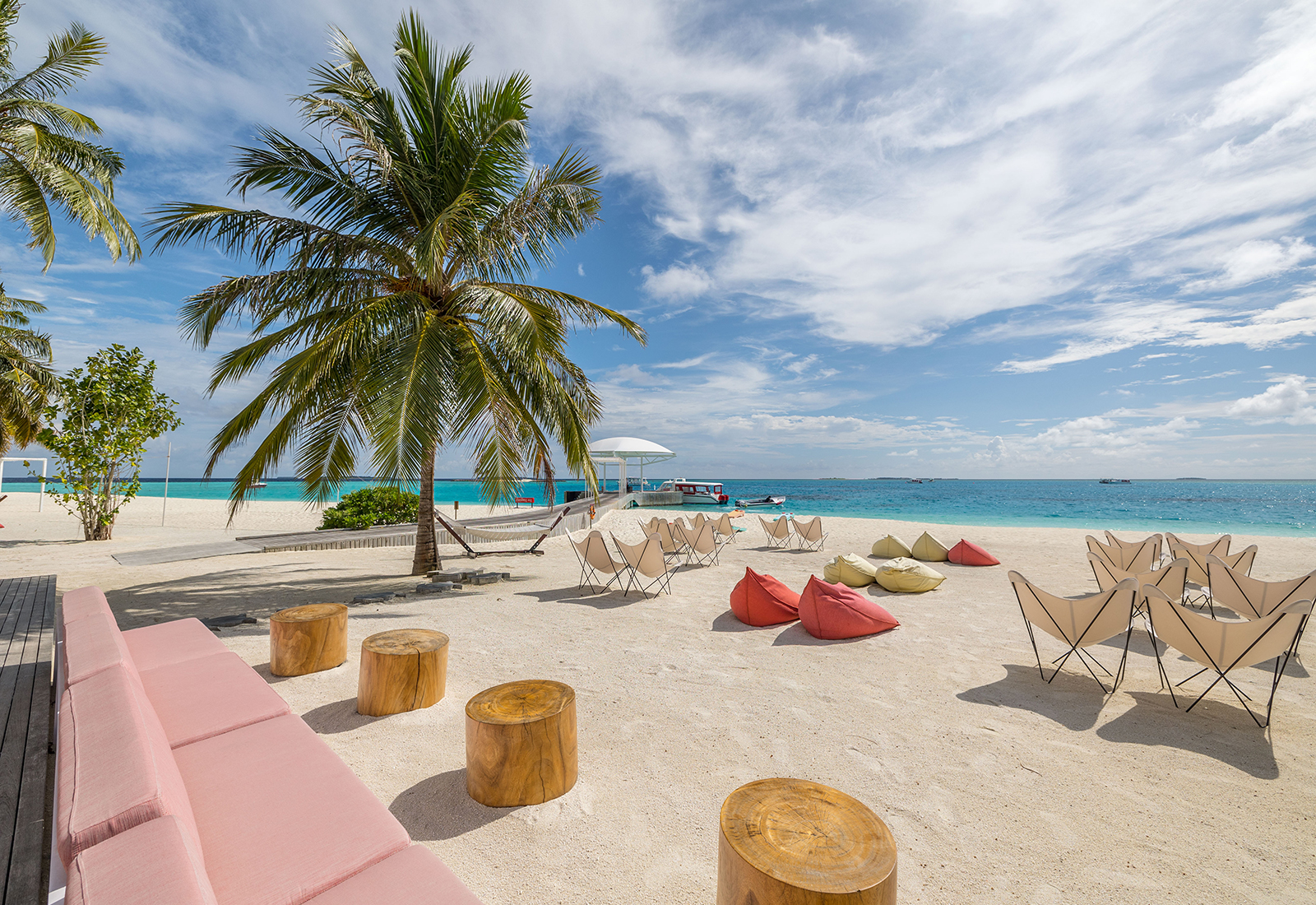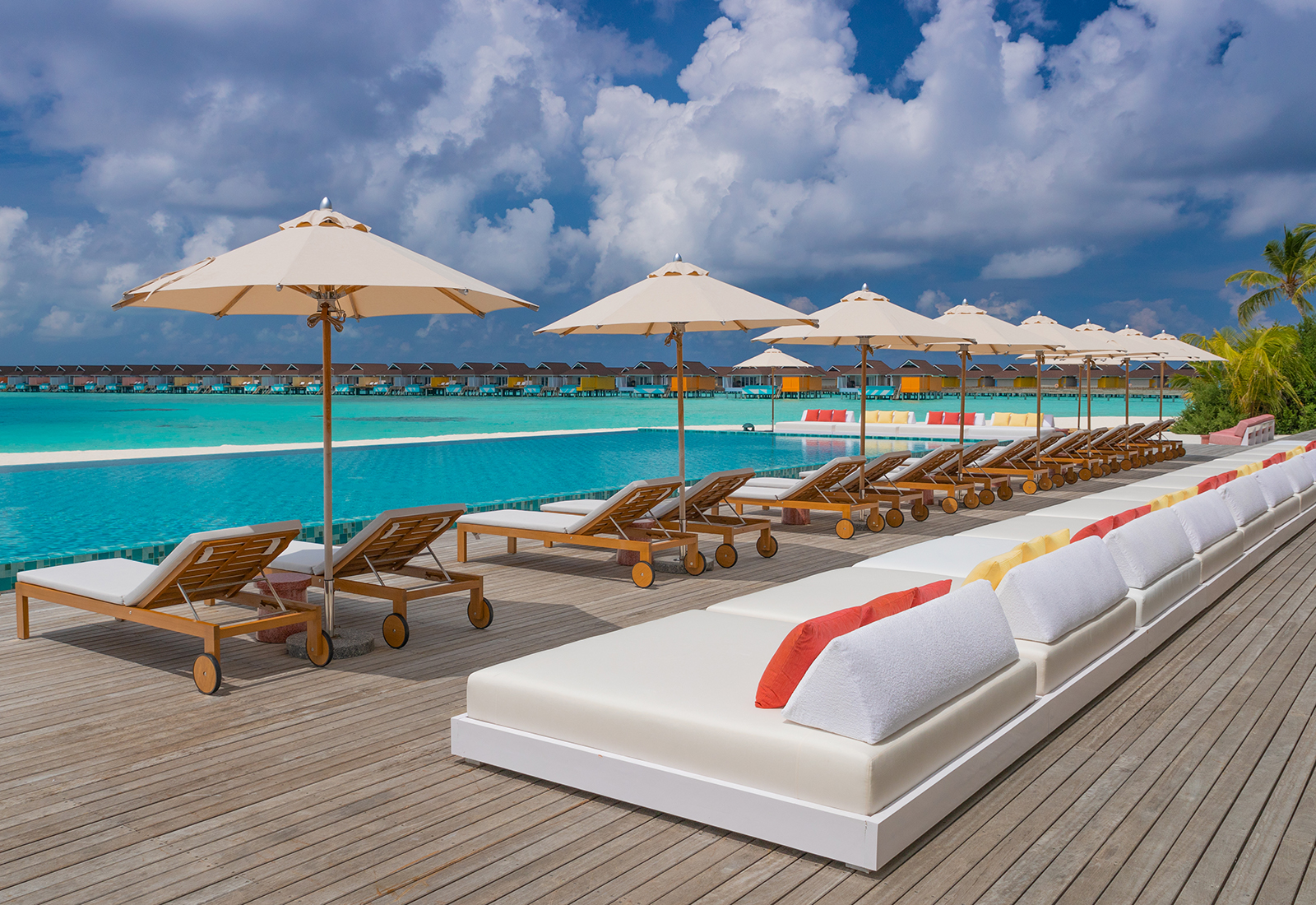 Poppig är kanske det närmaste sättet att beskriva inredningen i den strand- eller vattenvilla som väntar på den. Men såklart femstjärnigt poppigt med privat pool som standard, eget soldäck, kingsizesäng, badrum med discoboll i taket (!) och egen aktivitetsvägg där du hittar snorkelutrustning och badleksaker. Två vuxna och två barn får plats i alla villor. Är ni fler, finns härliga familjevillor.
