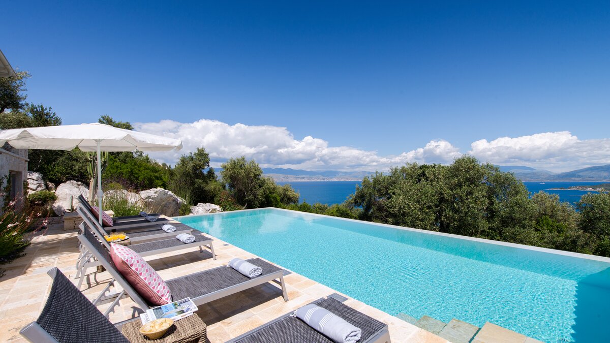 Denna lyxvilla på Korfu ligger på en kulle med utsikt över Kalamaki-bukten, avskilt i stora anlagda trädgårdar, med strålande utsikt över havet från alla rum och från möblerade terrasser.