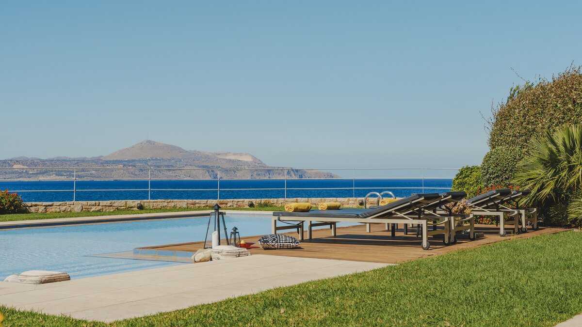 Med salig utsikt över bukten från den exceptionella poolterrassen, och från nästan alla rum i huset, ligger denna lyxvilla på Kreta ovanför vattnet, en mycket kort promenad från stranden