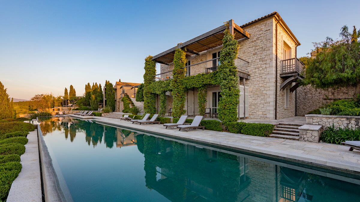 Detta är en verkligt anmärkningsvärd villa i alla avseenden, den mest uppenbara är en fyrtio meter lång infinitypool, med sitt underbara lusthus i ena änden och salig utsikt över bukten nedanför. Utmärkt utformad för fritid och lyx, består den stenbyggda villan av tre paviljongliknande byggnader, var och en med utsikt över havet och fastlandet bortom. Alla är omgivna av väldoftande örtträdgårdar och expansiva terrasser, stilfullt möblerade för uteservering och avslappning, och stigar leder ner till två stenstränder och en yogaplattform över vattnet.