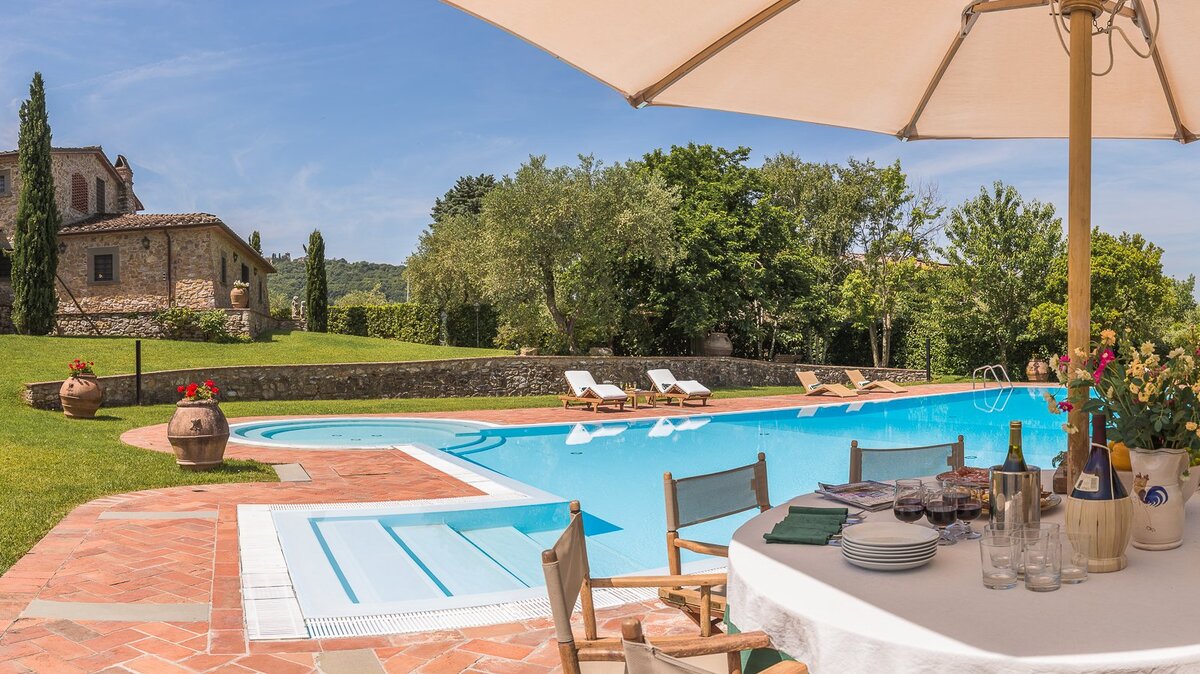 Denna typiskt toskanska 1700-talsvilla är ett lyxigt tillskott till de böljande kullarna i Valdinevole. Beläget nära den historiska gamla staden Monsummano Alto, är detta ursprungliga bondgårdskomplex nu en elegant period reträtt. Medan moderna bekvämligheter kompletterar den gamla lantliga stilen, ligger dess charm främst i dess klassiska detaljer. Ytterväggarna är gjorda av lokal sten och genomgående dekorerar originalföremål och antika möbler varje vägg, golv och rum. Det stora öppna köket är en traditionell toskansk pärla med en fungerande öppen spis, gammaldags ugn och till och med ett handfat som är mer än 250 år gammalt. Gå genom vackra antika dörrar för att hitta det rymliga vardagsrummet och matsalen – en uppsättning av 10 florentinska stolar från 1600-talet ger den perfekta middagsinställningen. På övervåningen blandar alla sovrum underbara vyer med en gammal interiör karaktär. Det stora sovrummet har eget badrum med ett turkiskt bad, medan det intill finns ytterligare ett rymligt dubbel- och tvåbäddsrum. Dessa delar ett badrum som kommer med sitt eget jacuzzi-badkar. Utanför, en stor terrass med öppen planlösning gör lata soldagar enkla – det finns en grill som är bra för uteservering, och en extremt stor pool och däck som ger en modern touch med sitt poolhus och utomhusduschar.