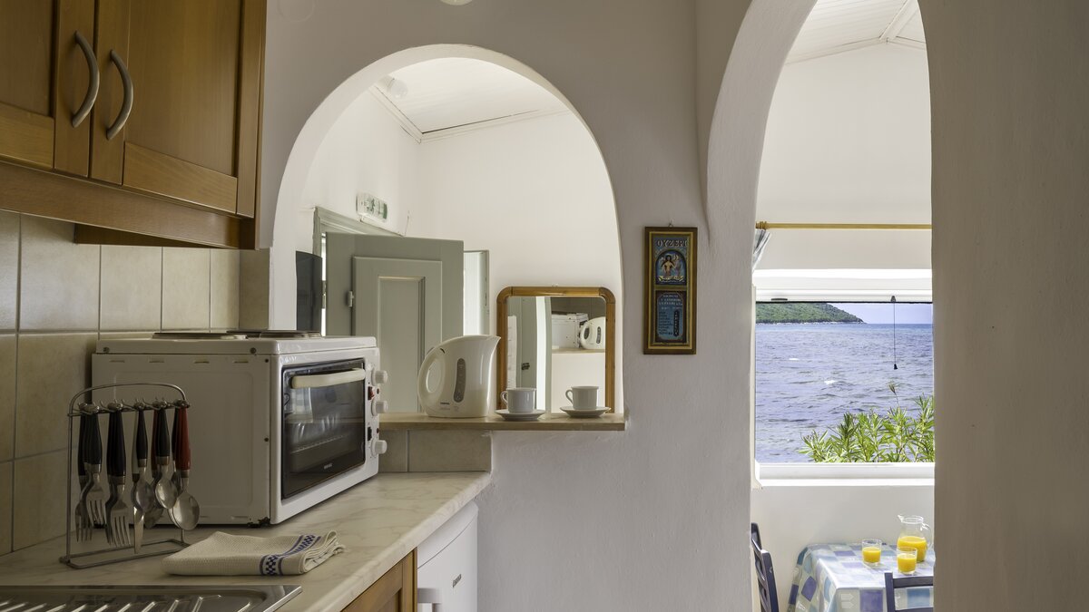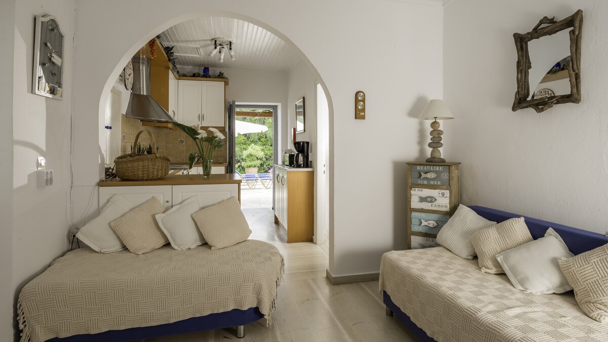 Poised just above the waterline at the south-eastern end of Apraos Bay, the Studio is so close to the sea it looks almost like a boathouse. A beautiful spot for two people, its sunbathing terrace juts into the water, and a few steps away is Kalamaki’s long beach. Here, the sand is a perfect playground for children, and a beach bar and taverna are strategically placed for leisurely lunches and long iced coolers. These can, of course, be accessed in a more conventional way, but the road route is less fun!