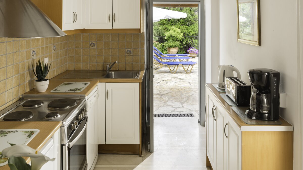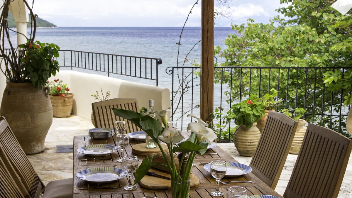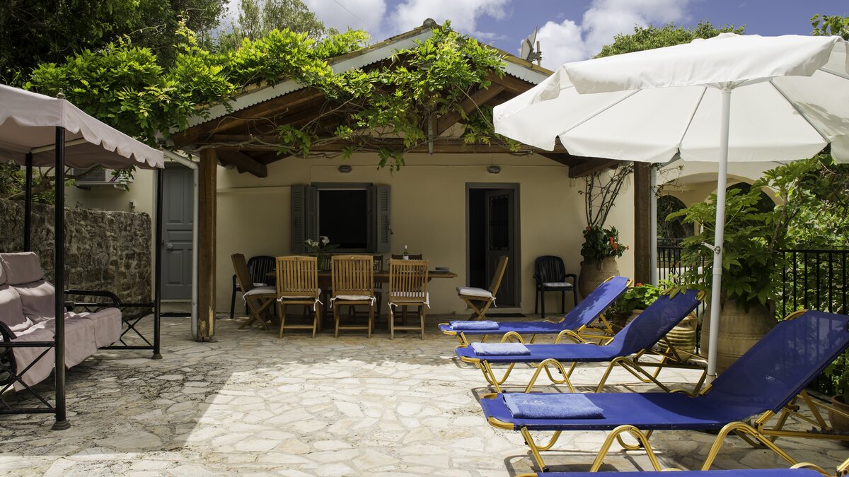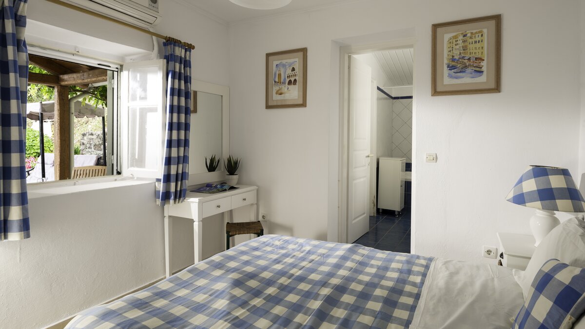 Perched on the rocks above the studio, Apraos House looks out to sea from twenty five steps up. A covered veranda is comfortably furnished as an al fresco sitting room, complemented by a sunny dining terrace, and within the house a style of island simplicity is carefully blended with contemporary facilities. With air conditioning in both buildings, the house has a well equipped kitchen and open-plan sitting room, while the studio has its own little kitchenette area.