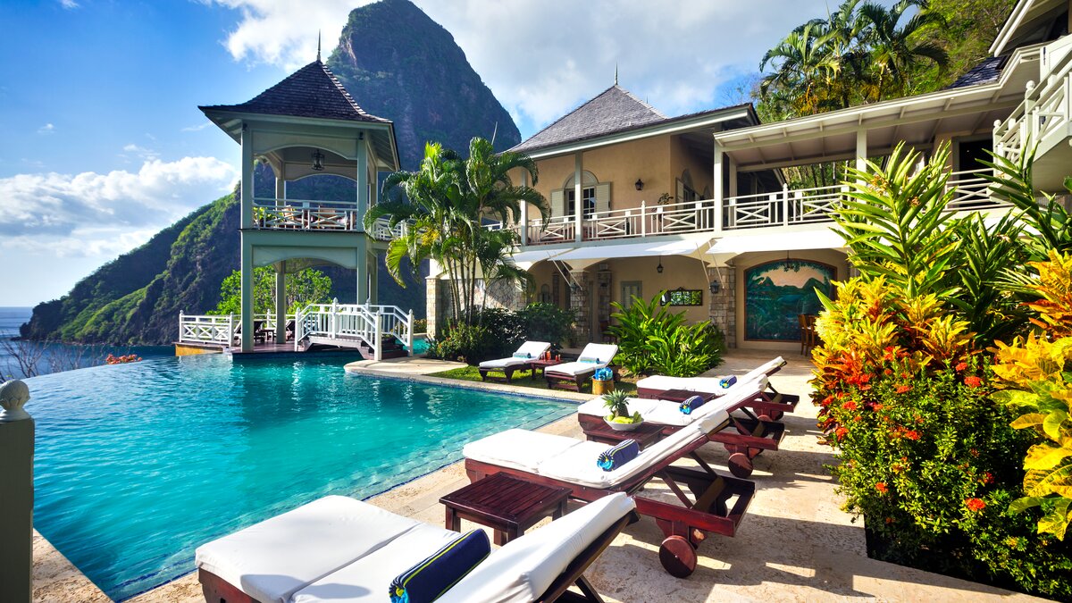 Detta vackra hus, med nästan varje rum som öppnar utåt, är perfekt utformat för sömlöst tropiskt boende inomhus/utomhus. På bottenvåningen finns ett välutrustat kök med en gångväg som leder fram till ett rymligt vardagsrum/matsal. Här öppnar franska dörrar till en balkong med mjuka sittplatser, som leder vidare till det översta lusthuset möblerat för uteservering med utsikt över poolen. På bottenvåningen finns också den exceptionella master sviten med eget badrum med jacuzzi och separat regndusch, en privat balkong med enastående utsikt över Petit Piton samt en privat pool och soldäck i ett avskilt inhägnat trädgårdsområde. Detta är verkligen en dekadent svit för ett par som firar ett speciellt tillfälle. På bottenvåningen finns ytterligare två sovrum, båda med badrum med jacuzzi och separata duschar en suite, och tillgång till en privat balkong eller uteplats. Trappor leder ner till bottenvåningen där det finns två två tvåbäddsrum med badrum med eget badrum, inklusive jacuzzibadkar och separata duschar, samt dörrar som öppnar till en terrass eller balkong. Ett familjerum avslutar bottenvåningen, som öppnar ut mot poolterrassen. Utanför omsluter den stora privata infinitypoolen ett hörn av fastigheten, ett vattenfall och skuggig naturstensgrotta som ger intresse och erbjuder skydd från solen. Det två våningar höga lusthuset och soldäcket nås av en bro över poolen, den nedre halvan är möblerad med solstolar och tillåter gäster att glida rakt ner i vattnet. Sugar Beach resort ligger bara 0,5 km bort, där du hittar ett spa, barer och restauranger och två vita sandstränder, medan Soufriere ligger bara en kort bilresa från huset.