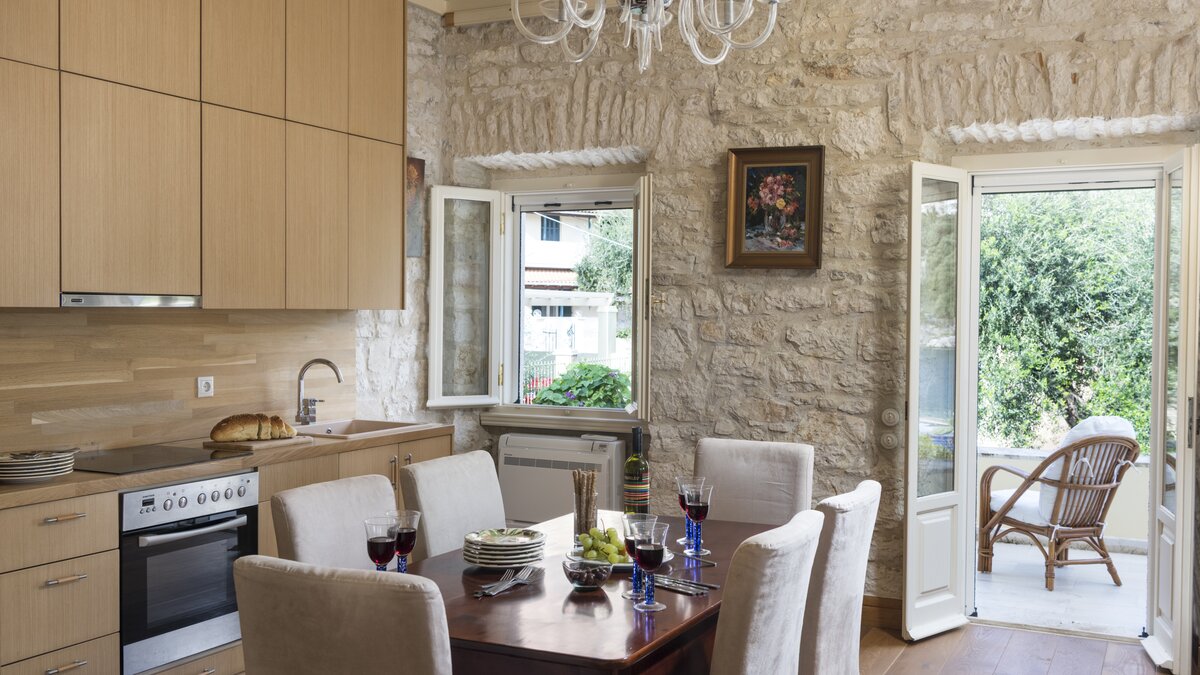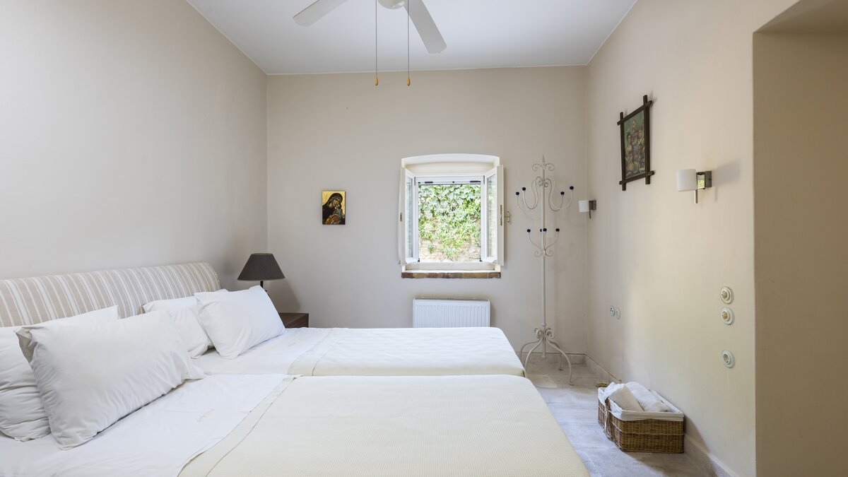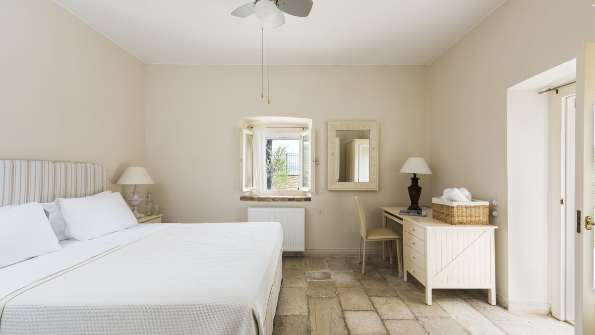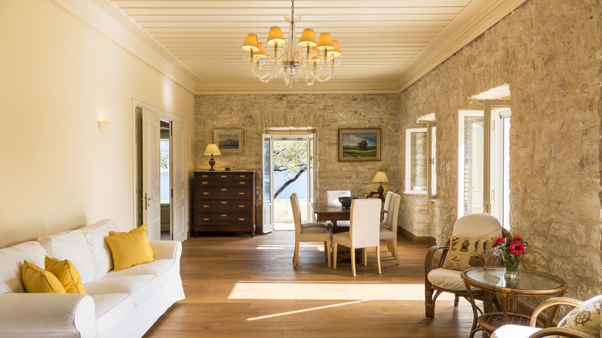Just a stone’s throw from pretty, quiet Kalami beach, this villa is in the ideal location for a large group of family or friends looking for a relaxing beach holiday. The property is a charming mix of rusticity and modern comfort, with exposed stone walls and country-style furnishings combined with contemporary neutral interiors. On the ground floor there is a well-equipped kitchen and a sunny living room opening out onto the terrace. There is also a small kitchenette with dining room and sitting area on the ground floor, and a second kitchen and two living rooms with dining space on the first floor, convenient for groups holidaying together but who require a little extra independence or flexibility.