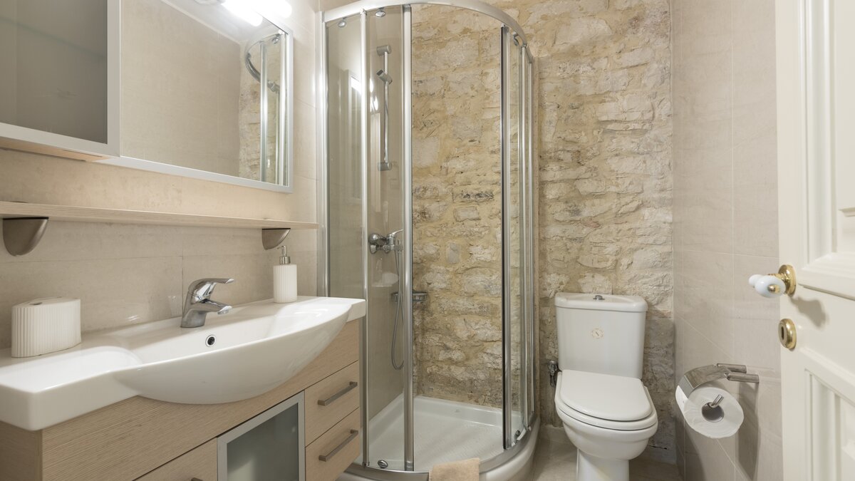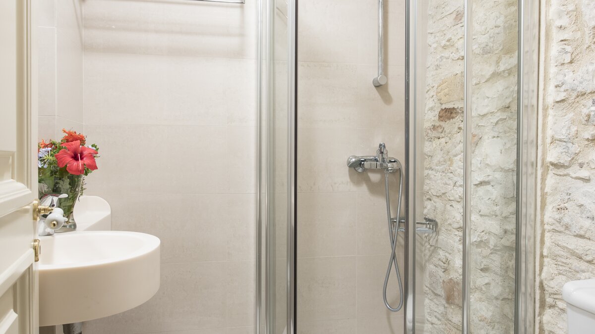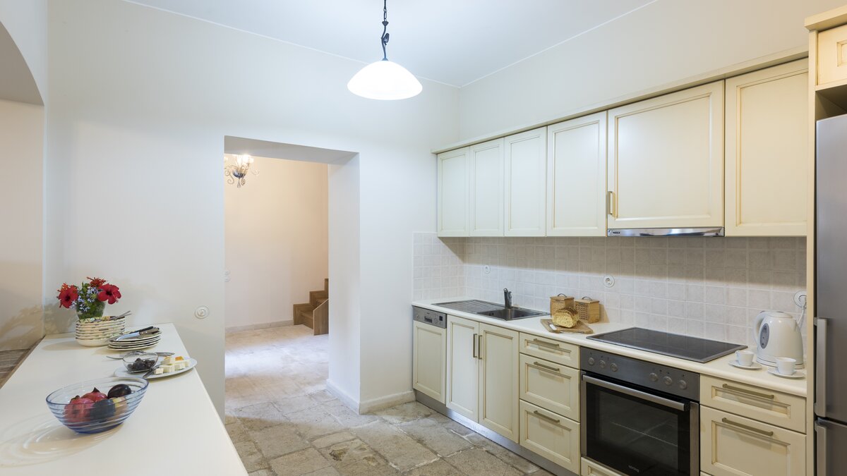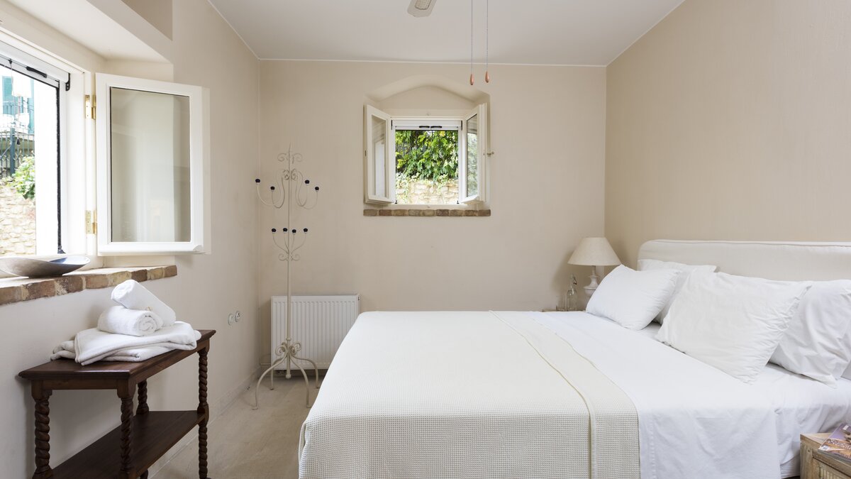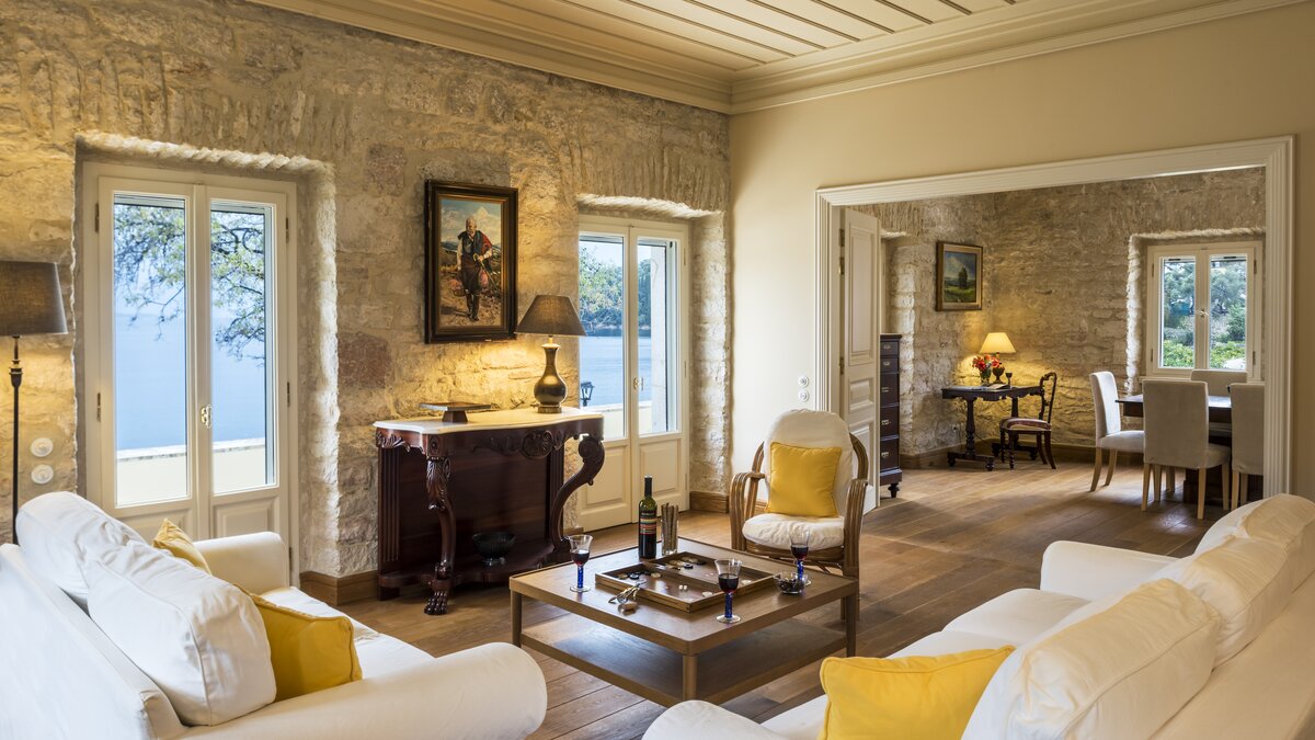 Just a stone’s throw from pretty, quiet Kalami beach, this villa is in the ideal location for a large group of family or friends looking for a relaxing beach holiday. The property is a charming mix of rusticity and modern comfort, with exposed stone walls and country-style furnishings combined with contemporary neutral interiors. On the ground floor there is a well-equipped kitchen and a sunny living room opening out onto the terrace. There is also a small kitchenette with dining room and sitting area on the ground floor, and a second kitchen and two living rooms with dining space on the first floor, convenient for groups holidaying together but who require a little extra independence or flexibility.