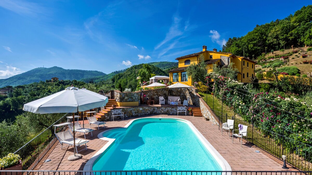 Avskilt på landsbygden bara 1,5 km från affärer och restauranger i Casalguidi och 11 km från alla bekvämligheter i historiska Pistoia, är detta vackra gula hus med fantastisk panoramautsikt slående från första början. Omgivet av olivlundar, fruktträd och delikata rosenträdgårdar, är detta en tillflyktsort som har gjorts för fullständig avskildhet. Den stora utomhuspoolen välkomnar lata dagar, med solstolar, möblerade uteplatser och överdimensionerade paraplyer, medan inuti, hänge sig åt en klassisk country-chic karaktär. Genom den stora huvudentrén är den stora, öppna loungen en fristad för avkoppling, möblerad med diskbänkvärdiga soffor och intrikata mönstrade mattor. Både enkla men sofistikerade, och några av de iögonfallande möblerna inkluderar ett gammalt träpiano och en enastående hörnspis. Genom vardagsrummet finns en angränsande matplats med skjutbara glasdörrar som leder ut till en charmig terrass med utsikt över den vackra landsbygden. Fortsätt till det stora högteknologiska köket – utrustat med alla nödvändiga mod cons – och det finns en andra mysig sittgrupp med fåtöljer och en mindre öppen spis. Efter samma rustika stil, har varje sovrum en enkel design, med subtila pastellfärgade väggar och exponerade träbjälkar. Med sovrum och vardagsrum på bottenvåningen och första våningen, är layouten idealisk för två familjer.