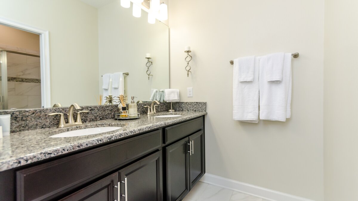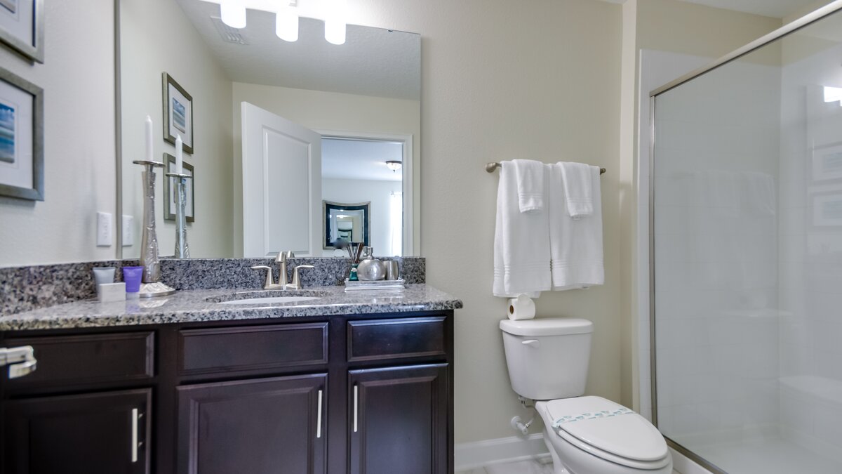 Sleeping quarters are over two floors, with a double bedroom with shower room en suite on the ground floor. Upstairs there are two double bedrooms, one with en suite shower room and one with an en suite bathroom, as well as a fourth double bedroom and two twin bedrooms sharing two bathrooms. Shops and restaurants in Davenport are just 5km from the property, while Disney World and Universal Studios Orlando are easily reached by car.
