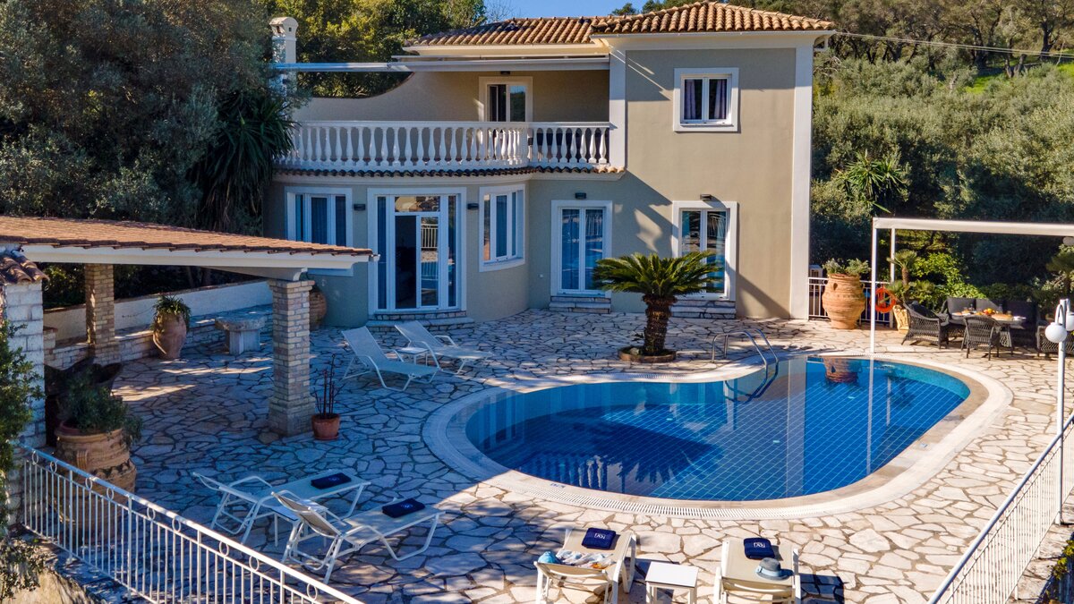 Villan har en härlig rund terrass på första våningen som bidrar till villans charm. En stenklädd poolterrass omger en bra storlek privat pool – med solstolar och en inbyggd grillplats, är detta en bra plats att bara sitta och beundra fiskebåtarna och utsikten över bukten. Bottenvåningen består huvudsakligen av ett stort öppet vardagsrum, matsal och kök, tillsammans med en dubbelsäng som har franska dörrar som öppnar ut mot poolterrassen. På övervåningen finns ytterligare två sovrum – ett annat tvåbäddsrum med eget duschrum och ett master-dubbelrum med eget badrum. Båda rummen på första våningen vetter mot en möblerad balkong som erbjuder bekväma sittplatser i loungen och fantastisk utsikt. Tavernor finns i Avlaki, bara 3,4 km bort – eller så kan du köra 6 km för att utforska butikerna och restaurangerna i Kassiopi.