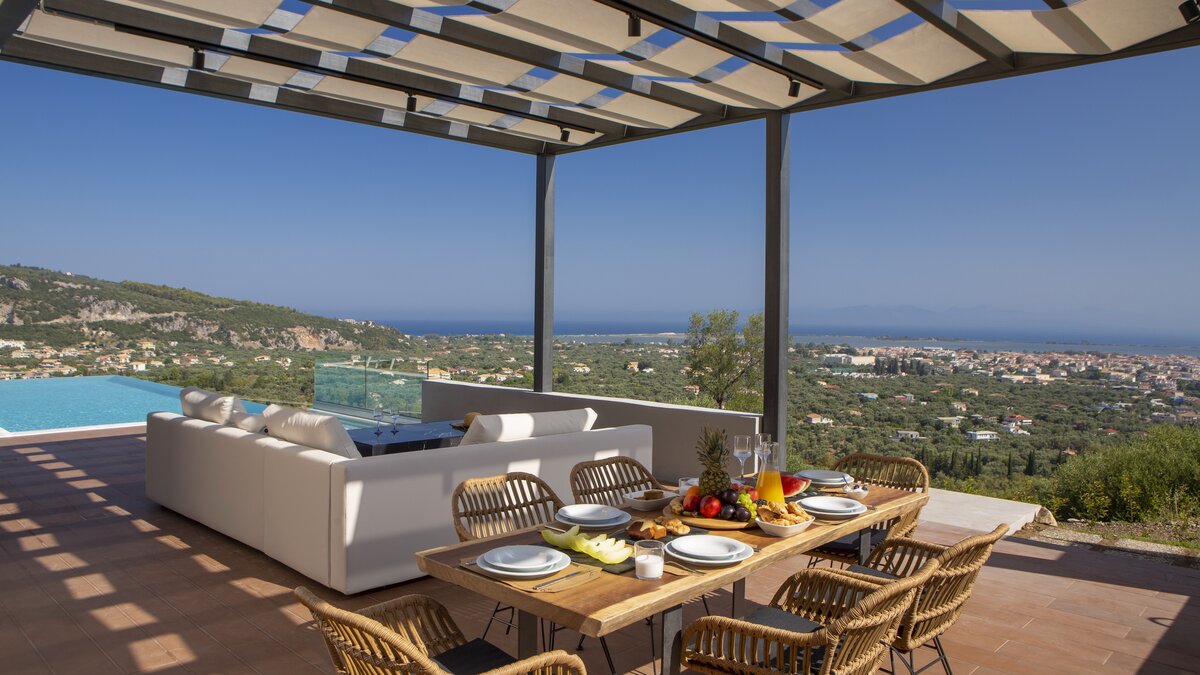Utomhusområdet på Calliope är idealiskt utformat för al fresco boende; ett matbord serveras av ett utekök och inbyggd grill bredvid ett separat område för att koppla av i skuggan. På kanten av den stora terrassen finns en mycket inbjudande saltvatten infinity pool och en separat jacuzzi (uppvärmbar på begäran), som båda har lugn utsikt över sluttningen och ner till havet. Calliope och hennes syster villa Tiana ligger i ett fantastiskt läge bara 3 km från Lefkada stad för fantastiska restauranger vid vattnet och bra shopping också.