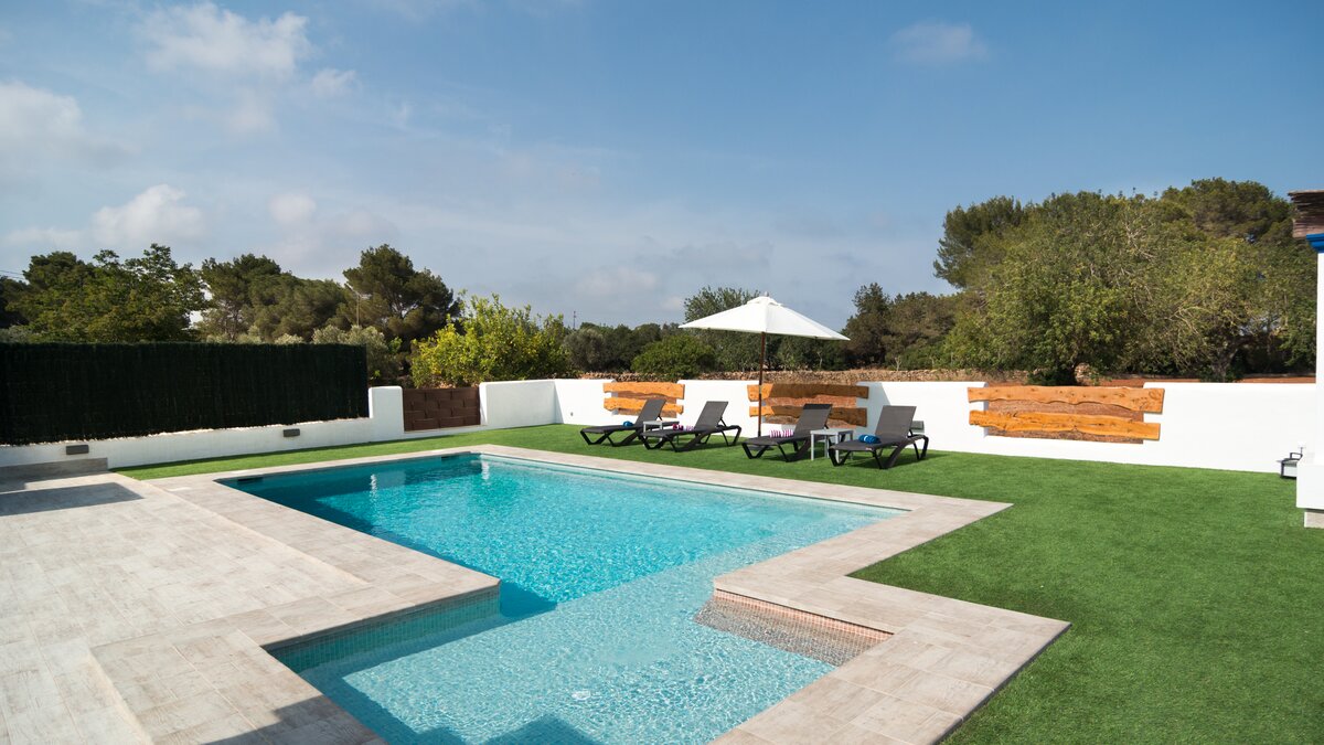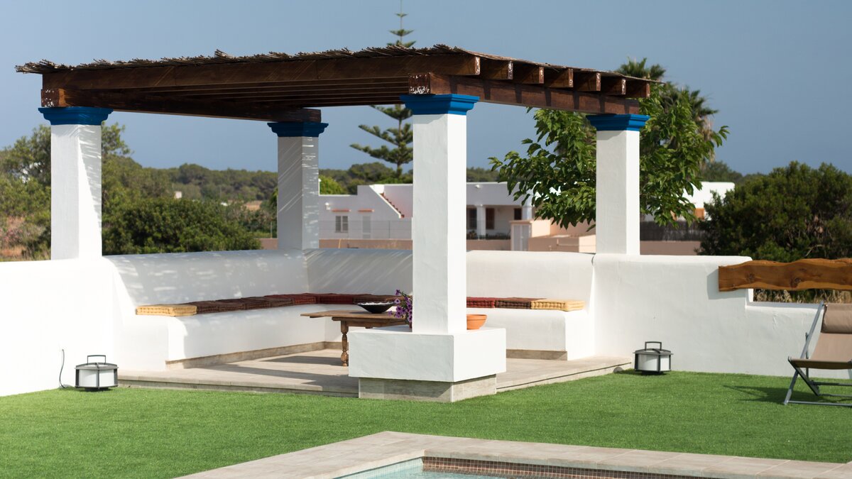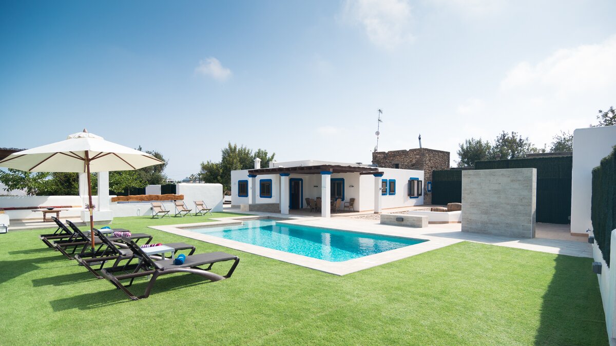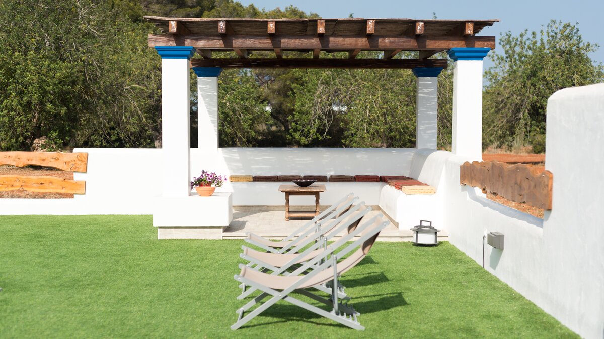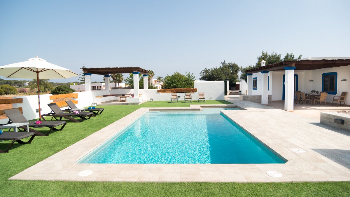 The terrace leads on to a sunny patio with a private pool surrounded by a lawned garden, and a pool pergola providing a shaded seating area with lovely countryside views. The location is excellent, the Punta Arabi market and facilities of Es Canar can be accessed from a track across the countryside. Cala Martina, a wide sandy beach with non motorwised watersports is approximately 550 m or a ten minute walk from the property. The beaches of Cala Nova and Cala Pada and the wonderful beaches of Cala Boix, Cala Mastella are a little further on.