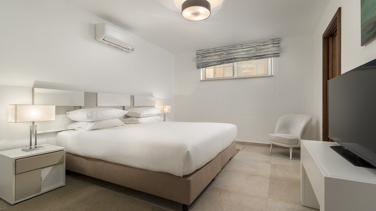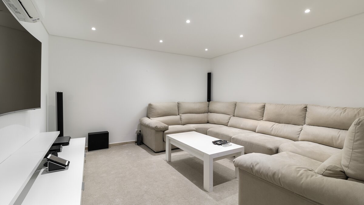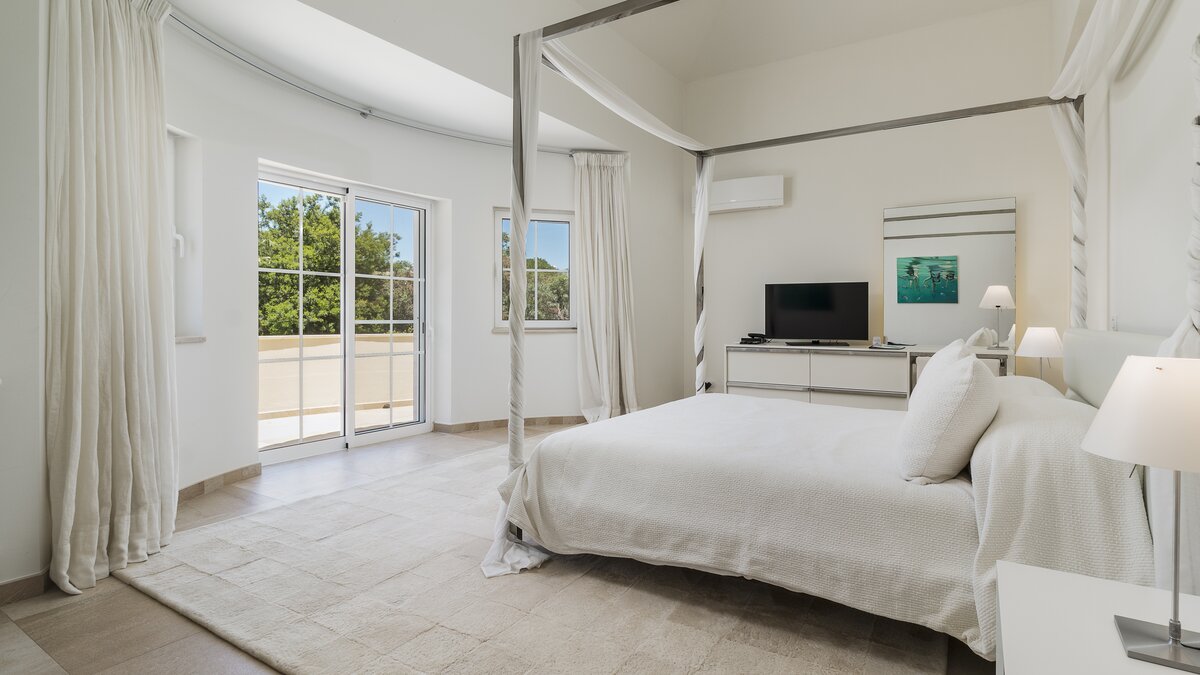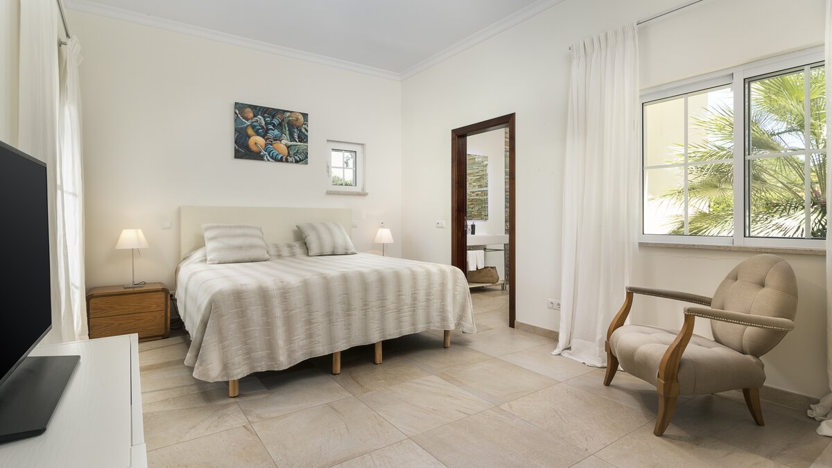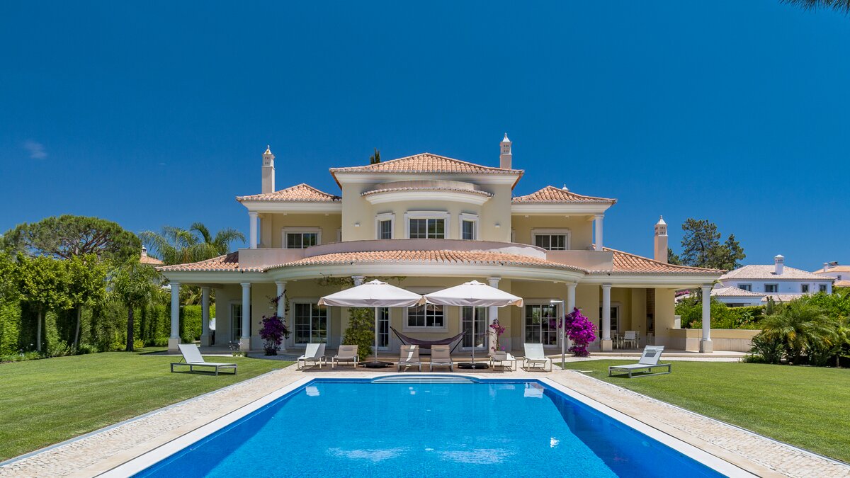 Enclosed by well-tended gardens and an exclusive heatable pool, this villa set over three levels, is elegantly styled. Characterised by its wonderful architecture and generous indoor and outdoor areas, Casa Branca opens out to the swimming pool with plenty of sun loungers, and a covered dining table for al fresco meals. Furnished in crisp white décor with an uncluttered style, the contemporary and unique interiors contrast perfectly with the traditional exterior design. The entrance hall leads to a large sitting and dining room opening up through sliding glass doors to the terraces and extensive gardens; adjacent to the living room is a well-equipped kitchen. All bedrooms in Casa Branca have bathrooms or shower rooms en suite. A double bedroom, a cloakroom, and a utility room complete the ground floor. Upstairs, all three bedrooms have access to a terrace. The master suite with walk-in wardrobes, bath and separate shower, is the main attraction of this level. Two further double bedrooms that can be made as twins make up the rest of the first floor. The lower ground floor of the property is entirely for a double bedroom and a comfortable cinema room. This villa is a short drive from the coastal town of Quarteira and a ten minutes’ drive to Vilamoura Marina with plenty of shops, restaurants, bars and cafes.