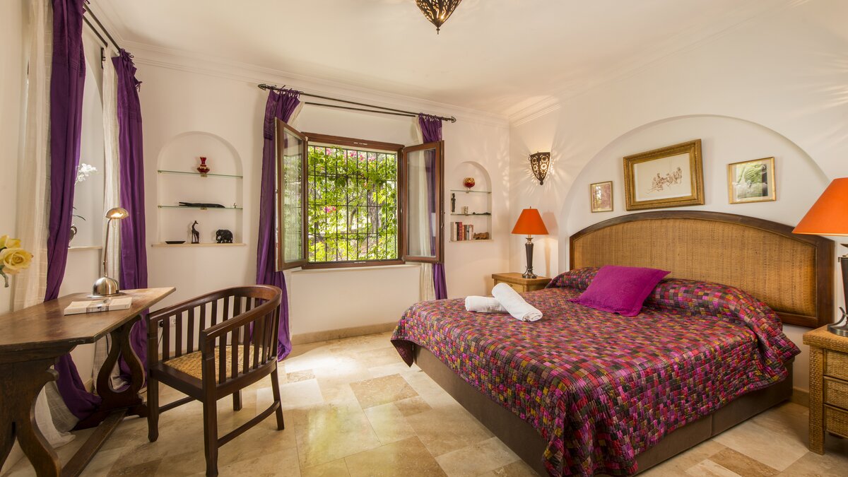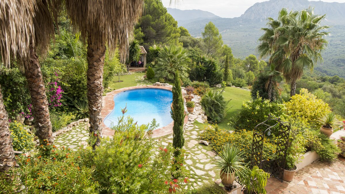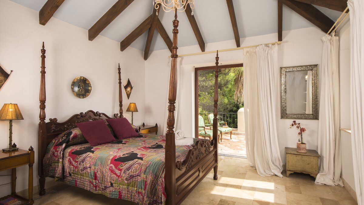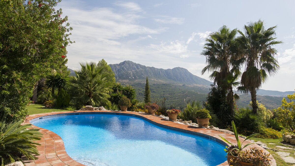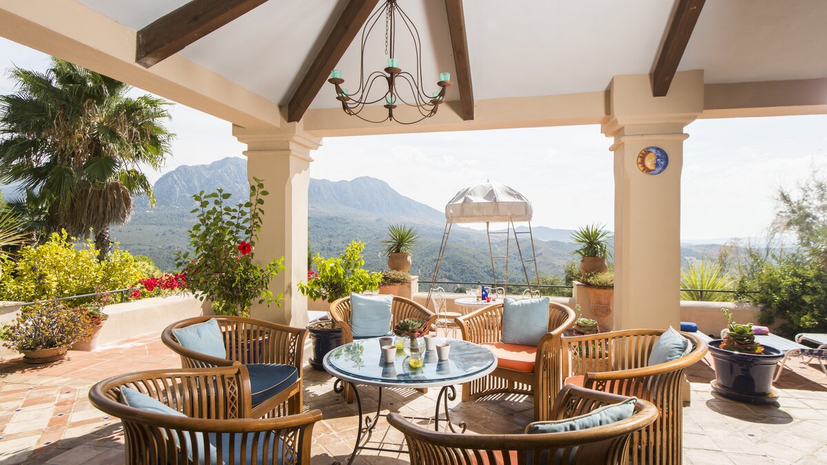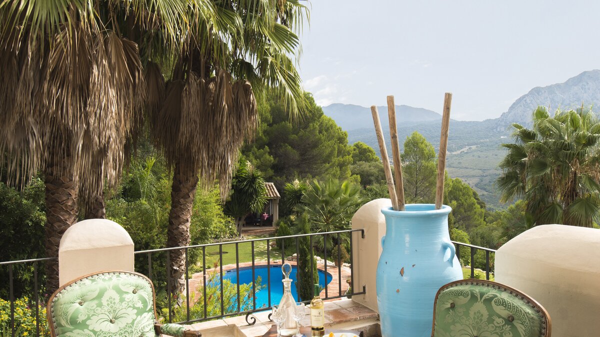 With beamed ceilings, big four-poster beds and bags of space indoors and out, this family villa oozes quality and character. Floored in polished marble, the house has a country-style kitchen, open-plan to the dining area, and a colourful sitting room complete with an open fireplace. Double doors lead to a terracotta tiled terrace, furnished for al fresco living and overlooking the peanut-shaped pool in its gated and lawned garden. And beside the heatable swimming pool, a delightful loggia has big chairs and a day bed, all piled with pink and blue cushions in a modern twist on a Moorish theme. Cook service is available to complement the very relaxing atmosphere, and the villa’s seven bedrooms are thoughtfully furnished to make flexible accommodation for families or groups of friends. Set on the hillside, 5km from Gaucin’s shops and restaurants, Casa Dana is reached via a private track off the road from the coast, where Estepona beach is a thirty minute drive away.