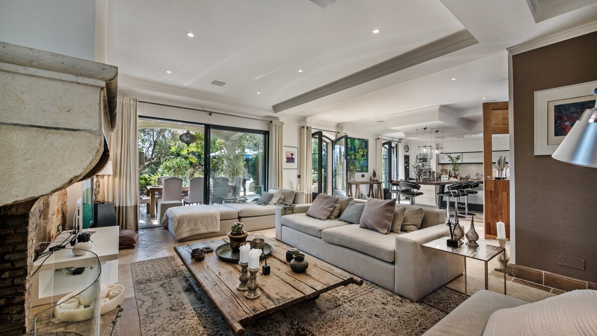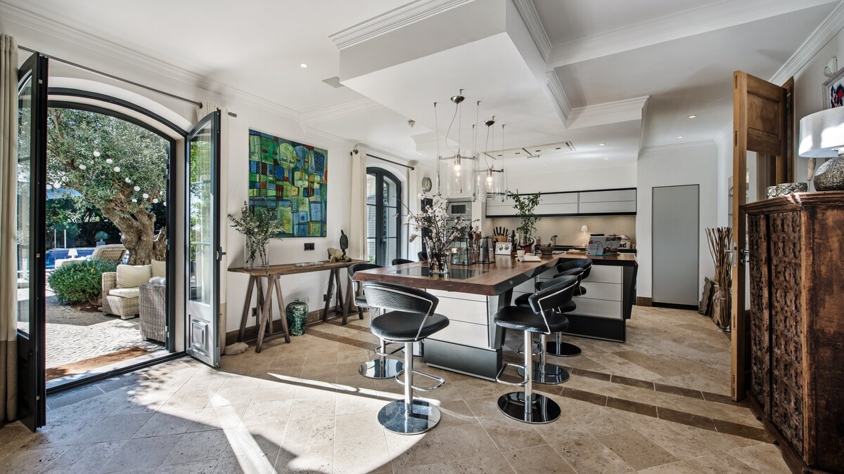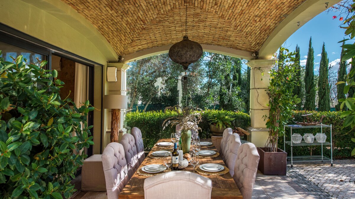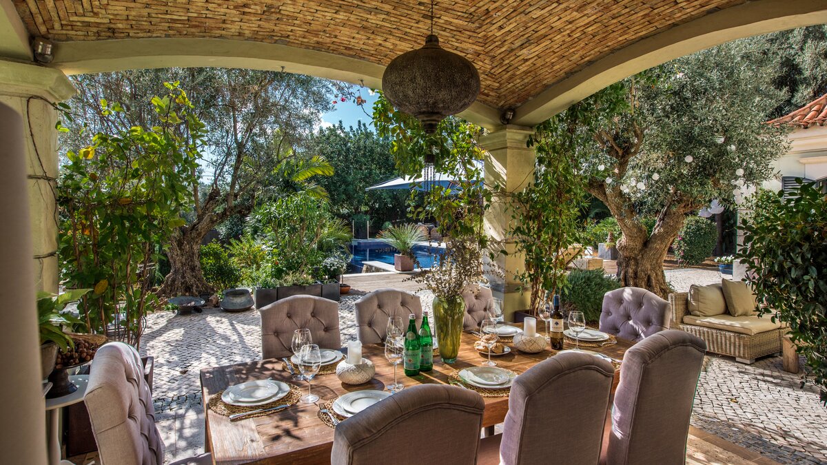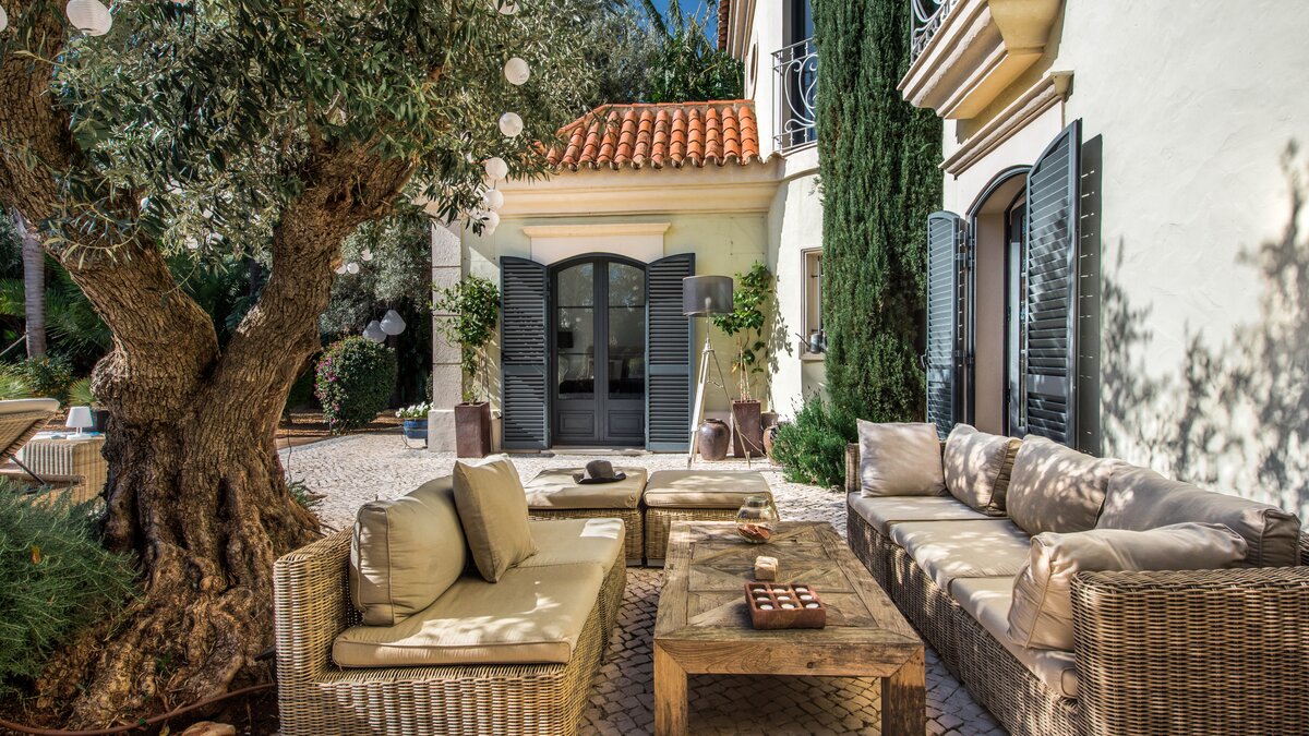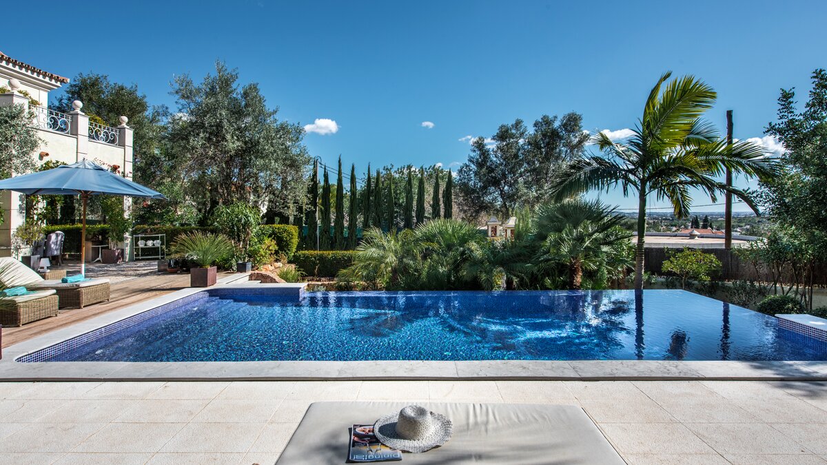Casa das Pedras is a mixture of traditional elegance and contemporary facilities, creating an ideal setting for large families looking for a perfect holiday away from home. Surrounded by beautiful trees, this property opens up to a small courtyard with rattan furniture for lounging, an exclusive infinity pool with a wooden deck, sun loungers and a hammock, and a covered dining area for al fresco meals. The modern and unique interior furnishings of the villa contrasts seamlessly with the exterior traditional design and the serenity of its location. Furnished in crisp white décor and touches of black and grey, exposed brickwork, tiled and wooden floors, Casa das Pedras is set over three levels. An open-plan living and dining area includes a state-of-the-art kitchen with access to the shaded terrace, the pool area and other outdoor spaces. Two double bedrooms containing private bathrooms complete the ground floor. All bedrooms upstairs have bathrooms en suite. The first level is entirely for the master double bedroom with access to a terrace and a double bedroom that can be made as a twin. The lower ground floor includes a double bedroom and a gym area. Almancil, with several shops and a good selection of restaurants is a short drive from the property; Vale do Lobo is 8km away and Quinta do Lago is 9.5km from the villa.