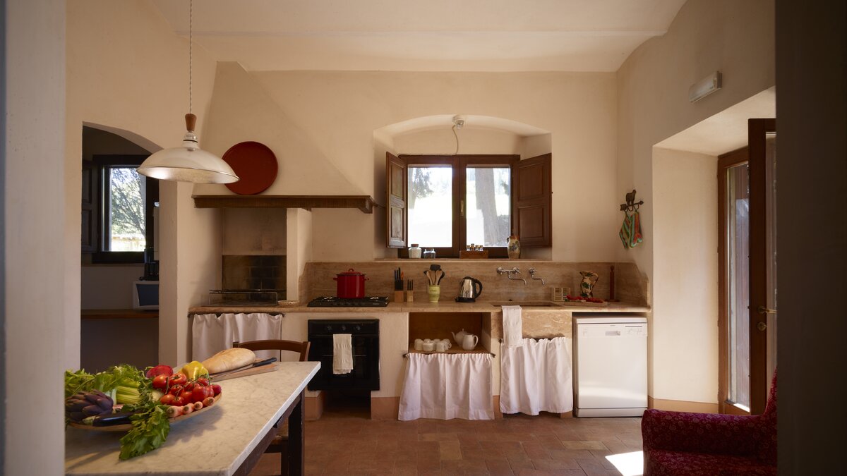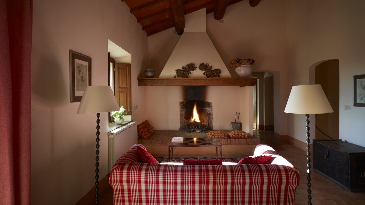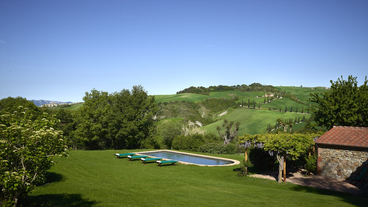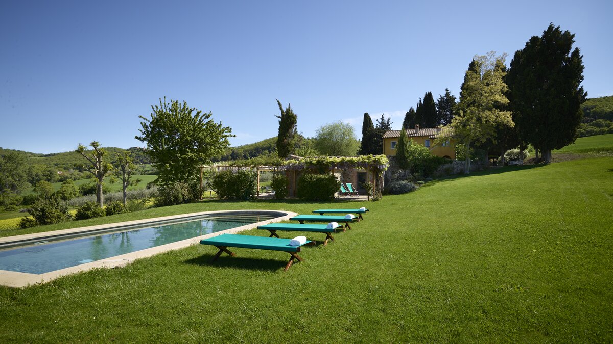Colour-washed in a sunshine shade of ochre, and furnished with effortless elegance and oodles of charm, this delightful house is designed throughout in traditional Tuscan country style, from raffia-seated dining chairs and vibrant bedroom kilims, to its two sitting rooms, one cool and smart in creamy white, with a bespoke travertine fireplace; the other cheerfully informal with big, bright cushions by a rustic inglenook fire. Accessed by a specially created spiral staircase, the upper floor of the villa is home to three bedrooms, the fourth enjoying extra privacy in a separate garden annexe. Scented with roses, softly encircled with trees and shrubs, and looking out to lovely views of the Val d’Orcia’s rolling hills, the gardens of Casa Del Rondone are an irresistible draw to al fresco living. A dining pergola adjoins the house, tucked between tall cypress trees, and a private pool is sunk into a huge expanse of lawn, with a leafy poolside pergola shading a well-placed hammock. Facilities within the estate include a restaurant and tennis court, and La Foce is a centre for cultural activities during the annual ‘Incontri in Terra di Siena’ international festival.