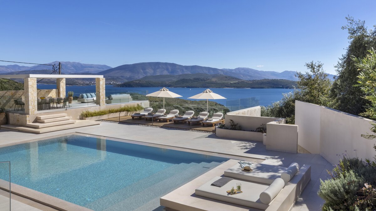 Med härlig utsikt över kullarna och hamnen nedanför, är detta en modern och elegant lyxvilla på Korfu, väl lämpad för flera stränder och vikar, och inklusive kokservice för enkel fritid.
