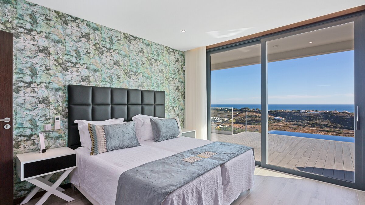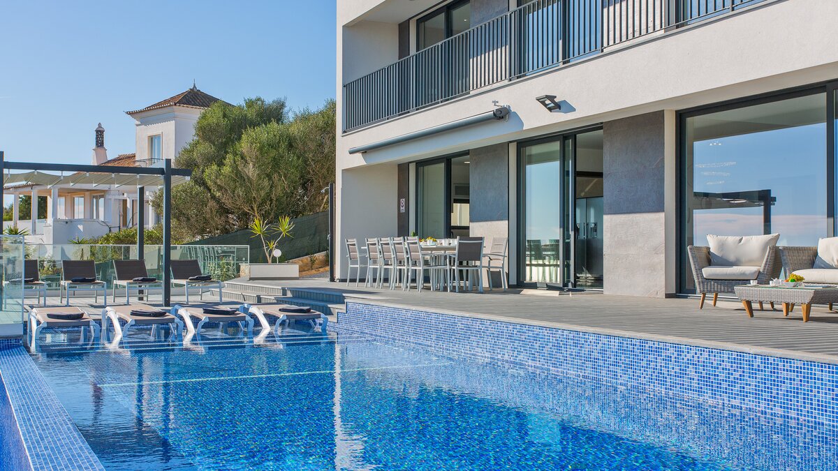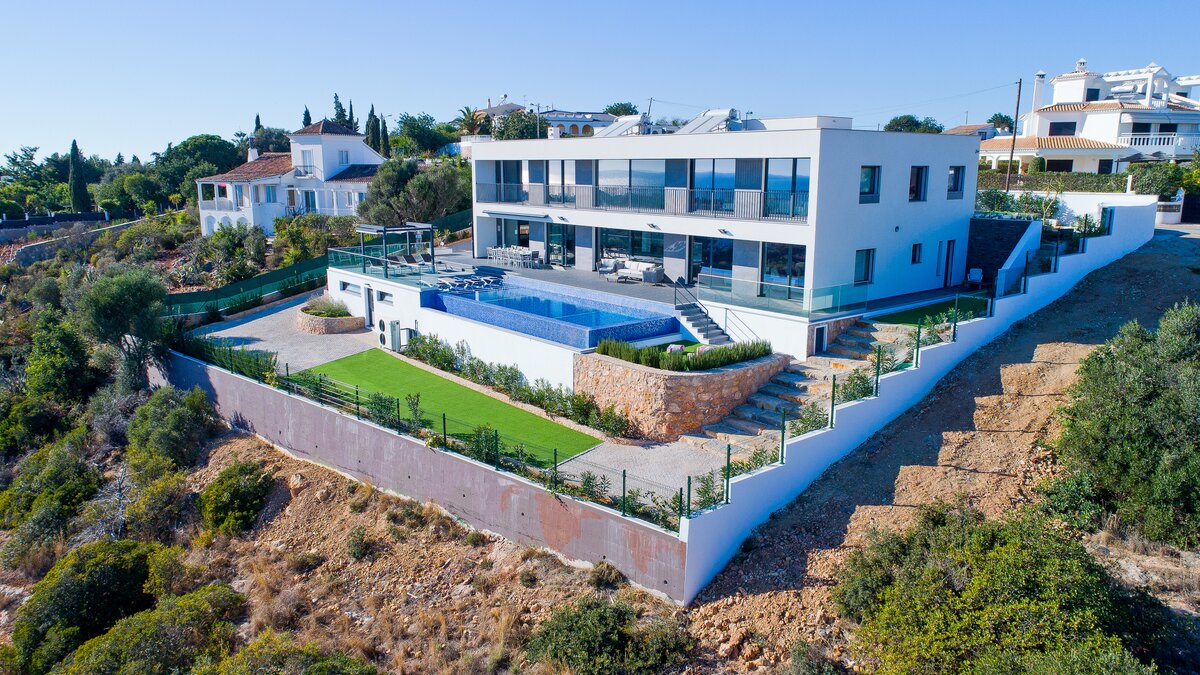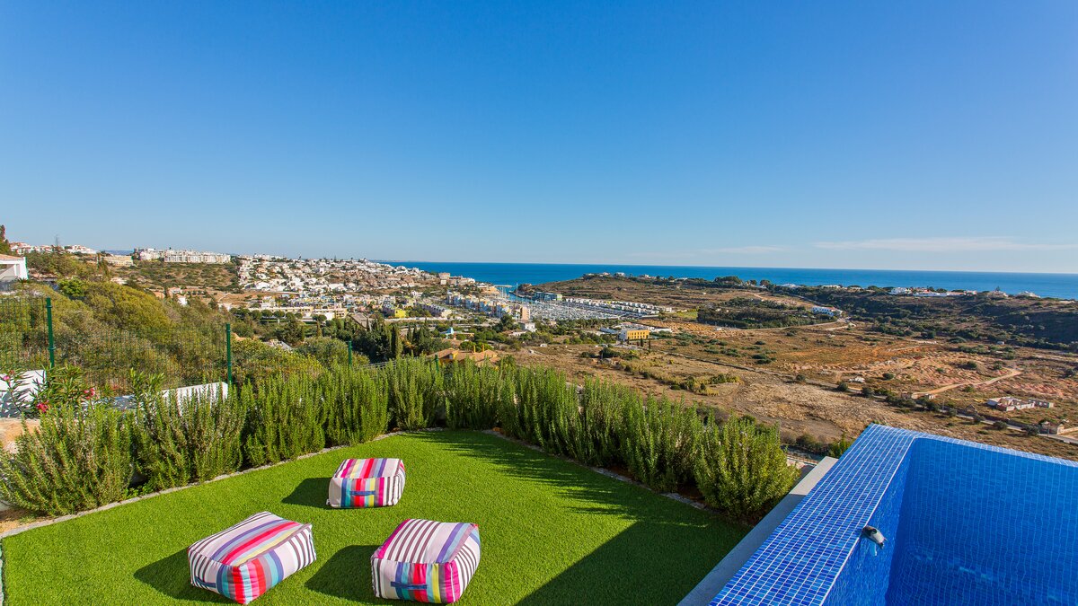 Harbour View is a newly built contemporary house located on the top of a hill overlooking Albufeira marina and out to sea. Spread over two floors, each of the bedrooms have en suite bathrooms or shower rooms, air conditioning, an individual sound system, WiFi and access to a terrace or balcony. On the lower level of the property you will find a large high ceiling living/dining room and state of the art kitchen with island looking out to sea. Also on this level you can find the media/games room. From both the kitchen and the sitting room you can access the focal point of the property, the wide ocean-facing terrace with stunning views.
