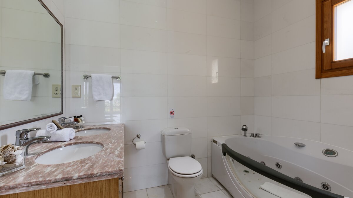 The spacious living/dining area has French doors providing direct access to the pool terrace, and leads through to a modern, well-equipped kitchen/breakfast room. There’s also an en suite bedroom to complete the ground floor, with Jacuzzi bath and dressing room. The magnificent stairway leads to the first floor and to four double bedrooms. The en suite master bedroom features a dressing room and a balcony where you can enjoy views across the fairways to the sparkling sea beyond. The other three bedrooms benefit from marble en suites and individual balconies with spectacular views.