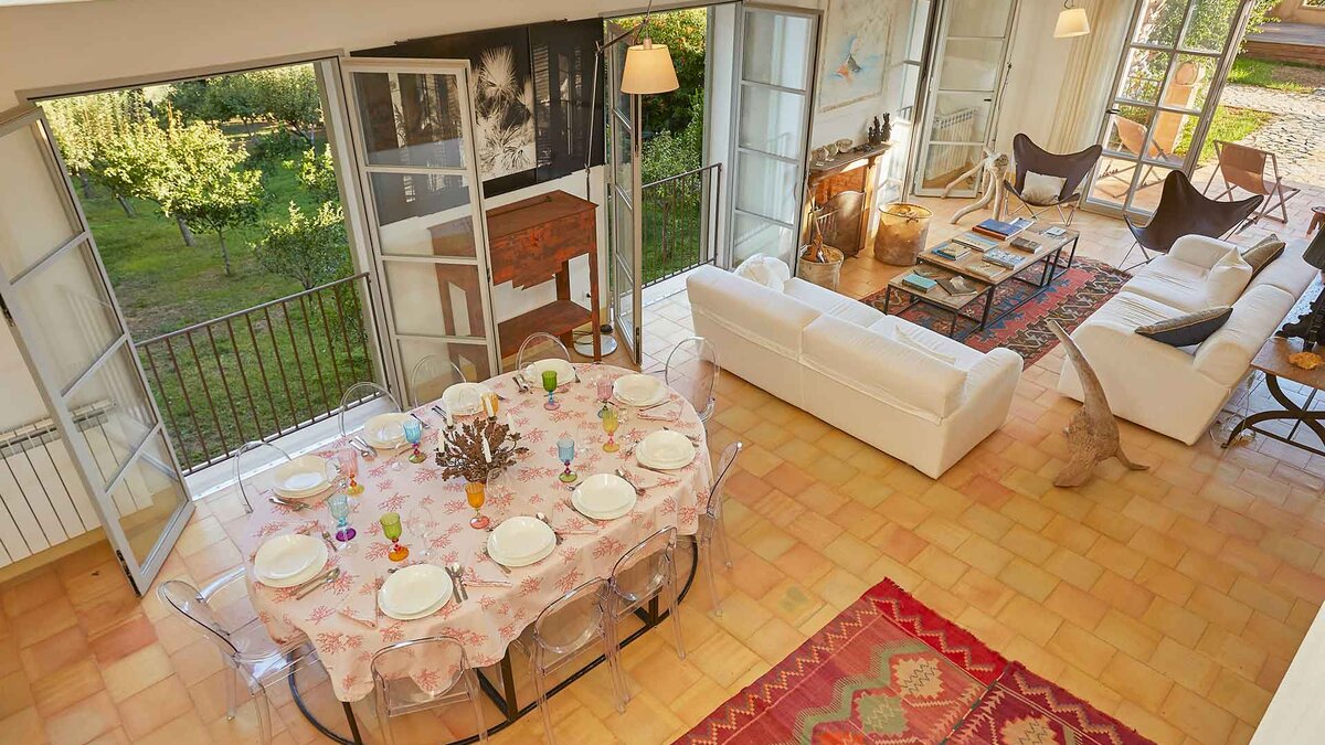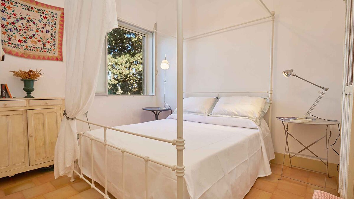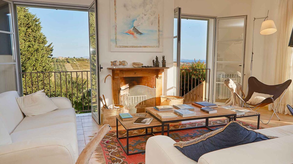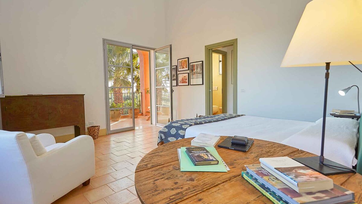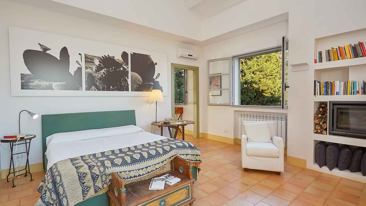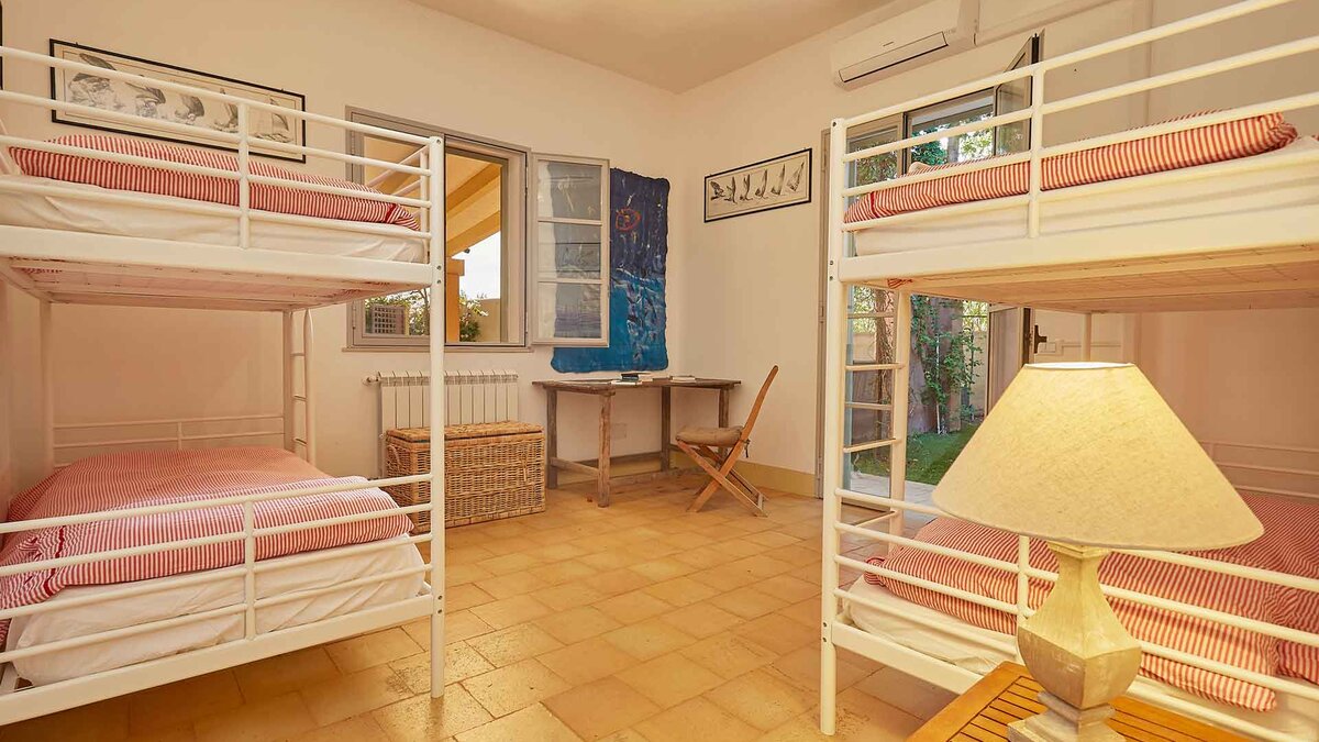 Sitting in a private position with views to vines and the sea, Il Gelso combines chic, roomy accommodation, an abundance of outdoor space, and close proximity to the glorious sandy beaches that this location is well known for. The entrance to the property takes you into the large open plan kitchen/dining area complete with stunning lava stone work surfaces . Off the kitchen there is a large modern shower room which leads on into a light filled double bedroom with a charming feature window onto a children’s play area. The luminous open plan lounge and dining area has three French doors with balconies the main one providing access to the delightful gardens and pool area and have incredible views of the countryside and the ocean. The interior walls of the villa are adorned with wonderful photographs taken by the famous owner photographer. From the sitting room there is a feature staircase up to a small study mezzanine area which leads out onto a terrace, suitable for hosting a summers evening party.
