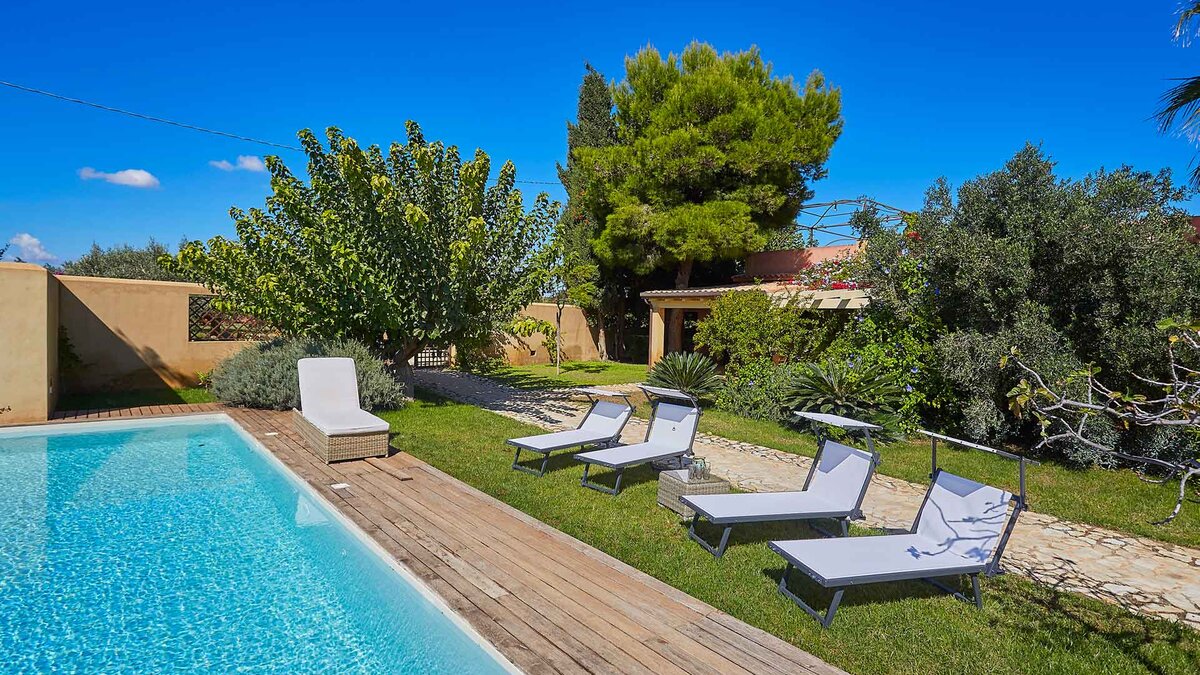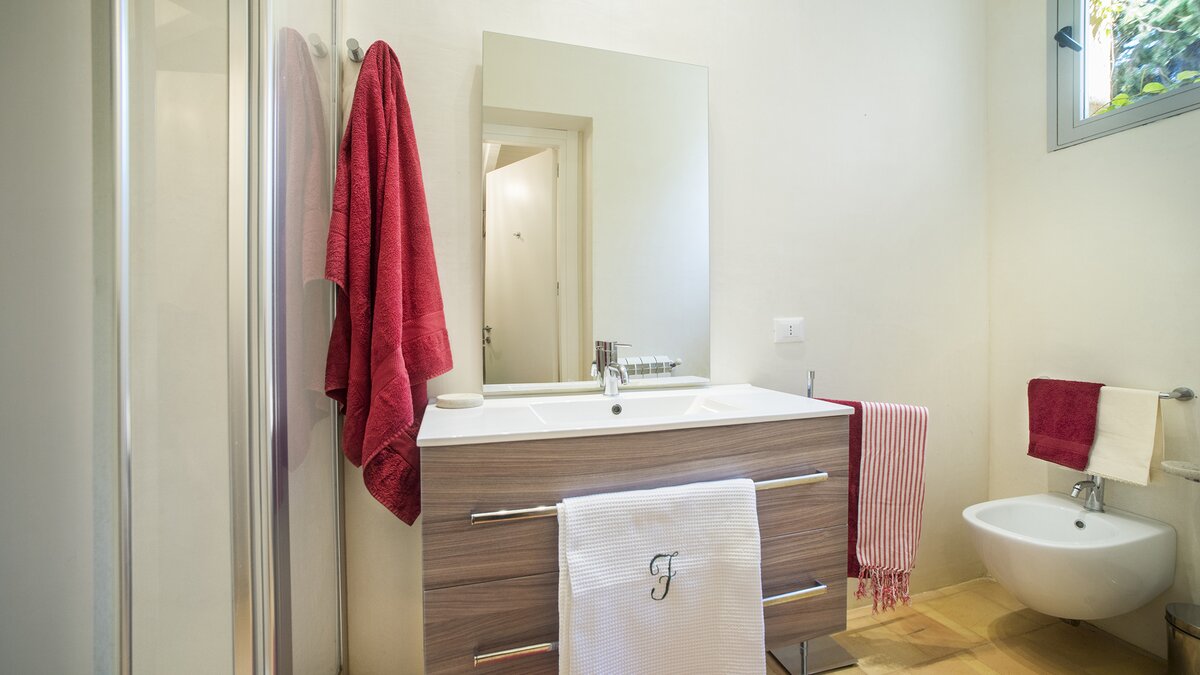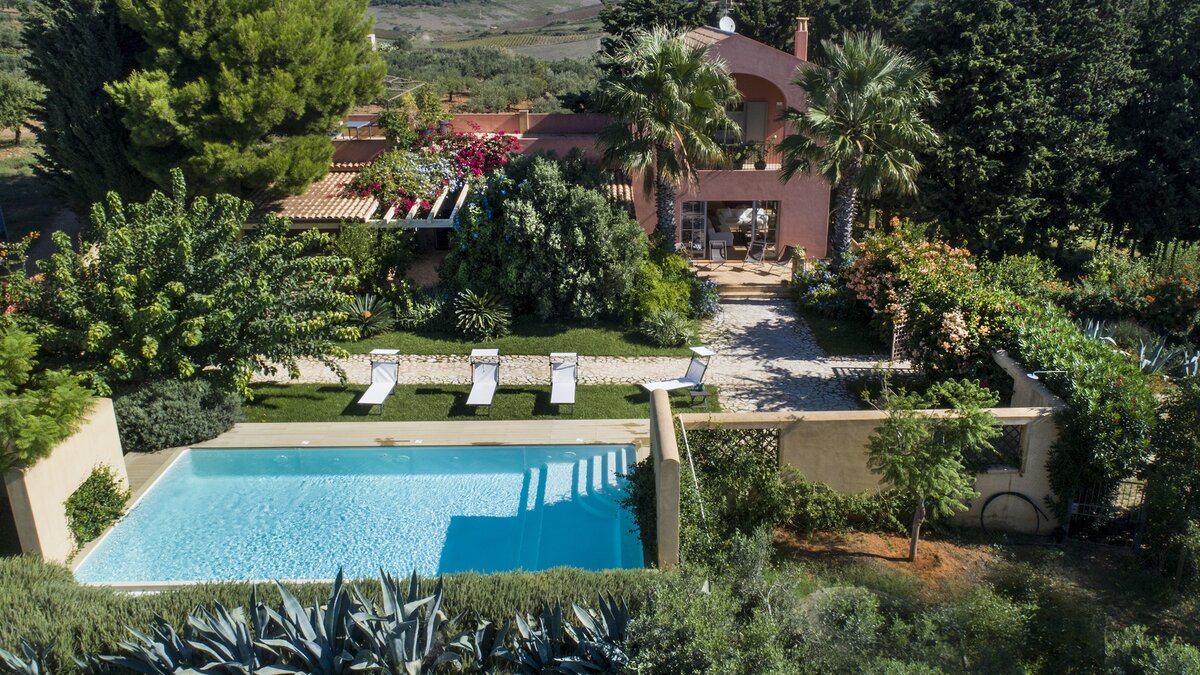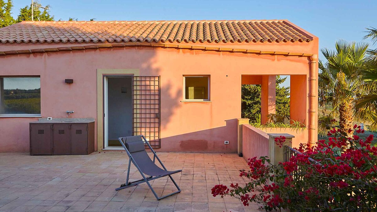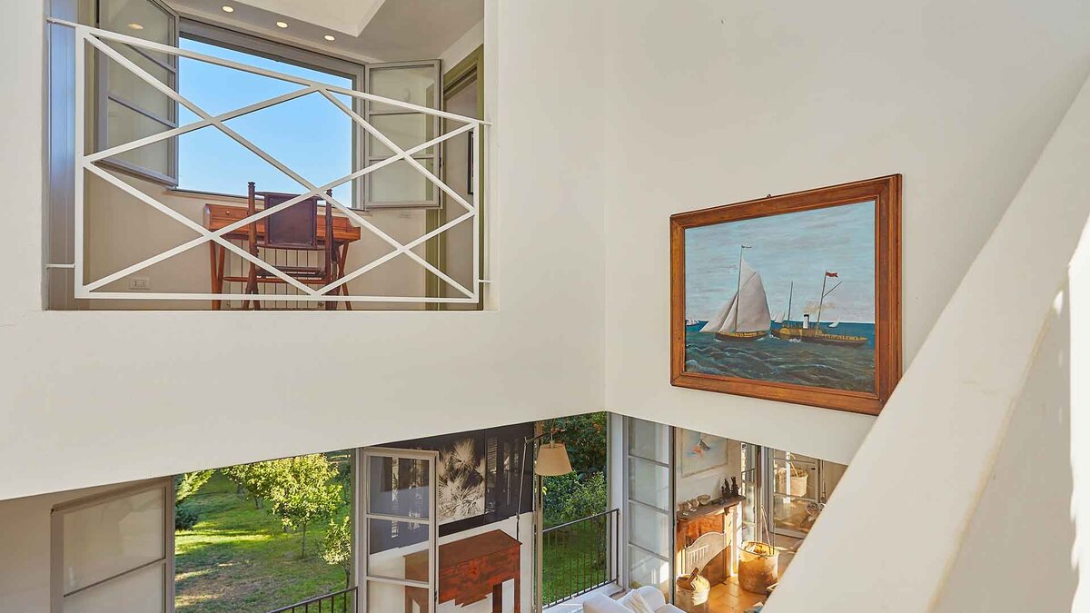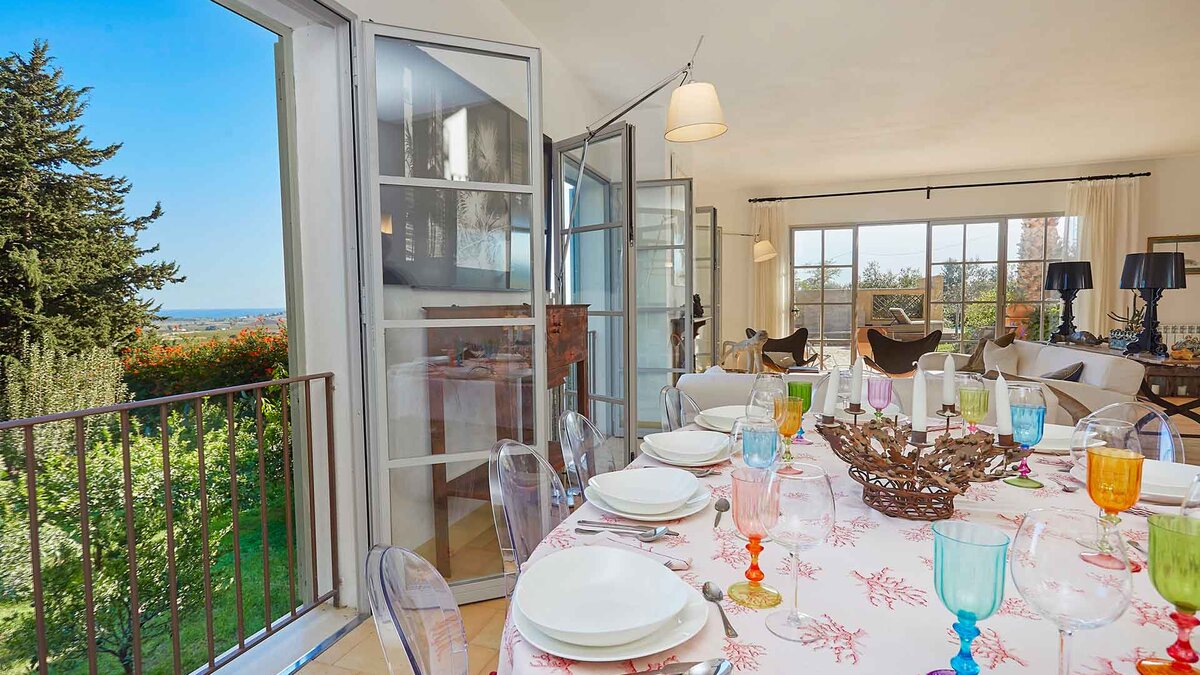 Sitting in a private position with views to vines and the sea, Il Gelso combines chic, roomy accommodation, an abundance of outdoor space, and close proximity to the glorious sandy beaches that this location is well known for. The entrance to the property takes you into the large open plan kitchen/dining area complete with stunning lava stone work surfaces . Off the kitchen there is a large modern shower room which leads on into a light filled double bedroom with a charming feature window onto a children’s play area. The luminous open plan lounge and dining area has three French doors with balconies the main one providing access to the delightful gardens and pool area and have incredible views of the countryside and the ocean. The interior walls of the villa are adorned with wonderful photographs taken by the famous owner photographer. From the sitting room there is a feature staircase up to a small study mezzanine area which leads out onto a terrace, suitable for hosting a summers evening party.