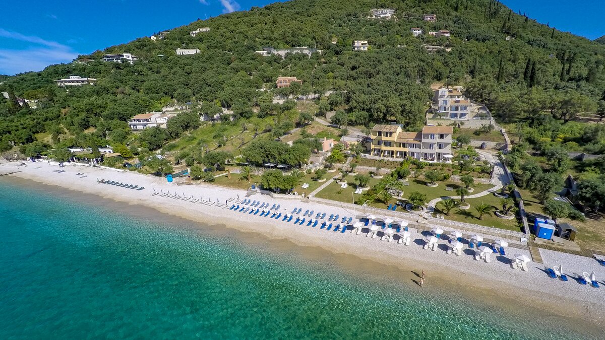 Med oavbruten utsikt över stranden och bukten, är denna trevåningsbyggnad upphöjd över strandnära gräsmattor som skuggas av olivträd, prickade av palmer, och korsas av en asfalterad gångväg som leder direkt till stenstranden. En trädäckad gångväg möter gästerna vid trädgårdsporten, icke-motoriserade vattensporter är tillgängliga från stranden, och det finns ett par tavernor inom två minuters promenad; så dessa anspråkslösa lägenheter har en avundsvärd miljö. Krouzeri Beach, som ligger ungefär halvvägs mellan Nissaki och Kalami, är typiskt för det avslappnade, barfotafria tempot i detta kluster av kustbyar, och är särskilt populärt bland par.