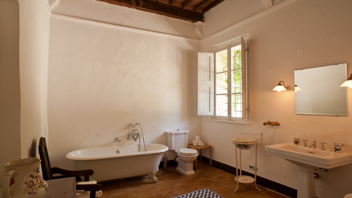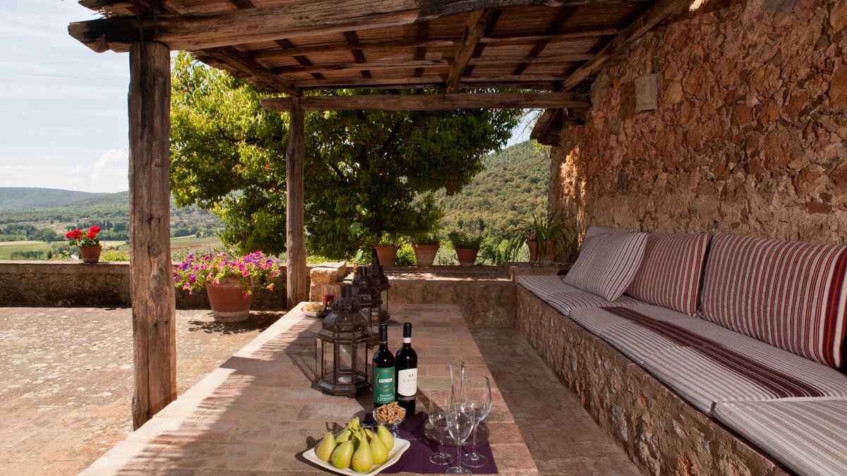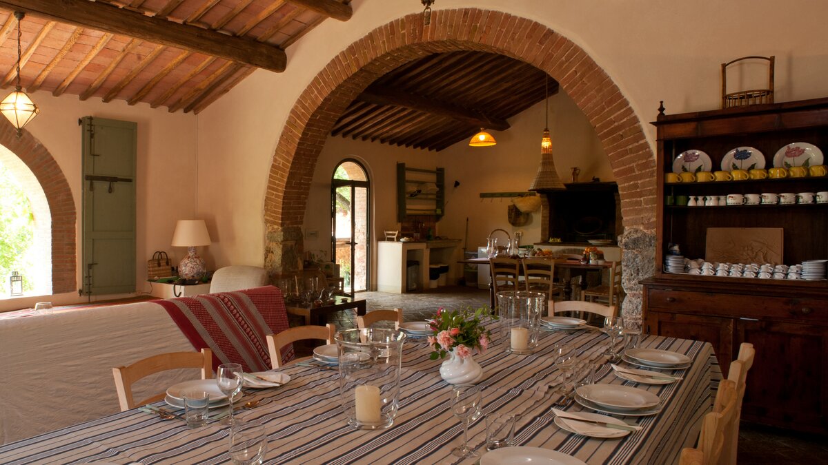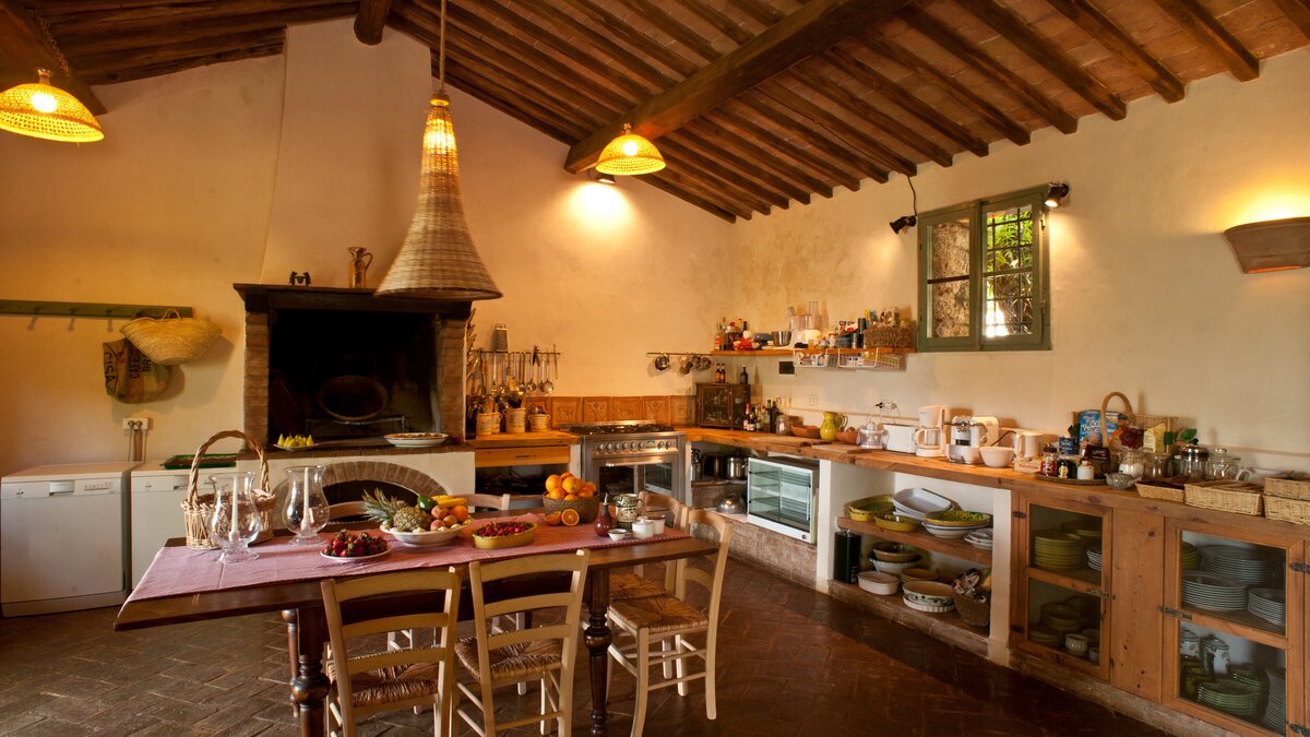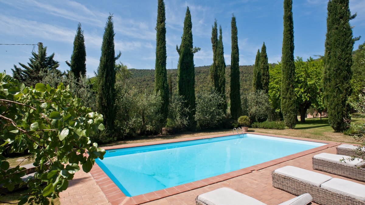 With accommodation on several levels, there are spacious living areas in both the house and garden, from the comfy sofas in the sitting room and a shaded sundowner terrace, to the open-plan kitchen /dining room and a rustic, vine cloaked pergola, where guests enjoy typically Tuscan food prepared by the cook. A stroll across tree-shaded lawns leads to a lovely swimming pool, its terracotta terrace thoughtfully furnished with smart rattan loungers.