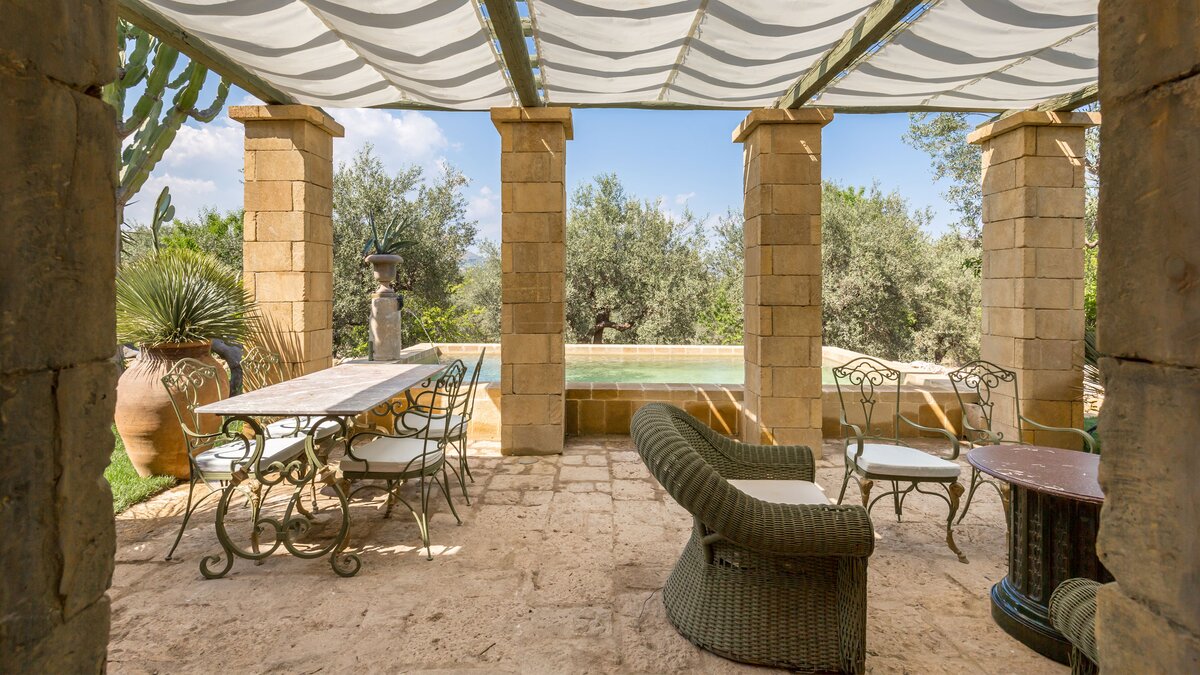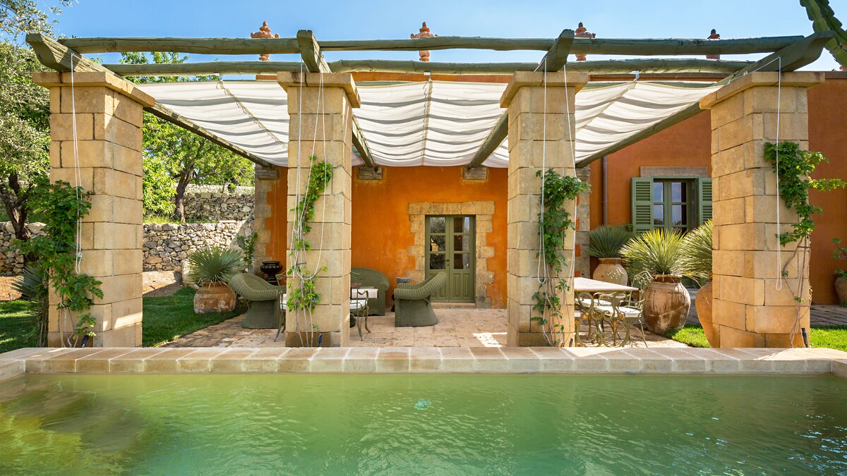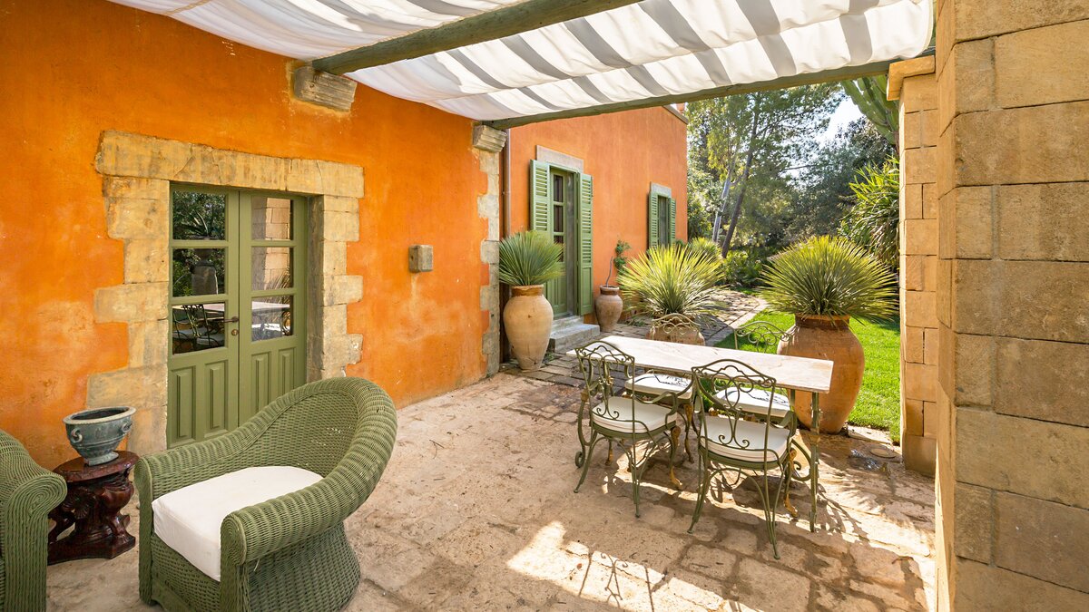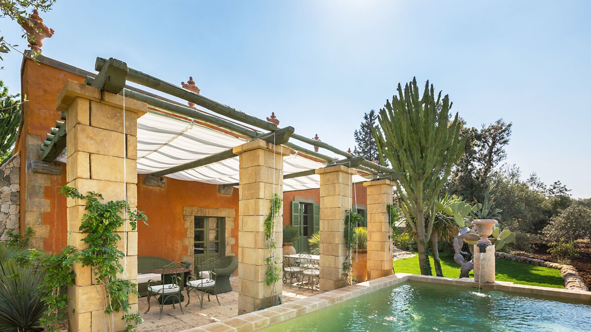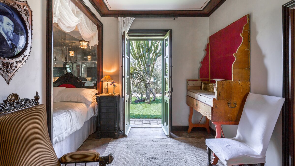 Perfectly positioned in Southern Sicily on an private estate, this private villa has been decorated by a noted French interior designer to offer a property with highly distinctive and remarkable interiors. The sitting room and two bedrooms are furnished with unique antique and more modern pieces, lighting, mirrors, distinctive wall papers and finishes, objet d’art and textiles, ideal for those who appreciate art, interiors and design. Behind the bookcase in the sitting room there is a compact and modern kitchenette.