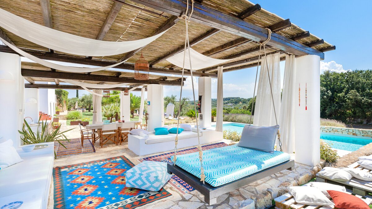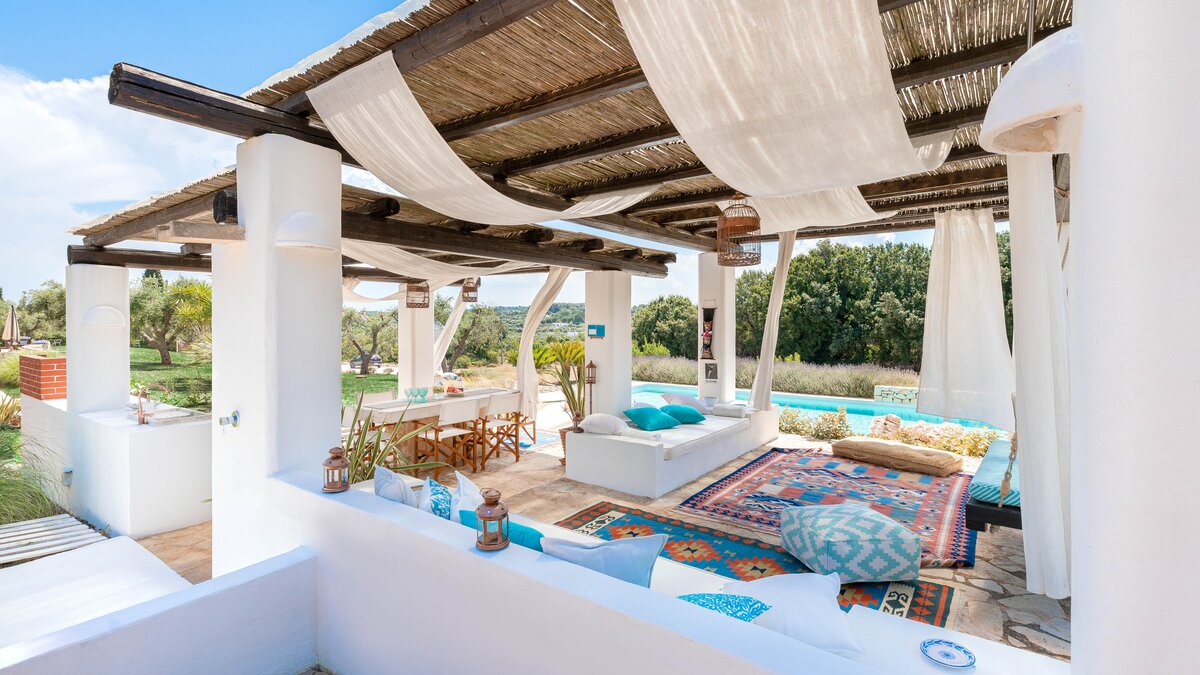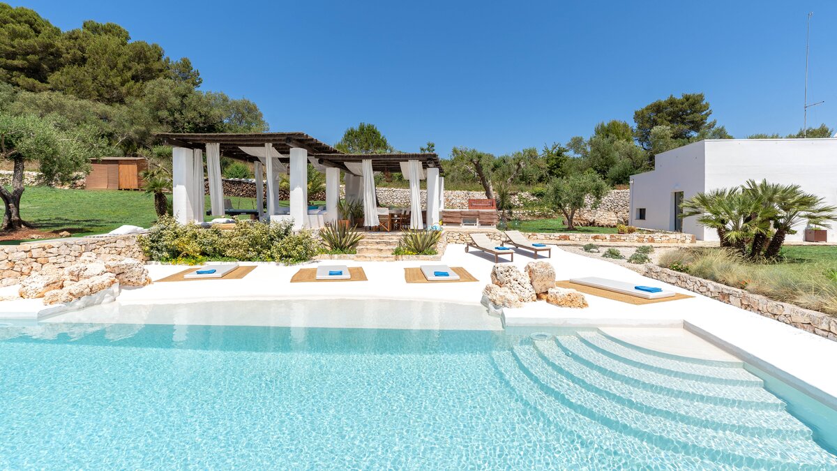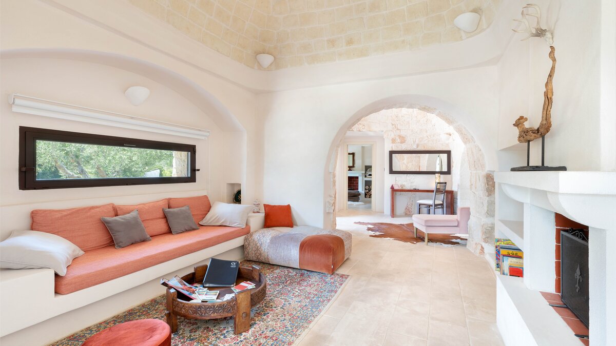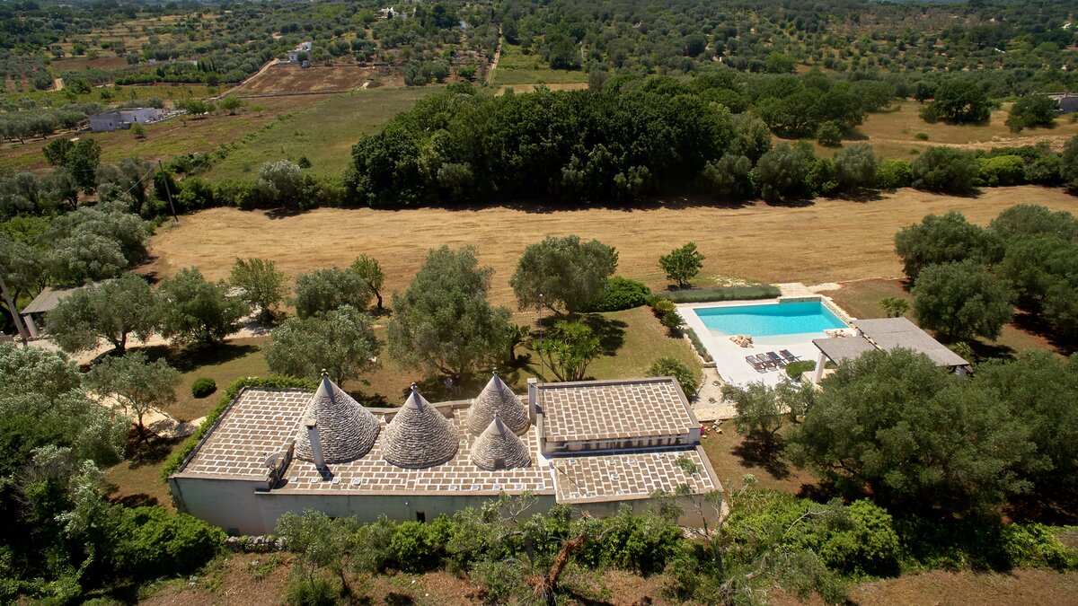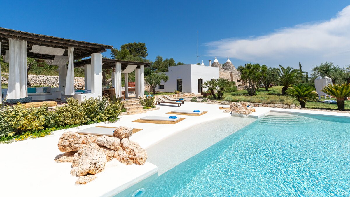 Set in a couple of acres of olive groves, with exceptional outdoor areas and views down the valley to spectacular sunsets, this luxury villa in Puglia brings modern amenities and Moorish touches to the traditional trulli.