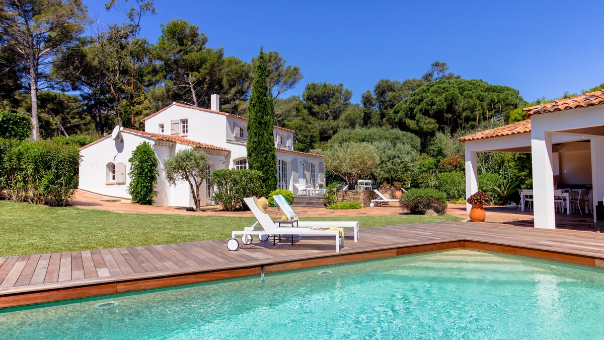 Beläget på en privat egendom, på en exklusiv halvö omgiven av 300 hektar tallskog, och bara några steg från havet. La Pinede är ett charmigt hus vars vita tvättade väggar kontrasterar mot de grönskande skogarna. Huset har öppen planlösning, enkelt inrett i lugnande, neutrala färger. Salongen öppnar sig genom franska dörrar till en vacker terrass med olivträd och sittplatser som är idealiska för uteservering på ljumma sommarkvällar. Trädgården vetter mot gräsmattor med den privata swimmingpoolen, liksom skuggiga platser i den omgivande skogen. Gården har också tennisbanor på den yttre kanten av området, och en privat strand en kort promenad från fastigheten.