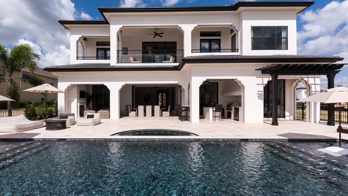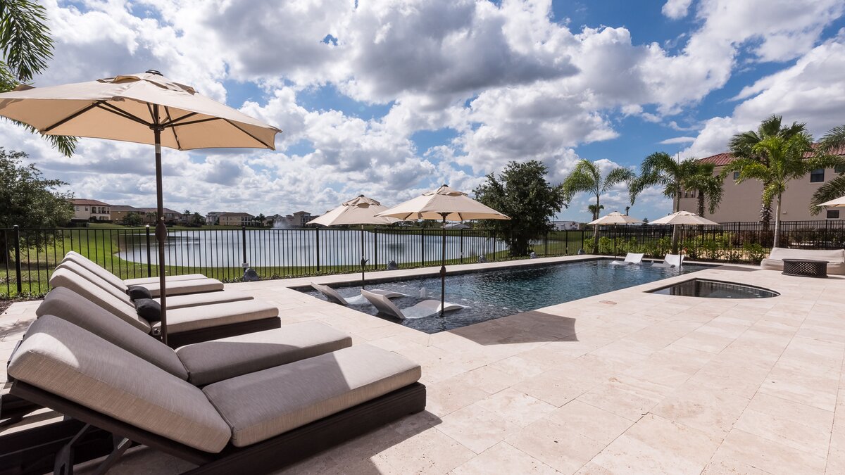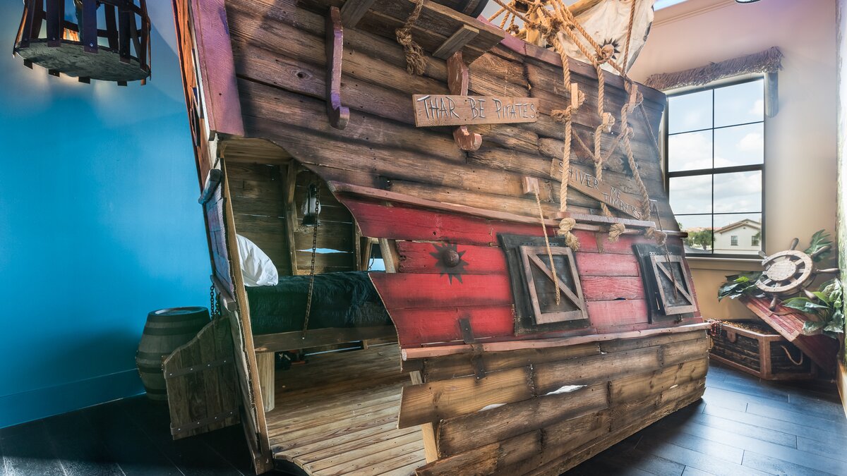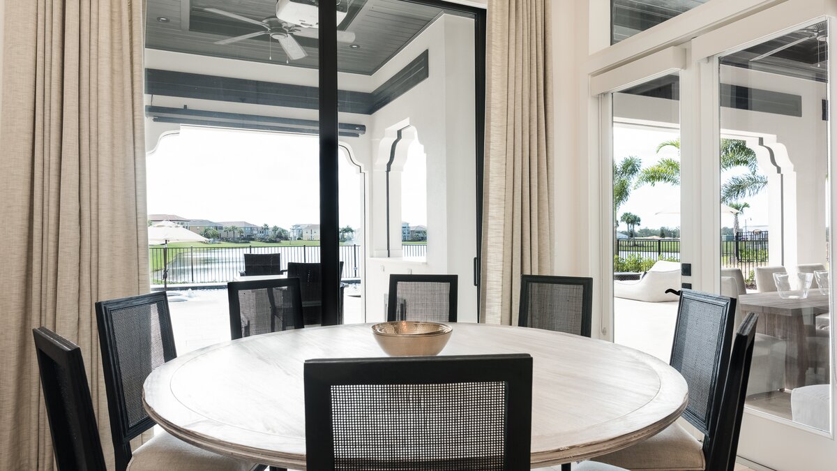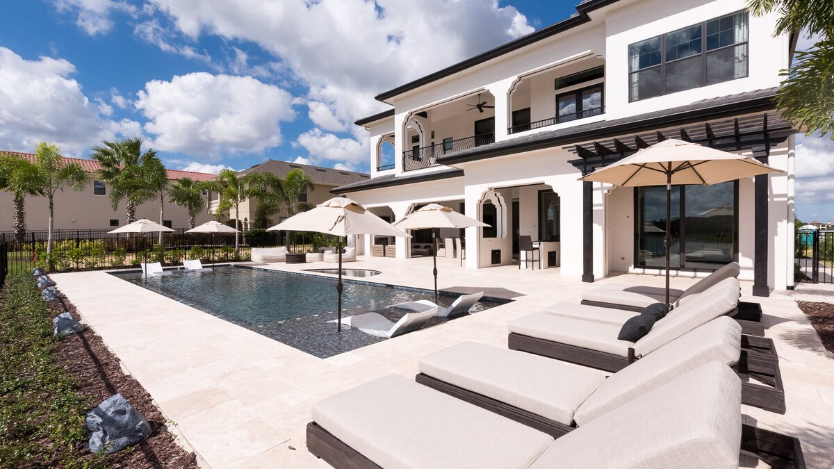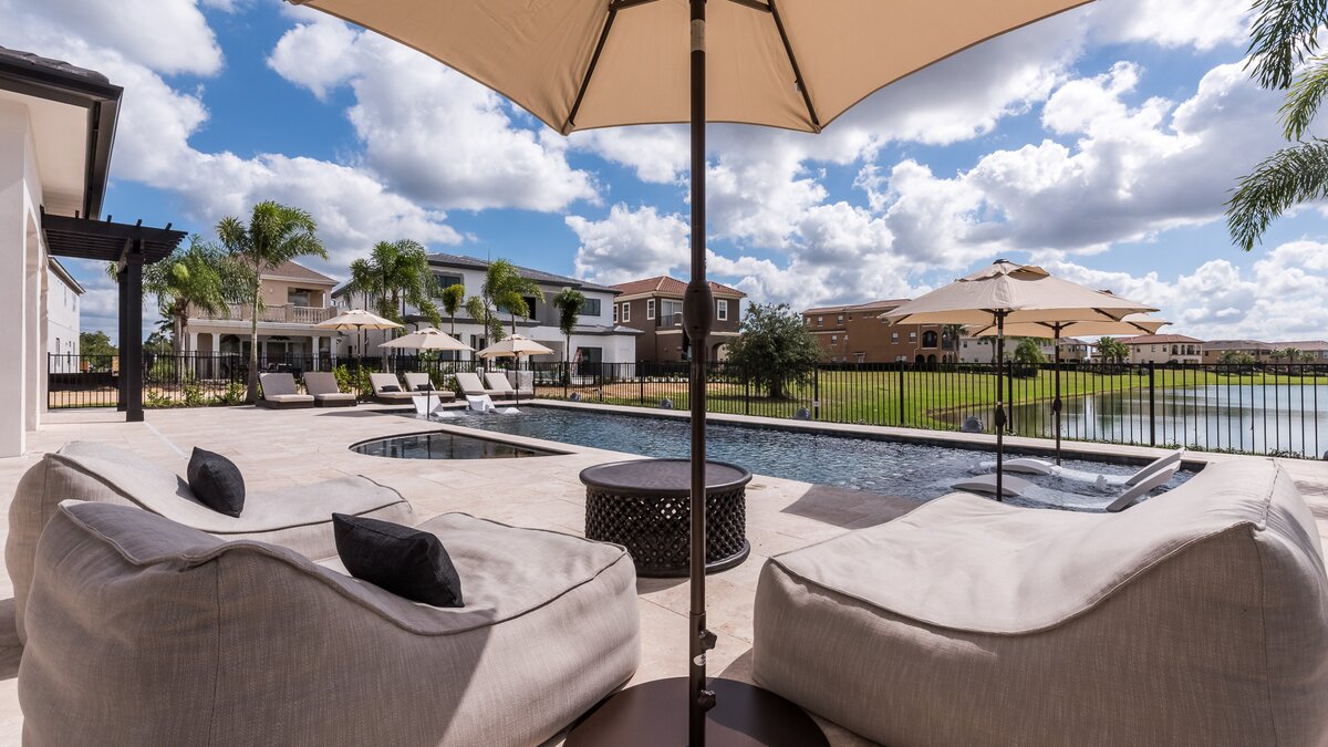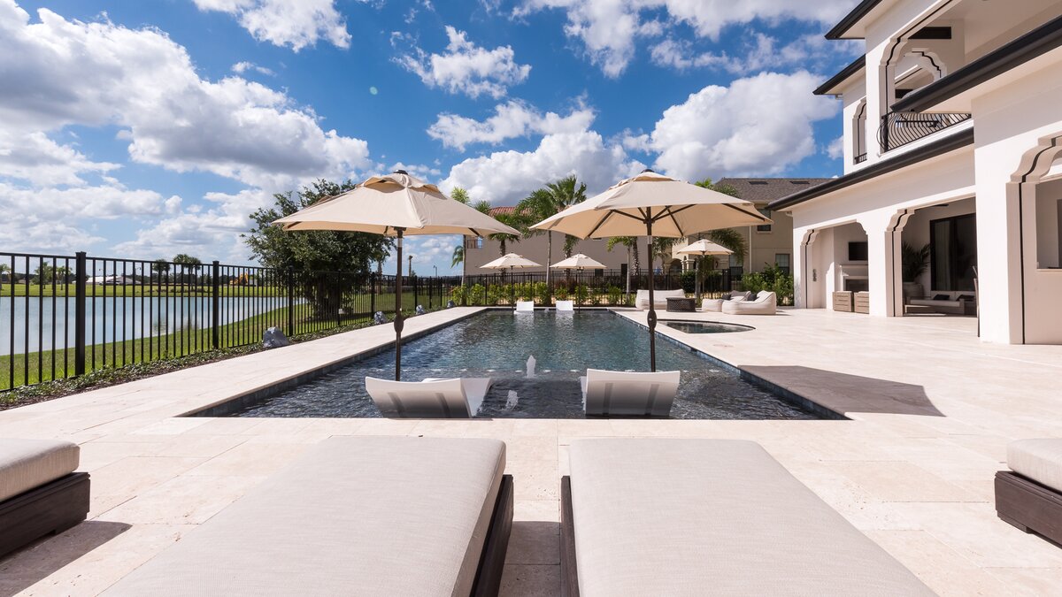 This whitewashed home in Orlando’s Reunion Resort is very sleek, chic and creatively modern. Its huge white exterior is instantly eye-catching, and the expansive interior – with 7 bedrooms and 7 bathrooms – sleeps up to 14 guests in stylish luxury. There’s a large open-plan living area that takes over the downstairs; plenty of sofa seating makes the most of the huge TV centrepiece, and there’s a smart kitchen and indoor dining area for home-cooked meals. Spacious en-suite bedrooms include themed kids bunk rooms and generous king size beds. Each one is decorated in a different style to the last, with bespoke furniture pieces and gorgeous bathrooms that can include a large shower or indulgent free-standing tub. Some bedrooms also have access to the spacious downstairs terrace or balcony upstairs. Lake View is a villa with plenty of imagination, and includes a video arcade games room and cinema room for the youngsters – this ‘drive in’ home theatre comes complete with fun car seating and a huge projector screen. Grown-ups should head to the upstairs lounge bar, which has access to an impressive balcony overlooking the lake. Outside, you’ll find a large private pool with a spillover tub and in-pool loungers, and there’s also an outdoor kitchen with BBQ and an al fresco dining area for those warm summer nights. There are plenty of sun spots and poolside seating on the terrace, or the covered lanai includes a cosy fireplace and relaxing lounge seating with an outdoor TV.