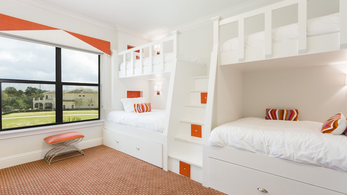 Bedrooms are spread over two floors, with the master bedroom with en suite bathroom on the ground floor opening to the pool terrace. Also on the ground floor is a double bedroom with shower room en suite, while on the first floor there are three double bedrooms with either en suite bath or shower rooms, a twin room with en suite shower room, and a bunk bed room with two sets of bunk beds and shower room en suite. Lantana is situated on the Reunion Resort, and guests can access some of the resort facilities, including the tennis complex, golf courses and water park, for an additional cost.