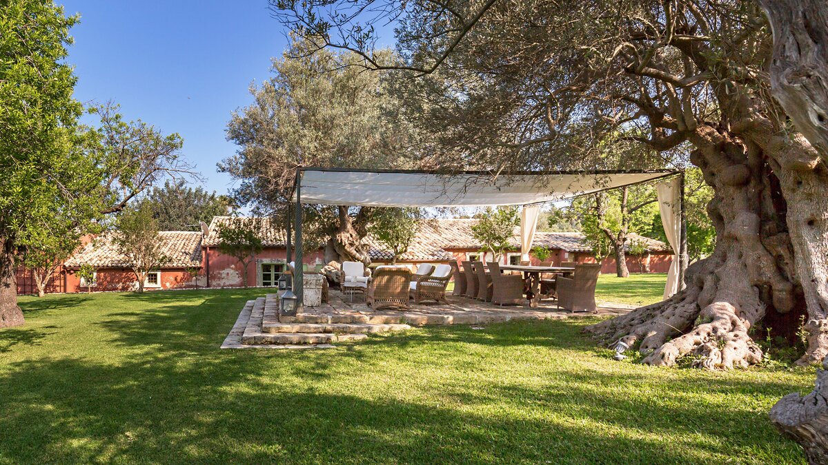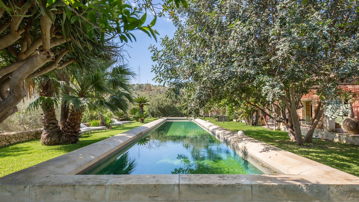 One of the bedrooms opens up to the terrace and two of them are accessed externally. The villa also opens to a stone- paved terrace for relaxation under the pergola, a spacious veranda at the rear under the olive trees for al fresco meals, and a long swimming pool, all surrounded by beautiful and extensive lawned gardens. This highly unusal villa is 3km away from the sandy Calamosche beach and a short 10 minutes’ drive to Noto and all its amenities and within easy reach of Siracusa and further Baroque towns.