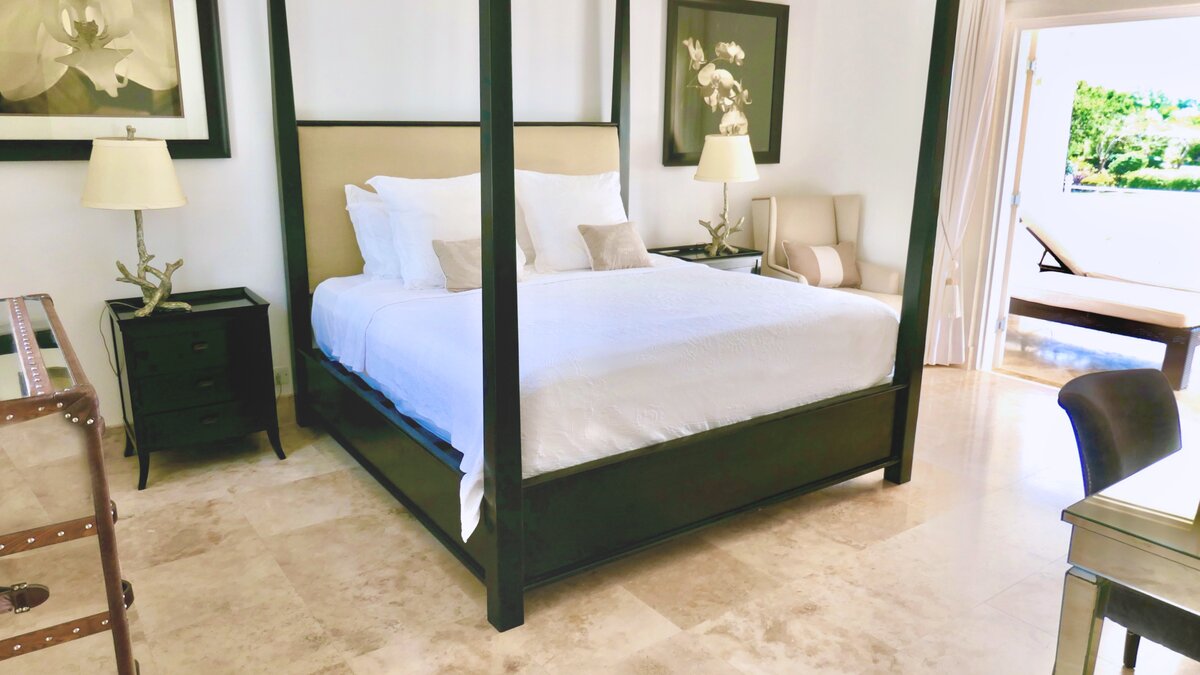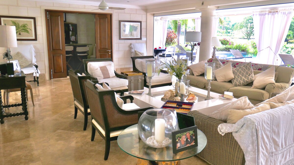 With views of the golf course and the Caribbean from the first floor balcony of its coveted master suite, this lovely house has perfected the blend of high standards and relaxed informality. A stylish and comfortable sitting room is echoed outdoors with an al fresco living/dining terrace, covered, colonnaded and curtained, and set beside the generously sized infinity pool. Five bedrooms, each with air conditioning and en suite bath or shower room, include three with king size beds, one in chic monochrome with a modern four-poster, and one enjoying extra privacy in a separate cottage by the pool deck. The ground floor bedrooms and a family /TV room flank a central courtyard with a serene water feature and sentinel palms.