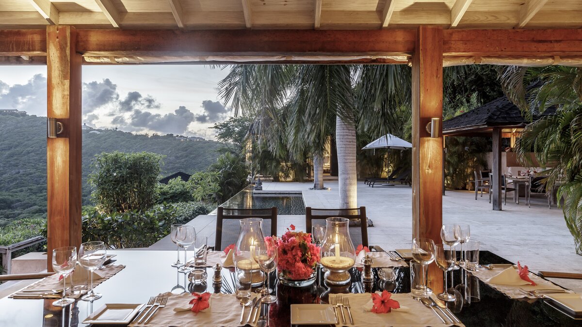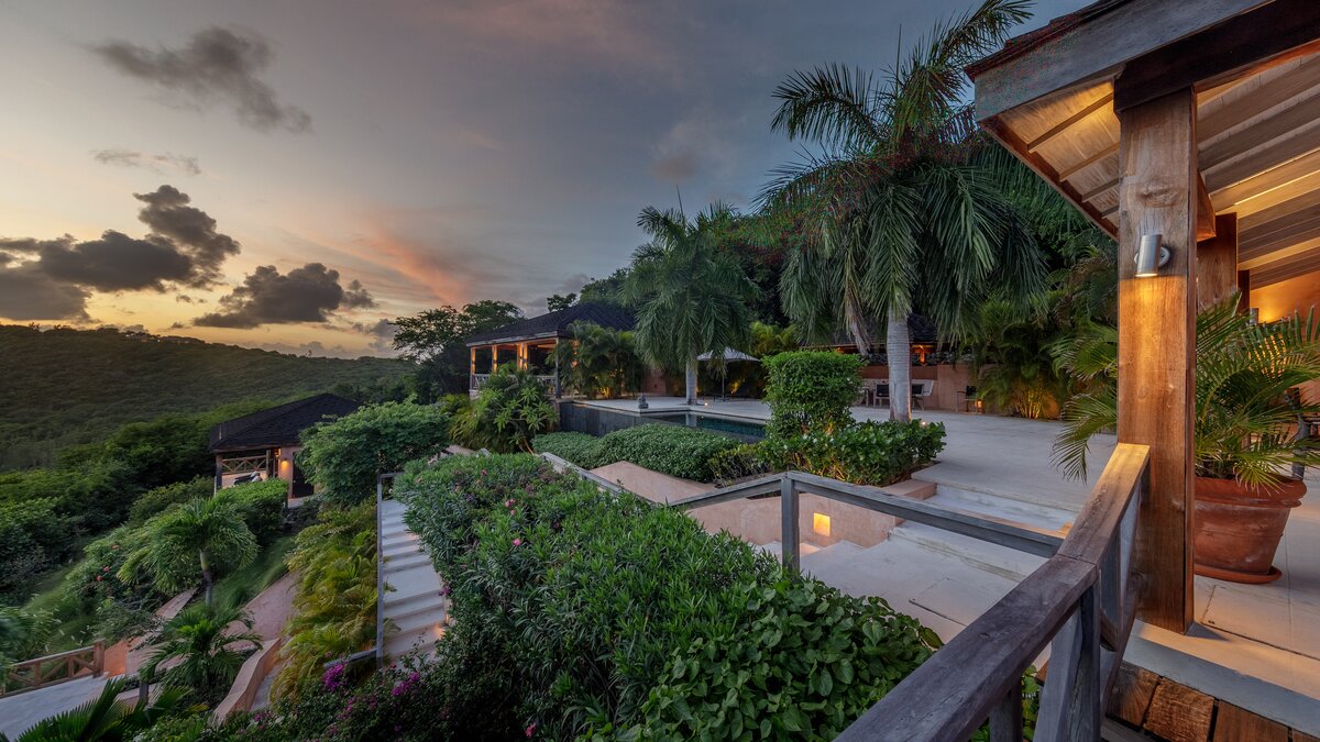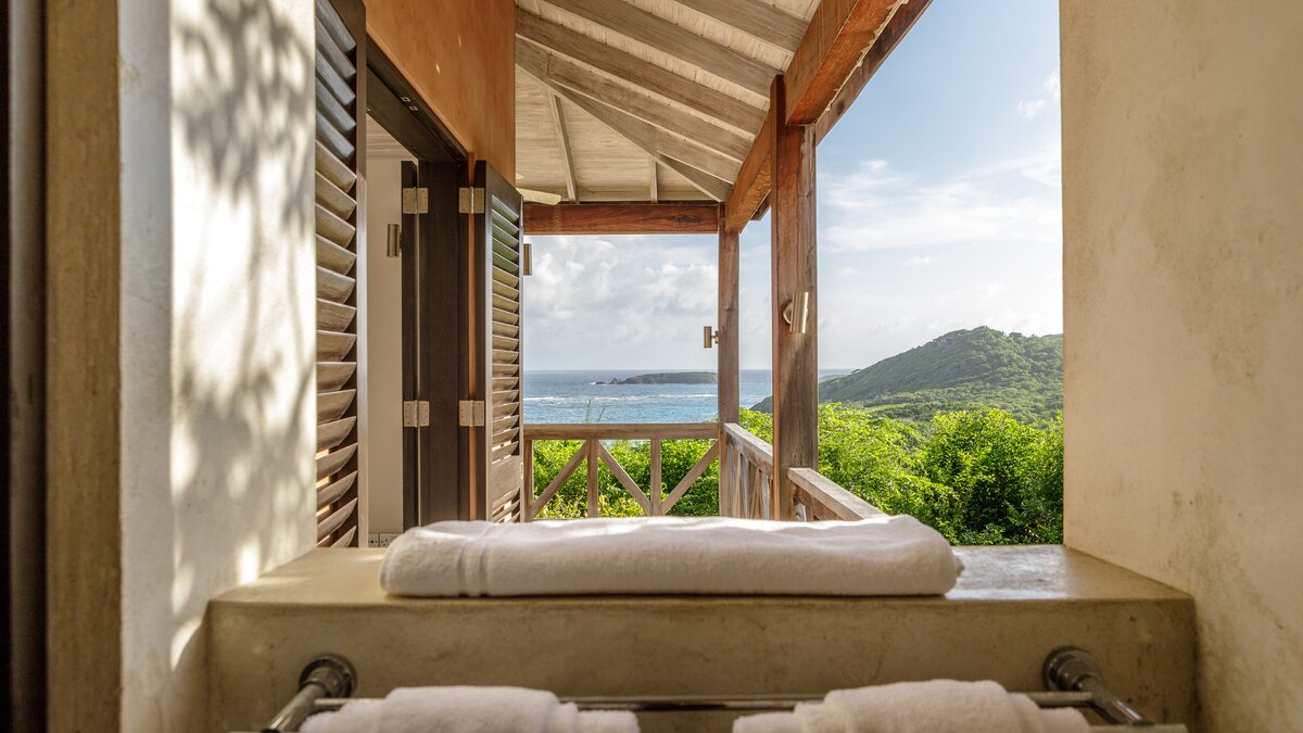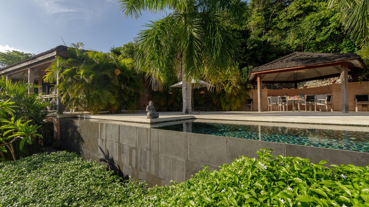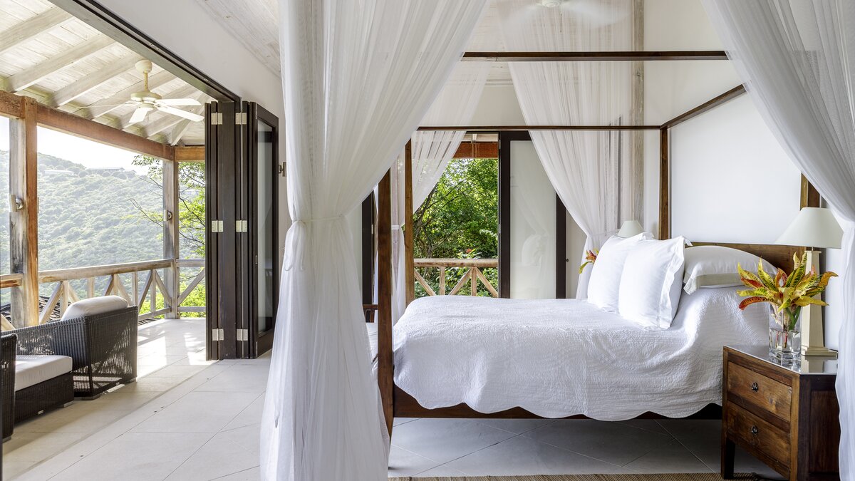 This incredible property, perched on the hillside looking out over rolling green hills down to the white sand beach and sparkling turquoise water, offers the ultimate in luxury and relaxation. Set in acres of lush gardens, and with the individual bedrooms set on different levels and connected to the living area and pool by a series of walkways, there is a real sense of seclusion and privacy here. In the main pavilion you’ll find the kitchen, where the cook will prepare three delicious meals a day and a living room with folding doors opening out to a shady furnished terrace and hanging balcony, and really blurring the line between outdoors and in. There are three individual bedroom pavilions with four poster beds, dressing rooms and shower rooms en suite, and all have private furnished terraces.