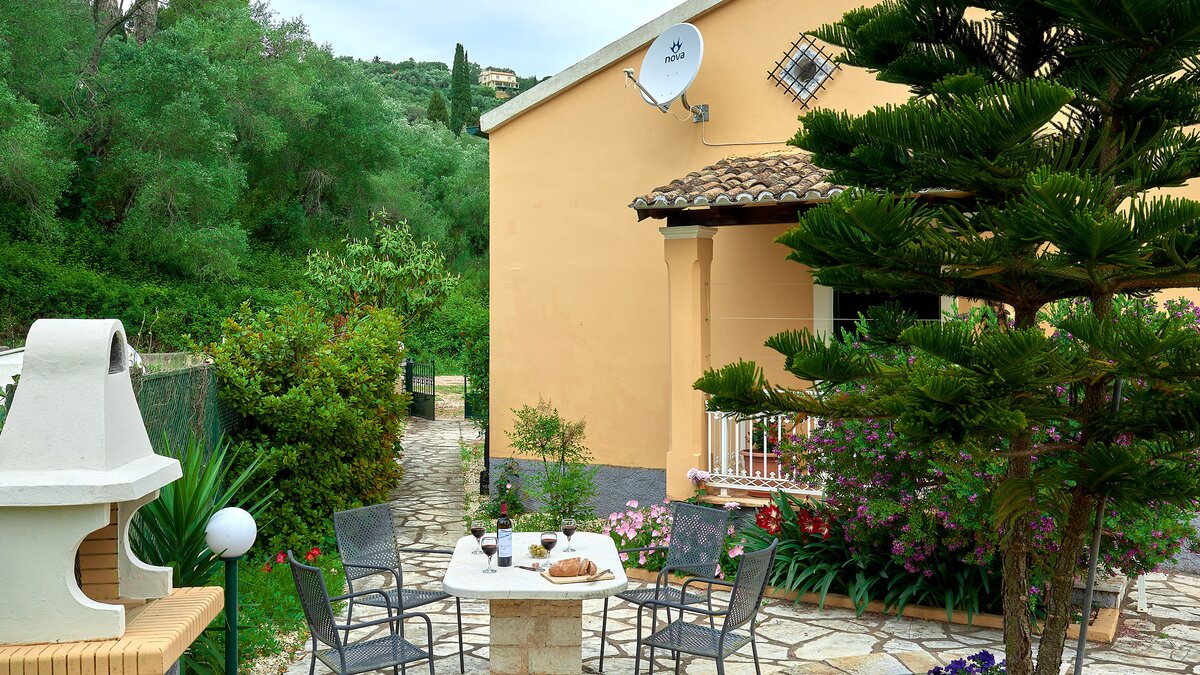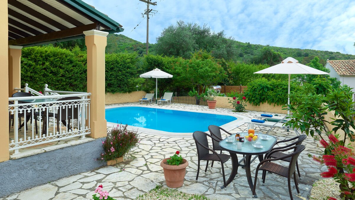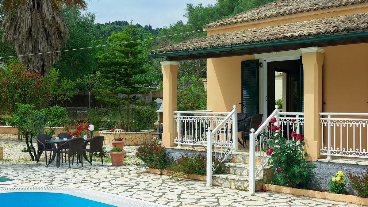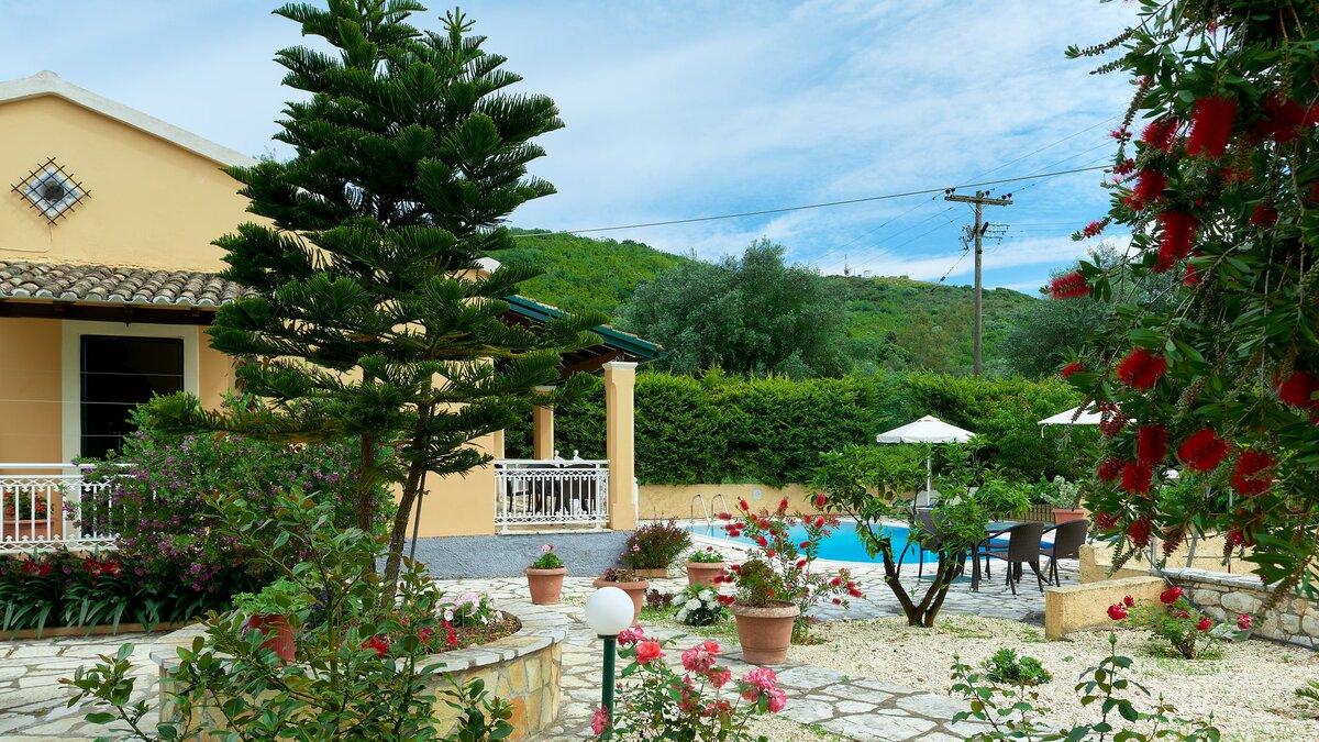 Just minutes away from the village centre, gorgeous gardens surround this little family villa in Corfu, naturally screening a private pool and creating a charming space for al fresco living.