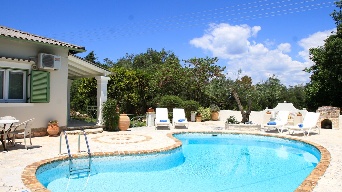 Det nordöstra hörnet av Korfu är känt för sitt band av närliggande vikar och stränder, var och en med sin egen karaktär och alla inneslutna av kustnära kullar. Denna lilla villa ligger inom räckhåll för de bästa av dem, belägen på den orörda landsbygden i Coyevinas och bara några minuter från dess steniga strand. Inom en tio minuters promenad finns det tennisbanor och strandnära tavernor i Avlaki. Tjugo minuter bort finns Kassiopi butiker, restauranger, barer och ett snabbt nattliv. Och en mycket kort bilresa tar dig till den vackra hamnen i St Stephano i sikte. Enkelt utformad för komfort, har villan två luftkonditionerade sovrum och ett kombinerat vardagsrum/matsal, och lämpar sig för friluftsliv med en vacker veranda och en åtta meter lång swimmingpool. Terrassen vid poolen är möblerad för att koppla av och äta utomhus, och det finns också en inbyggd grill. Vanligtvis ganska ostörd, i juli finns det en kyrkdriven sommarskola i närheten och man kan höra barnen roa sig, ofta till ganska sent på kvällen.
