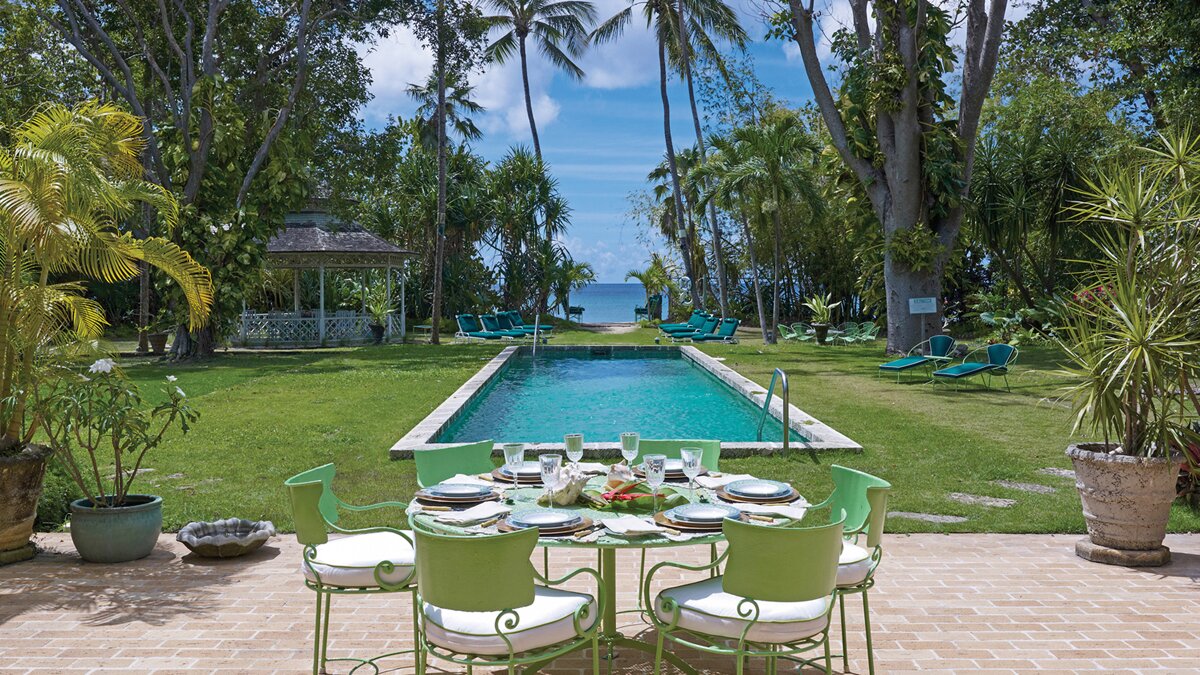 Utsikten från den exceptionella poolträdgården är frestande att titta genom en klyfta i träden till det blå i Karibiska havet. Huset, graciöst och charmigt, är en tropisk skatt.