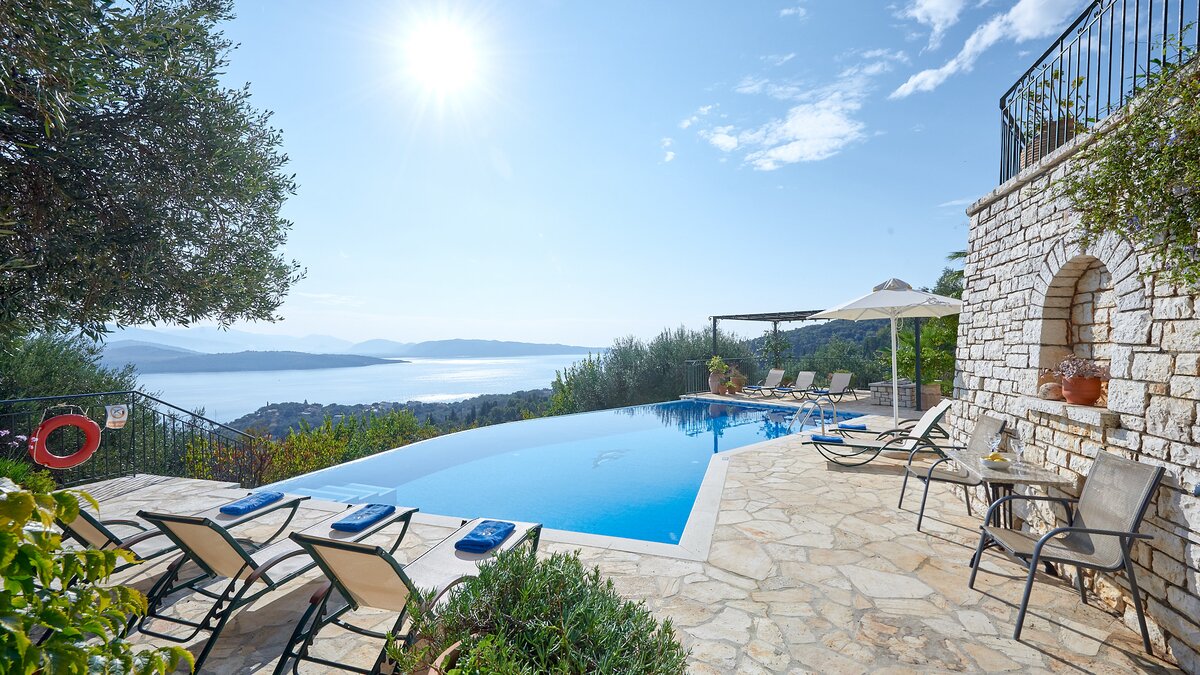 Mindre än två kilometer från tavernor vid vattnet i förtrollande St. Stephano, ligger denna familjevilla på en sluttning med utsikt över hamnen, med spökande utsikt över hästskobukten från sina rymliga rum och soliga terrasser. Villan är omgiven av silverbladiga olivlundar och nås via en ganska brant uppfart. Villan utstrålar en känsla av avskildhet, samtidigt som du har enkel tillgång till barer och nattliv i Kassiopi, och segling och vindsurfing från stranden vid Avlaki. Lika tilltalande för familjer eller grupper av vänner, har Nepenthe två sovrum och två tvåbäddsrum på översta våningen, alla med luftkonditionering och eget badrum eller duschrum. Bottenvåningen upptas av ett smart och välutrustat kök och ett luftigt vardagsrum, med stora soffor och ett coolt klinkergolv. Detta vetter mot huvudterrassen, som är bekvämt möblerad som ett al fresco vardagsrum / matsal; och steg leder ner härifrån till tolv meter lång infinity pool och poolside pergola. Huset har en inbyggd grill och matlagning kan förbättra det lugna tempot.