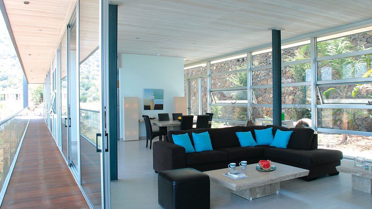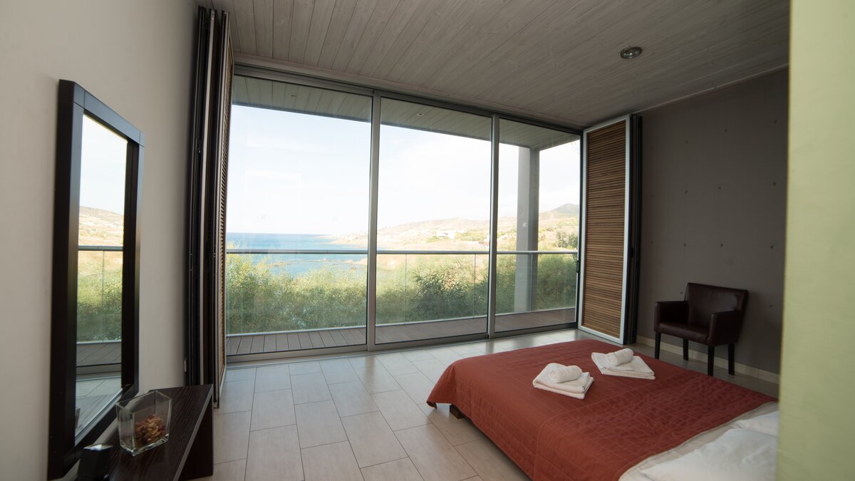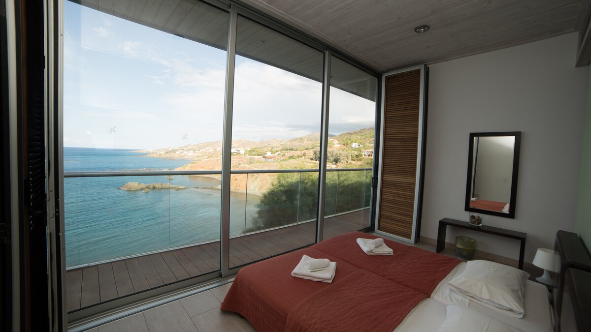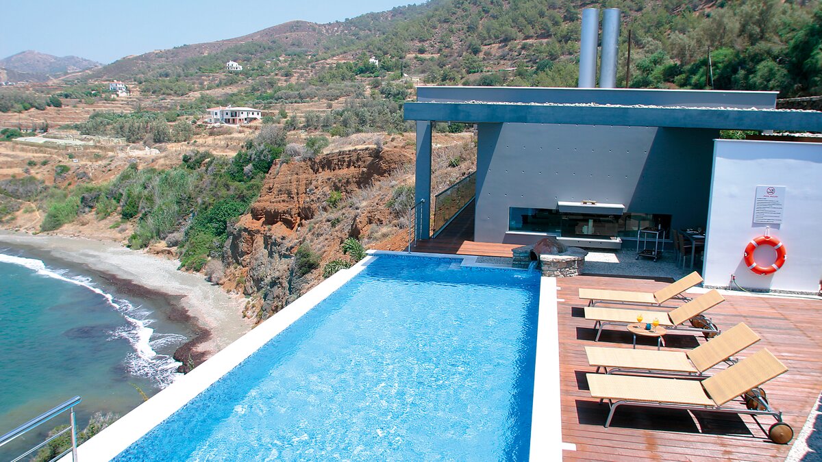 In prime position on a seafront clifftop, this very contemporary villa combines superb views with spacious interiors and stylish design. Sliding glass doors run the length of the single-storey house, opening to a decked walkway, itself glass-fronted to afford uninterrupted views of the Med from the living room and bedrooms. The villa’s fully equipped kitchen adjoins generously proportioned social space in an open-plan arrangement of sitting and dining areas. Modern, minimalist and with floor to ceiling windows on both the seafront and garden sides, the room features an intriguing glass fireplace, through which the pool terrace and al fresco dining / built-in barbecue area can be seen. With WiFi and air conditioning throughout, Pallas has one double and two twin rooms, each with en suite shower room open to the bedroom. The infinity pool is set in a timber decked sun terrace overlooking the sea, and there is a shaded seating area, perfect for sundowners. On the outskirts of Pomos village, the villa basks just above a small beach and is 20km from amenities in Polis.