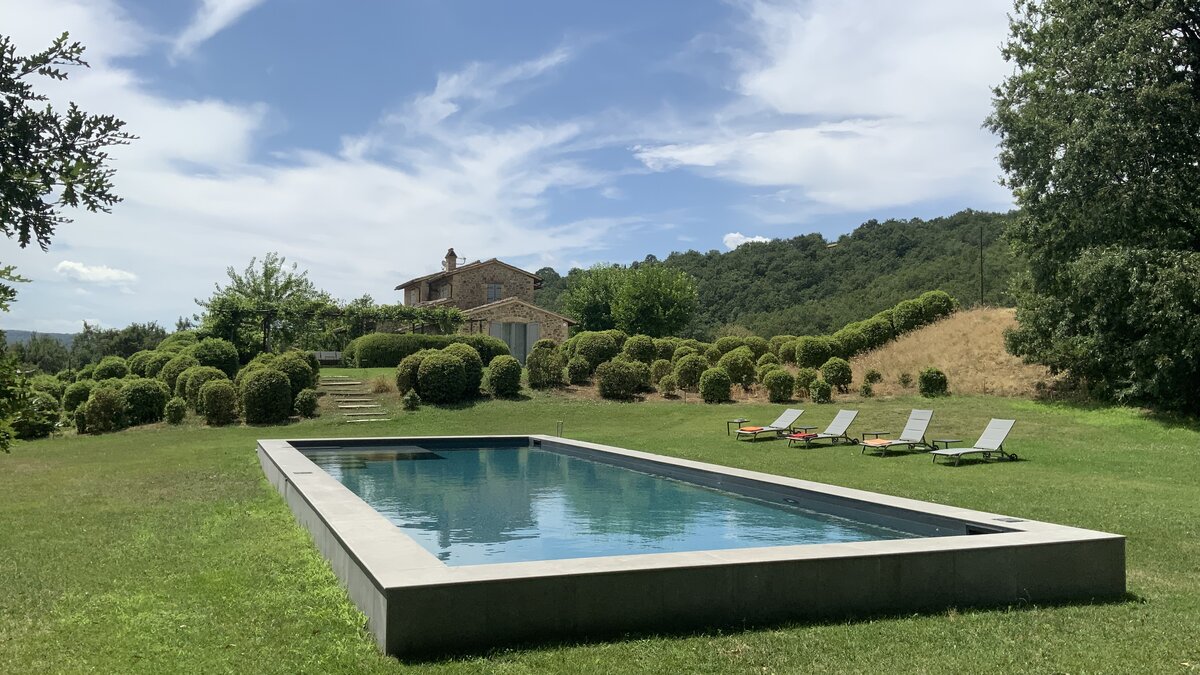 En perfekt paradox av ett hus, denna familjevilla är både elegant och informell, mycket privat men ändå inom räckhåll från den vackra staden Todi, och ganska vuxen men med två hektar tomt för barn att springa runt på. Nyligen renoverad, är villan genomgående inredd med enkel elegans och viktiga samtida konstverk. En luftig öppen planlösning upptar bottenvåningen, köket med angränsande matplats och en elegant sittgrupp. Ett TV-rum som är mer avslappnat klädd i varma färger kompletterar bottenvåningen. Det välutrustade köket har en ö och gott om förberedelseutrymme, matlagning kan vara en extra njutning. Dessa öppnar ut mot en stor täckt terrass, bildar al fresco stilfulla matsalar och vardagsrum med utsikt över den hisnande utsikten. På första våningen finns ett master bedroom, och det finns tre rum med eget badrum på lägre nivå. Och precis nedanför huset, på mycket rymliga gräsmattor, är den generöst stora poolen förenad med två lusthus för skugga. Den effektiva hushållerskan älskar också att laga mat åt gästerna. Medeltida Todi butiker och restauranger ligger bara 9 km från villan, Perugia och Assisi ligger båda inom en 50 km bilresa, och det finns en liten lokal butik bara 3 km bort.
