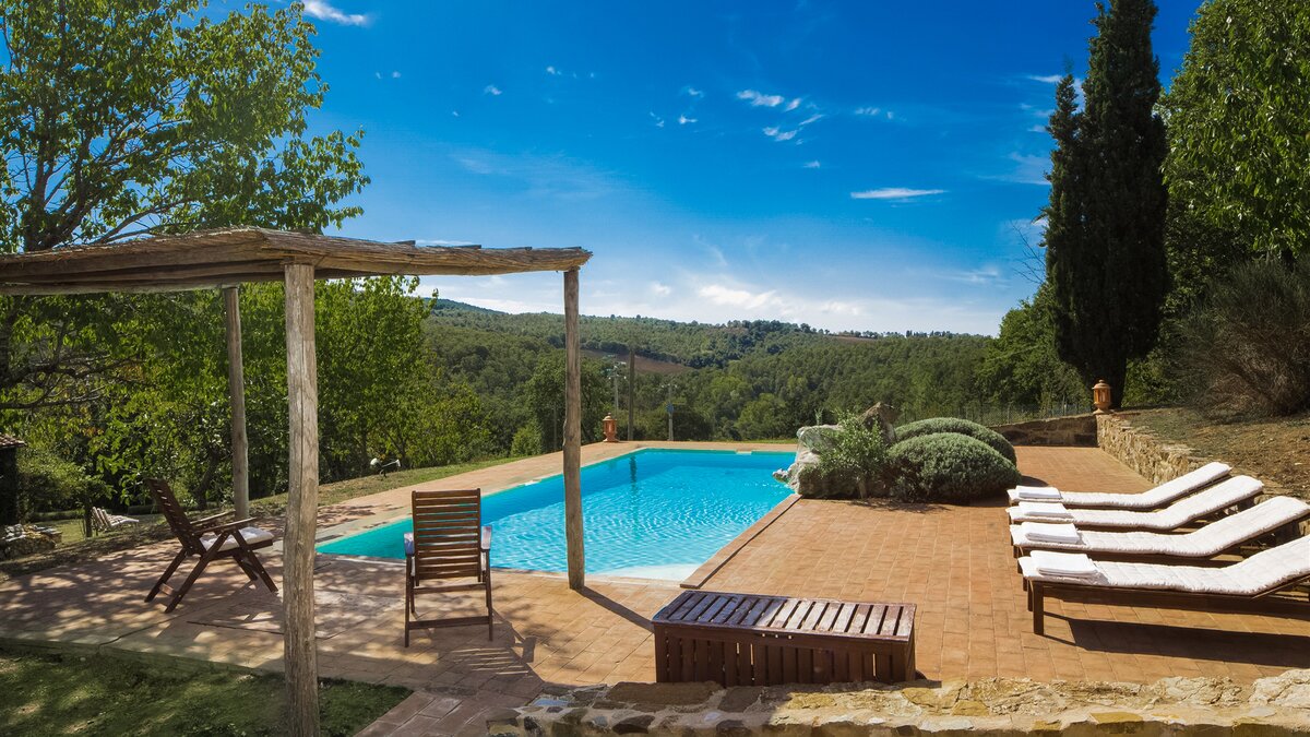 Denna eleganta lantliga villa, bara 5 minuters bilresa från San Casciano dei Bagnis termiska vatten, har stora trädgårdar med uppvärmd pool och vacker utsikt över landsbygden.