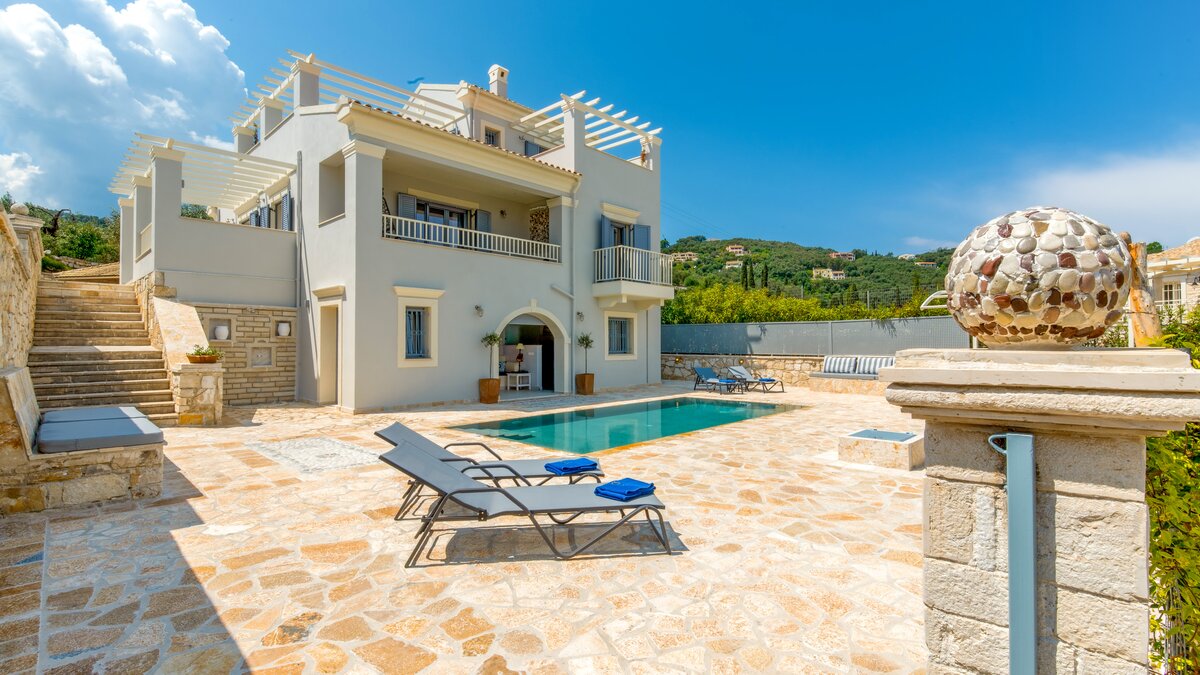 Pythaia har ett utmärkt läge på en sluttning, bara 300 meter från St Stephanos hamn, hjärtat av byn med restauranger, barer och butiker vid vattnet och 400 meter från stranden. St Stephano symboliserar det avslappnade livet på Korfu och Pythaias härliga terrasser erbjuder utsikt över den livliga vattnet i centrum av bylivet. Trots närheten till byn, har Pythaia gott om utrymme utomhus med höjdpunkten är den vackra poolen på den soliga nedre terrassen och intilliggande poolhus med inbyggd sittgrupp och separat TV-rum med Playstation, ett perfekt gömställe för äldre barn. Upp några trappor, terrassen runt huvudbyggnaden har ett utomhus inbyggt frukostbord för 6 platser med utsikt över St Stephano och bakom detta ett sommarkök, inbyggd grill och andra matplats till baksidan av huset. På bottenvåningen i villan finns ett öppet vardagsrum och modernt kök med dörrar som öppnar till sidotrassen med frukostbord och på framsidan en stor balkong med utsikt över havet. Också på bottenvåningen finns ett tvåbäddsrum (kan vara dubbel) med eget duschrum som vetter mot havet och ett tvåbäddsrum med angränsande dusch som vetter mot terrassen. På första våningen finns det stora sovrummet med eget duschrum som öppnar till en privat balkong med fantastisk utsikt över havet. En andra terrass öppnar från första våningen som är tillgänglig för alla gäster att njuta av den fantastiska utsikten. Pythaia är ett modernt boende som är stilfullt inrett i modern stil.