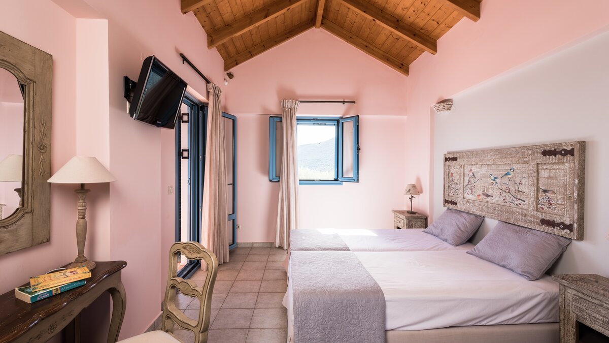 Sapphira’s rural setting is private and peaceful, its garden sprinkled with fruit trees, aromatic herbs and colourful roses; its hillside cloaked in pines and olive groves; and the views from its upper terrace making a magical panorama of small boats, offshore islands and the sparkling sea. The villa itself is furnished with understated elegance, using a colour palette of cool earthy tones, and sourcing natural materials for intriguing art, exposed stonework and innovative shower rooms. On the ground floor, an open-plan kitchen diner is raised a couple of steps above the sitting room, which opens out to a lovely loggia-style terrace, furnished for al fresco dining and lounging, and set beside the swimming pool. One of the three bedrooms also has doors to the poolside, two on the floor above have direct access to the upper terrace, and all are air-conditioned, equipped with the finest linens and individually styled. Conveniently close to amenities, the villa is just 3km from harbour-front cafés in picturesque Sivota, and 7km from Amousso beach.