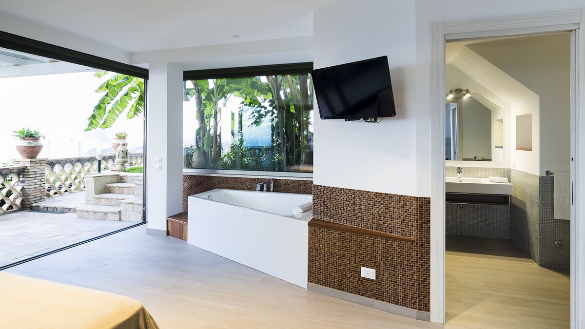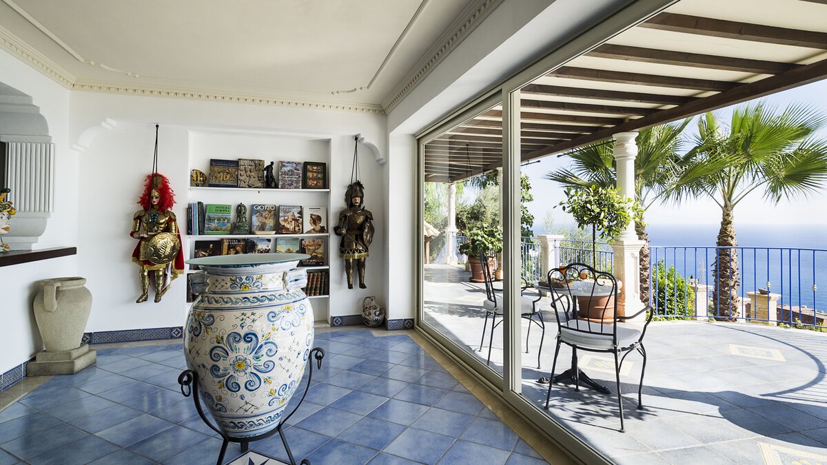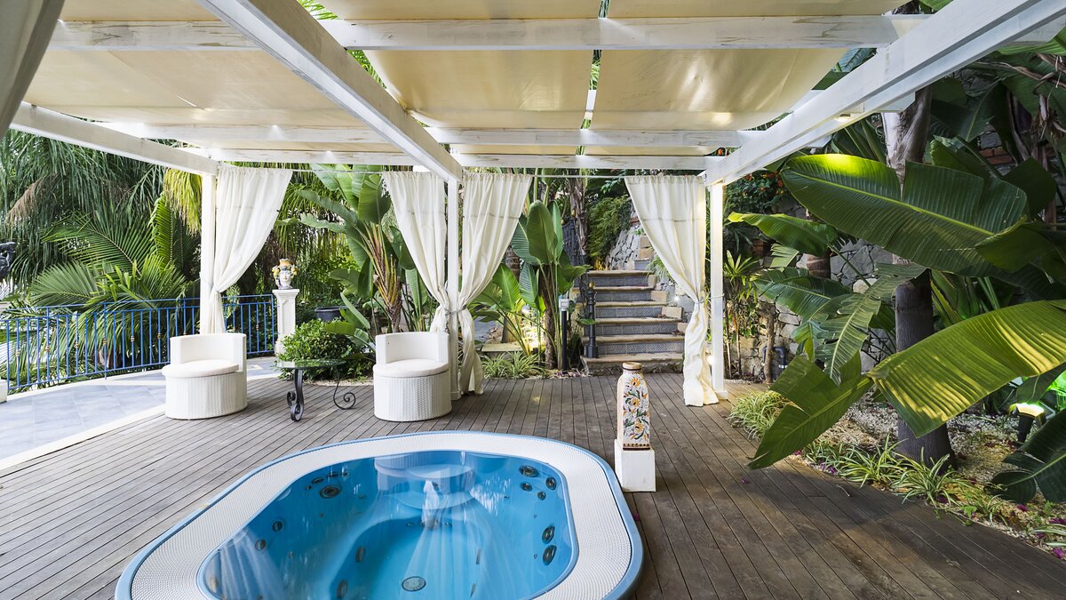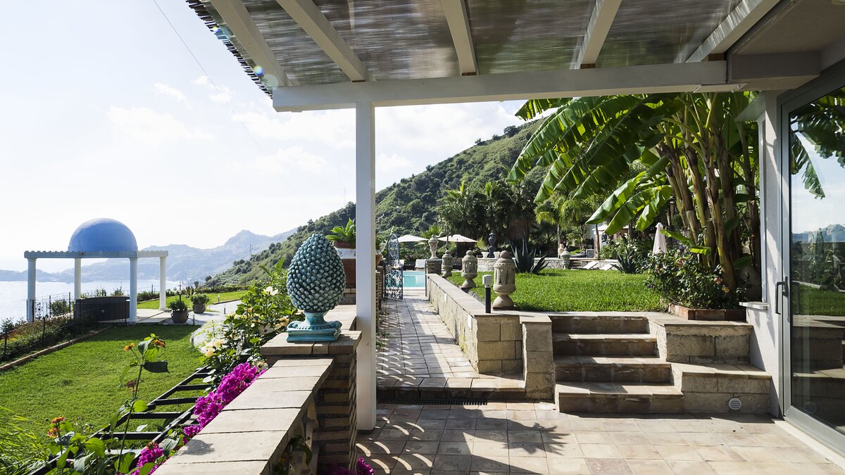 The private infinity pool at Taormina Mare overlooks the stunning east coast of Sicily, and the adjacent lounge area underneath a stone pergola provides the perfect spot to gaze out over the Mediterranean Sea. Set over two floors and an annexe, this wonderful property is furnished in a blend of classic and contemporary styles, with tiled and wooden floors, numerous outdoor areas, large terraces, and floor-to-ceiling glass doors throughout. One of the many great features of Taormina Mare is the covered outdoor Jacuzzi for guests to relax and unwind. The sophisticated yet traditional interiors provide a sense of comfort and luxury.