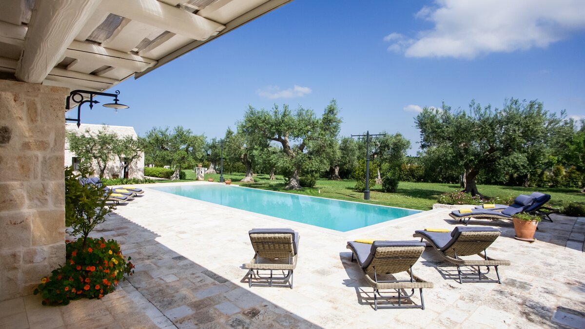 Breda gräsmattor, asfalterade gångar och massor av mogna träd omger detta traditionella Trulli-hus, som framstår som en liten ö av lugn i ett hav av lantlig grönska. Villan hålls naturligt sval av sina tjocka kalkstensväggar och koniska eller fatvalvda tak, och behåller sin rustika karaktär. Så medan 2000-talskomforten inkluderar moderna duschrum, Wi-Fi, smart-TV och moderna köksapparater, är den sympatiska restaureringen förenad med rustika möbler och lokalt tillverkade broderade tyger på elegant enkla sängar i smidesjärn. Villans charmiga vardagsrum är till stor del utformat för lugn i mjuka jordnära toner, och är det livliga undantaget, med ljusröda fåtöljer i skarp relief mot de bleka stenväggarna. Lantköket / matsalen är ett mycket socialt utrymme, som öppnar sig mot en skuggad matsalsterrass; och vart och ett av de tre enkla sovrummen har sitt eget duschrum. Utanför finns en generös infinitypool som betjänas av ett superpoolhus komplett med dusch, matplats med välutrustat pentry och lusthus uteplats med vadderade rottingsoffor. Och villan ligger bara 5 km från bekvämligheter i Alberobello, och en 15 km bilresa från en sandstrand.