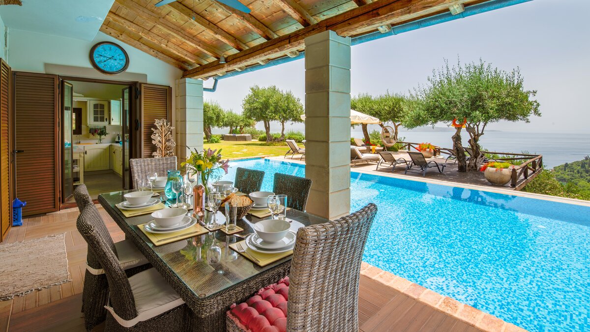 Denna moderna och exceptionellt eleganta villa med stor pool har den mest fantastiska öppna utsikten ner till den glittrande nordöstra kusten av Korfu. På bottenvåningen finns ett stort lantkök, och mycket bekvämt vardagsrum med öppen planlösning med matplats och öppen spis. Också på denna nivå finns det vackert dekorerade sovrummet, som öppnar ut mot trädgården och med ett eget badrum som har en duschkabin. Köket och vardagsrummet vetter mot den möblerade poolterrassen och fastighetens enastående funktion, den otroligt imponerande privata infinitypoolen. Tjugo meter lång, sveper den runt terrassen, varifrån du kan glida rakt ner i det glittrande vattnet. Den intilliggande terrassen med sittplatser är en idealisk plats att koppla av med en drink medan du njuter av panoramautsikten över havet.