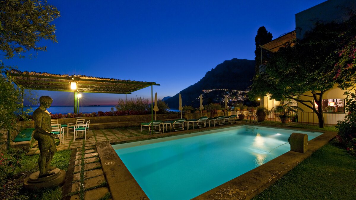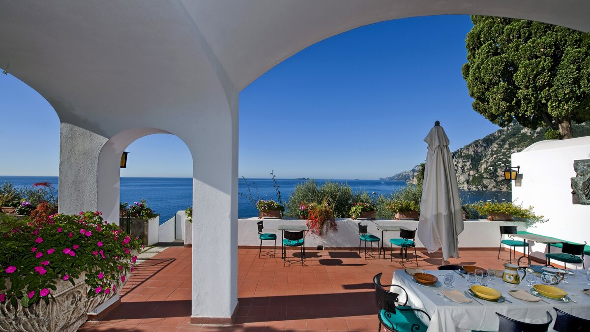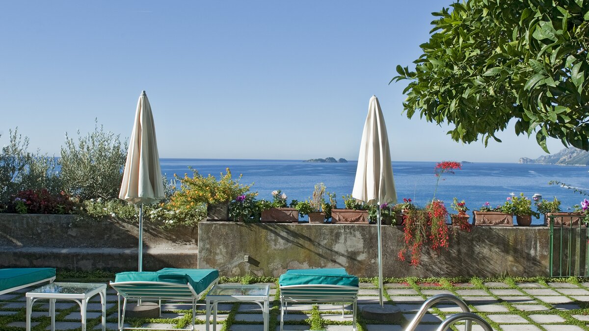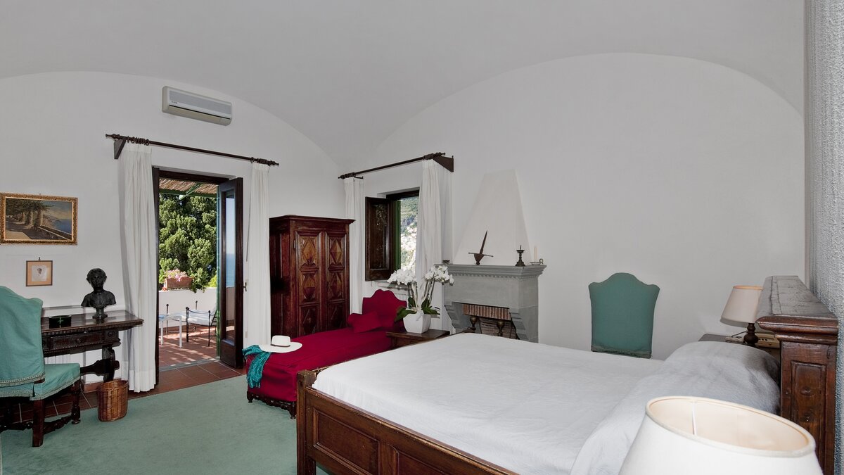 The perfect place to live the Mediterranean lifestyle, this much loved house is welcoming, charming and uncontrived. With rich wood furniture, arched ceilings and old stone fireplaces, the character of the house is enhanced with antique pieces, fine paintings and statuary. On the ground floor a spacious sitting room opens out to the sea view terrace, and leads through to a beautifully naïve dining room in fresh white and forest green, an airy venue for superb meals prepared by the cook. One of the twin bedrooms is also on this level, while two double rooms share the floor above, each with French doors to the upper balcony, and the fourth guest room is privately separate in an annexe accessed from the terrace. This glorious outdoor area is the natural focus of the villa. Sprinkled with lemon trees and bedecked with bougainvillea, it encompasses a swimming pool and al fresco dining area, and looks out to fabulous panoramas of the town and bay. Arienzo Beach is about a hundred steps down below the villa, with bars, sunbeds and water taxis to Positano, a twenty minute walk away.