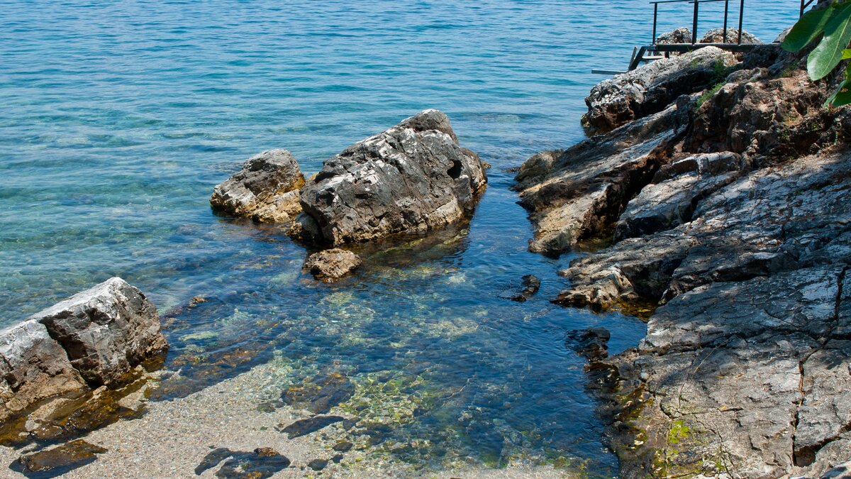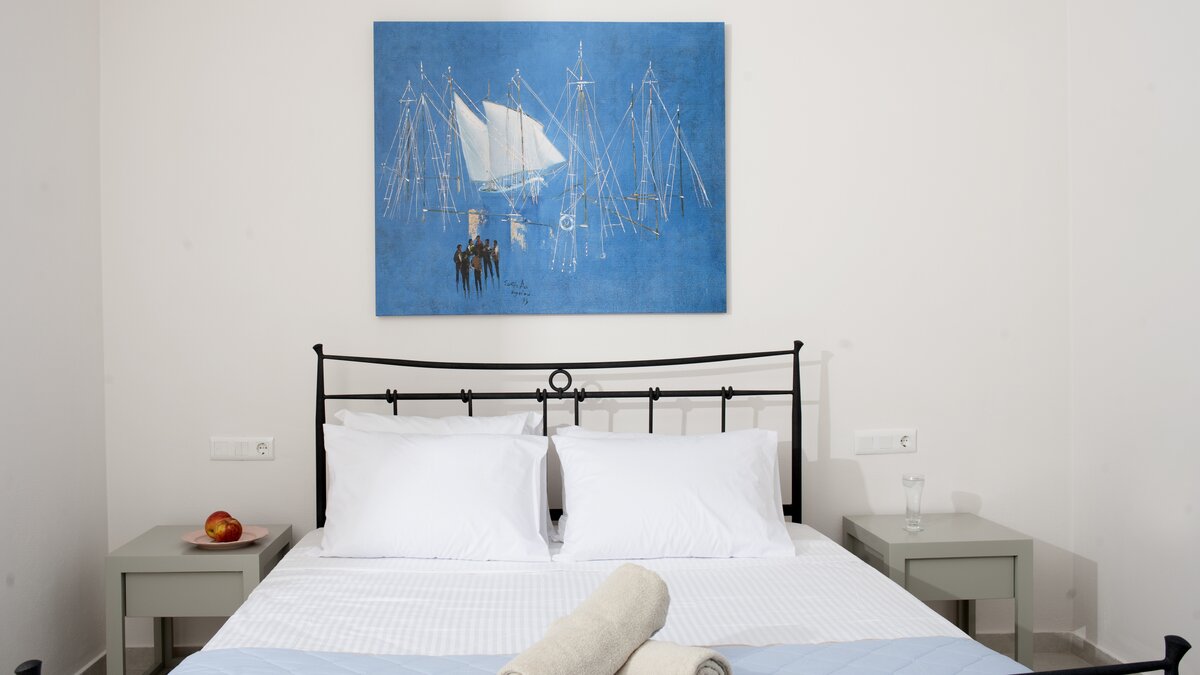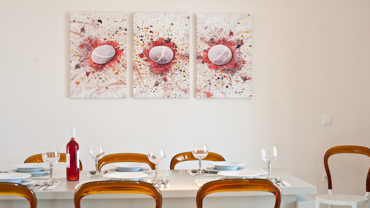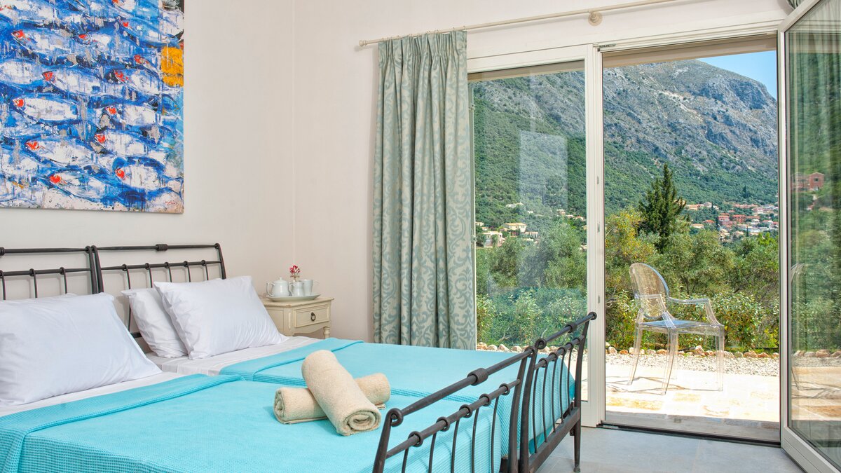 Modern, airy and arty, Villa Barbati is a three storey villa, tiered into the hillside, with bay views from every room. With crisp white décor highlighting bright and bold artworks, the villa’s entry is at the middle level, where a sleek and well equipped kitchen is open plan to the dining area and chic sitting room, and opens out directly to the poolside terrace. One of the en suite bedrooms shares this upper ground level, while two on the floor below have doors to the garden; and the spacious master suite crowns the house, romantically styled in pale pastel shades, with a shower and free-standing egg-shaped bath, and a furnished balcony facing the fabulous views. All four are stylishly uncluttered, air-conditioned and equipped with TV, and WiFi is available throughout the house.
