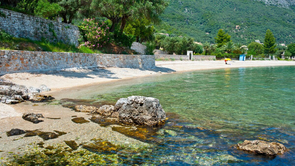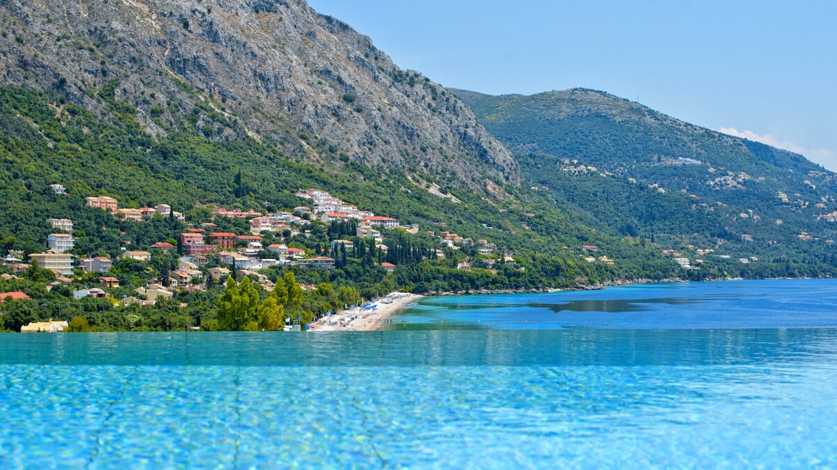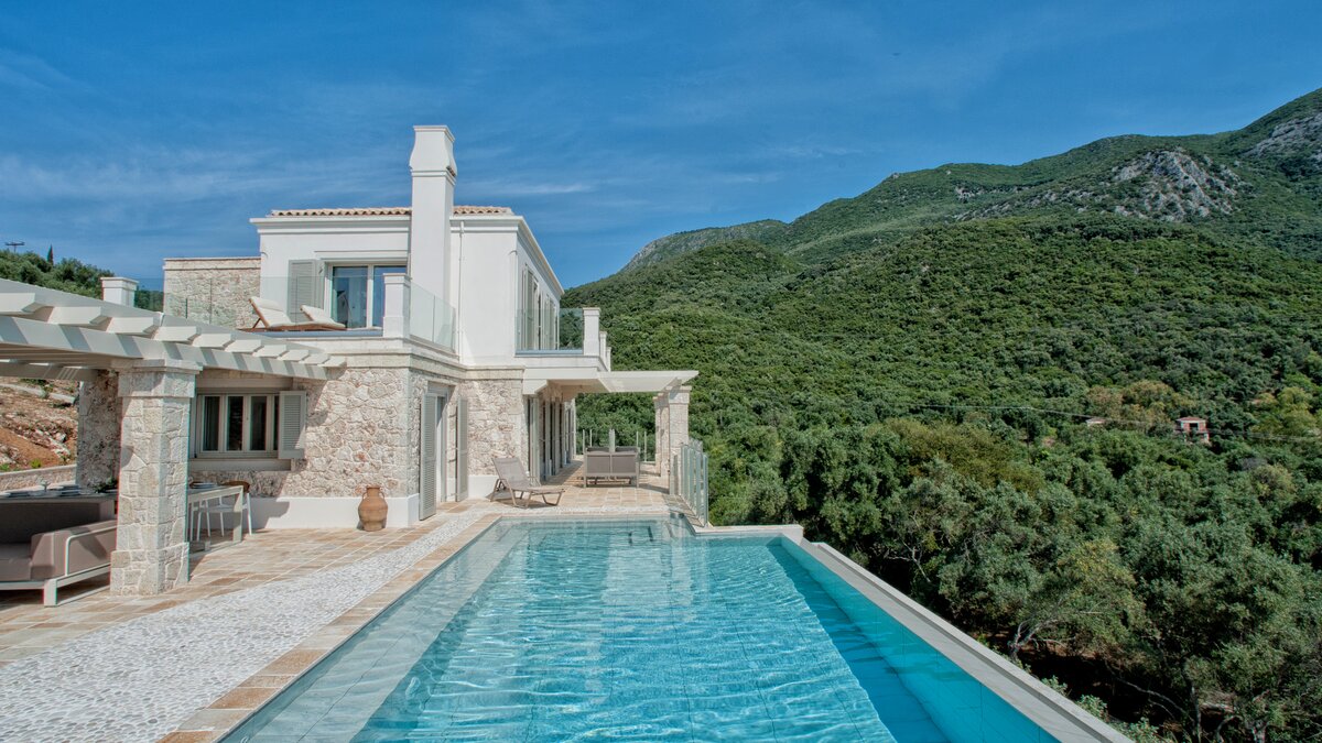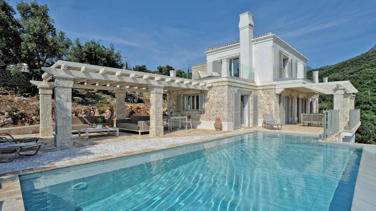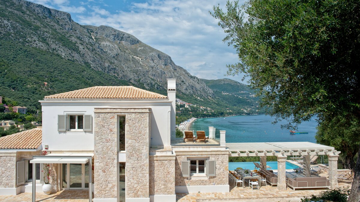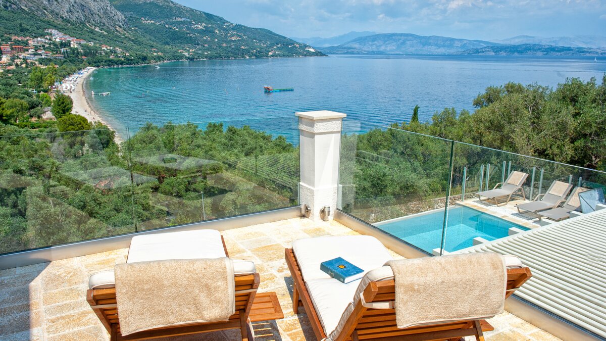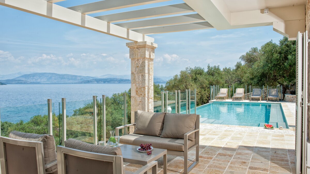 Looking out to the sea and shore from its stylish poolside gazebo, this is a very contemporary luxury villa in Corfu, with an air of peace and privacy, and a footpath straight to the water’s edge.